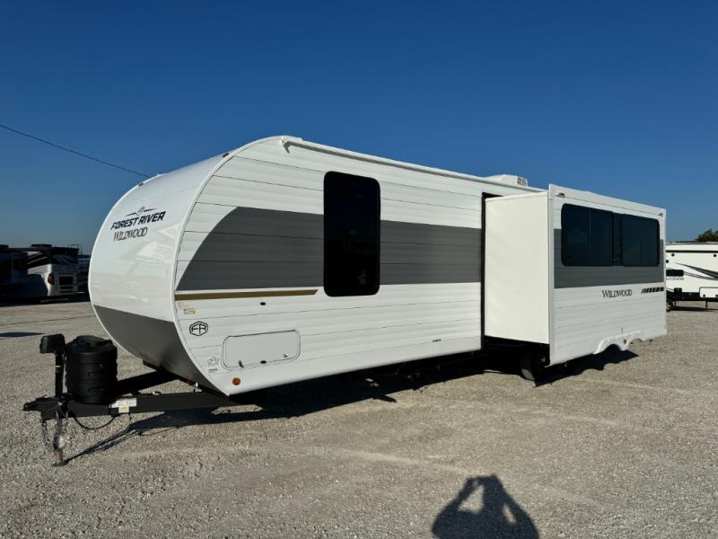 Enjoy years and years of memories with any one of these Forest River Wildwood travel trailers! They are built with a Dicor PVC roof membrane, a powder coated I-beam frame, and an aerodynamic front radius profile for an easier tow. The triple seal slide out system prevents water from seeping inside and keeps it outside where it belongs. The Best In Class Value Package includes upgraded designer furniture, seamless countertops with no T-mold, and two zone residential soundbars with FM, Bluetooth, HDMI and USB. You will also appreciate the heated and enclosed Accessi-Belly with removable underbelly panels, the power tongue jack with an LED light, and the designated CPAP storage. Some new upgraded features include: an upgraded slide-out fascia, a Versa-Tilt bed, an upgraded shower head, and a 60K BTU tankless water heater, and so much more!