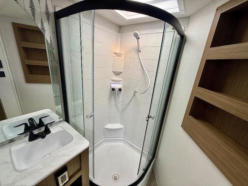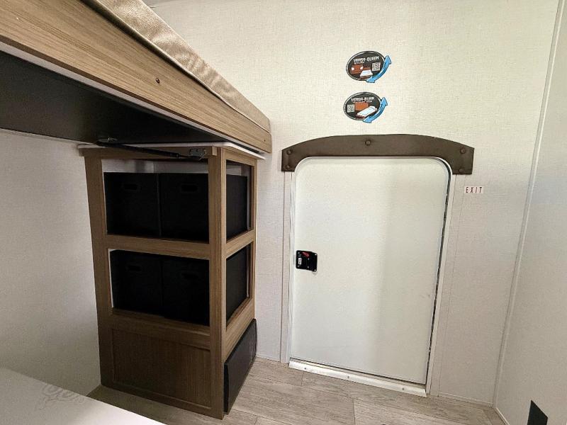 When you're ready to upgrade your RV to a unit with more sleeping space and comfort, choose this Wildwood travel trailer, and you'll never look back. After setting up camp, put out the large slide and prepare lunch indoors or outside at the exterior camp kitchen, and the 18' power awning will shade you from the sun. The kids will find all their snacks in the walk-in pantry, and they can grab a cold drink from the refrigerator. The Versa-Lounge and Versa Flex table offer plenty of seating, dining, and sleeping space. This model features a rear private bunkhouse with a Versa queen bed and two Versa bunks, and you will love the front private bedroom that includes a custom king bed with Versa-Tilt and dual bedside closets.