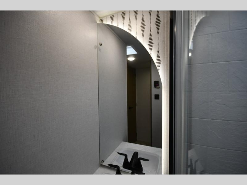 The spacious full bathroom includes a walk-in shower, vanity with sink, mirrored medicine cabinet, and foot-flush toilet. With thoughtful layout and storage, you’ll enjoy the convenience of a private bath wherever you travel.