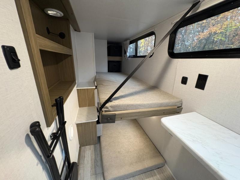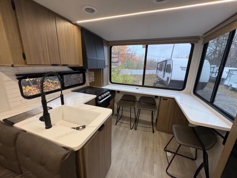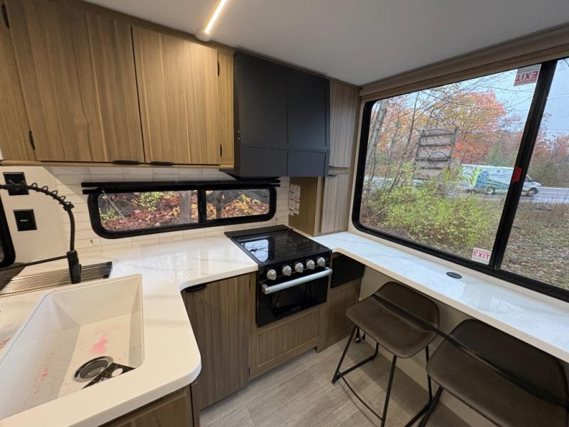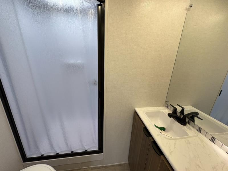 Your family of four to five will enjoy this Wildwood View bunk model. The large Slide features a refrigerator, pantry, and entertainment center with a door leading to a bunk space including a 30" x 70" flip-up bunk with a mattress pad below, storage cubbies for your things, and a desk with bar stool. The rear kitchen area offers wrap-around counterspace with four bar stools, and there is an exterior camp kitchen if the weather is nice and you want to cook outside! A walk-in shower will let you freshen up each day, and the Versa-Tile custom king bed in the front private bedroom is sure to bring a great night's rest. There is also a closet and overhead storage plus a wardrobe with washer/dryer prep option.