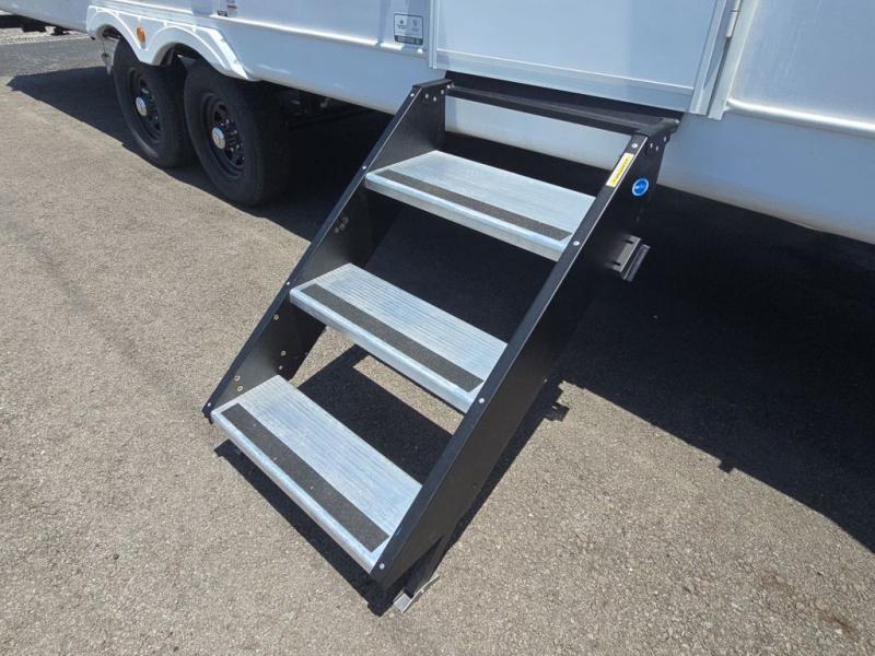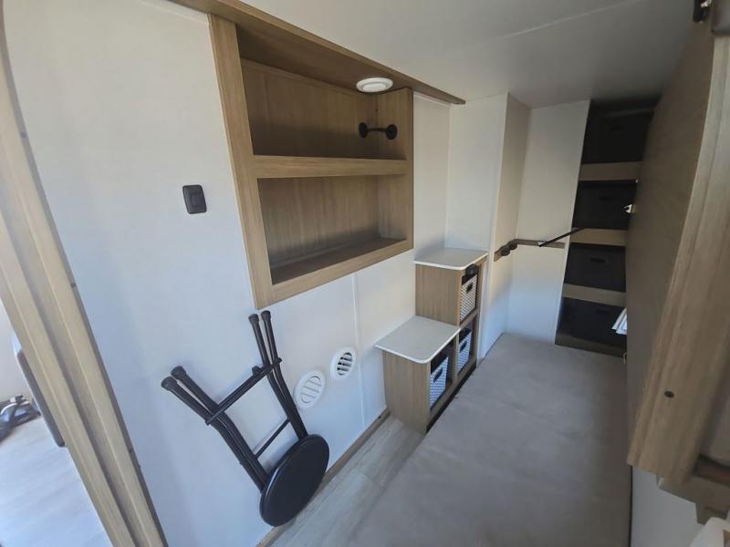 Your family of four to five will enjoy this Wildwood View bunk model. The large Slide features a refrigerator, pantry, and entertainment center with a door leading to a bunk space including a 30" x 70" flip-up bunk with a mattress pad below, storage cubbies for your things, and a desk with bar stool. The rear kitchen area offers wrap-around counterspace with four bar stools, and there is an exterior camp kitchen if the weather is nice and you want to cook outside! A walk-in shower will let you freshen up each day, and the Versa-Tile custom king bed in the front private bedroom is sure to bring a great night's rest. There is also a closet and overhead storage plus a wardrobe with washer/dryer prep option.