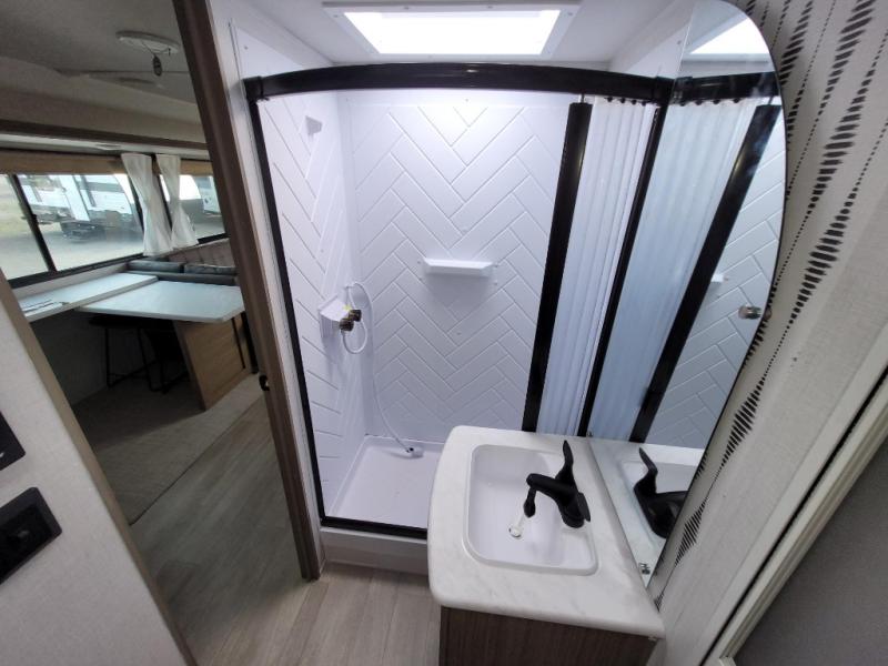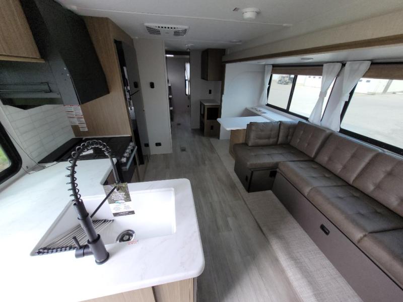 Get ready for your next weekend getaway to your local state park with this double-slide Wildwood travel trailer. The private bunkhouse is perfect for the kids, and you can enjoy the front private bedroom with a custom king bed with Versa-Tilt. This unit also includes a Versa Lounge and Versa Flex table for relaxing, dining, and sleeping. The double-bowl sink is perfect for cleaning up afterward, and you'll love how convenient the full bath is with its own exterior entry door.