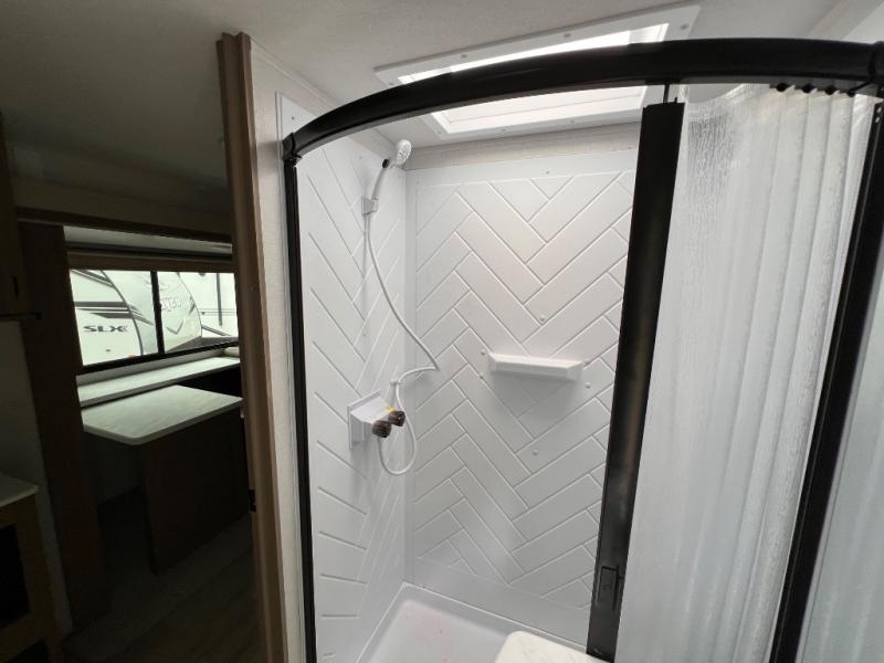 Get ready for your next weekend getaway to your local state park with this double-slide Wildwood travel trailer. The private bunkhouse is perfect for the kids, and you can enjoy the front private bedroom with a custom king bed with Versa-Tilt. This unit also includes a Versa Lounge and Versa Flex table for relaxing, dining, and sleeping. The double-bowl sink is perfect for cleaning up afterward, and you'll love how convenient the full bath is with its own exterior entry door.