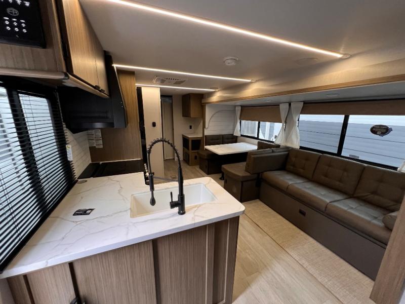Get ready for your next weekend getaway to your local state park with this double-slide Wildwood travel trailer. The private bunkhouse is perfect for the kids, and you can enjoy the front private bedroom with a custom king bed with Versa-Tilt. This unit also includes a Versa Lounge and Versa Flex table for relaxing, dining, and sleeping. The double-bowl sink is perfect for cleaning up afterward, and you'll love how convenient the full bath is with its own exterior entry door.