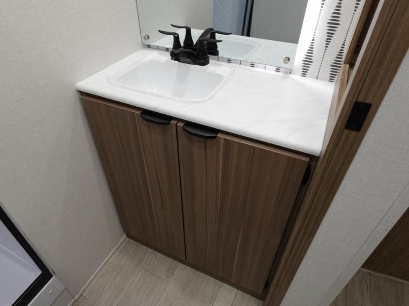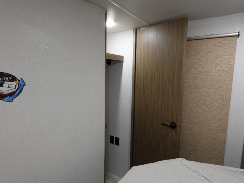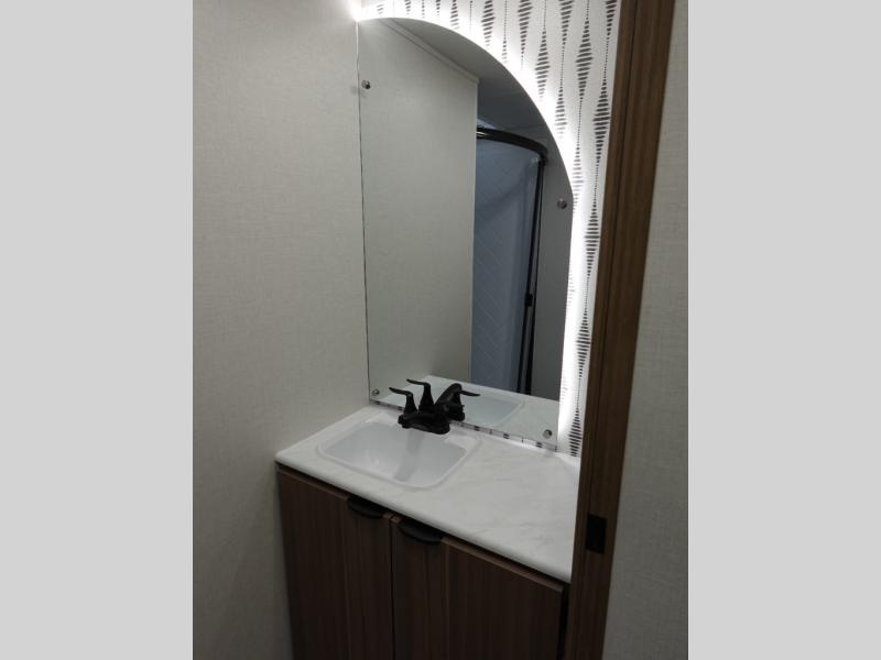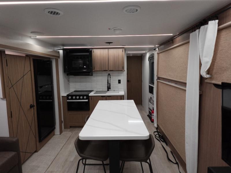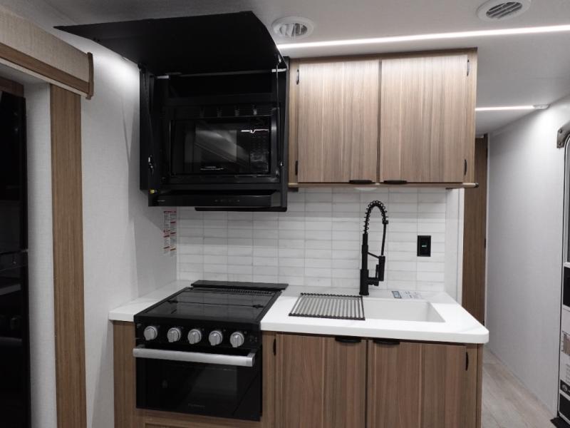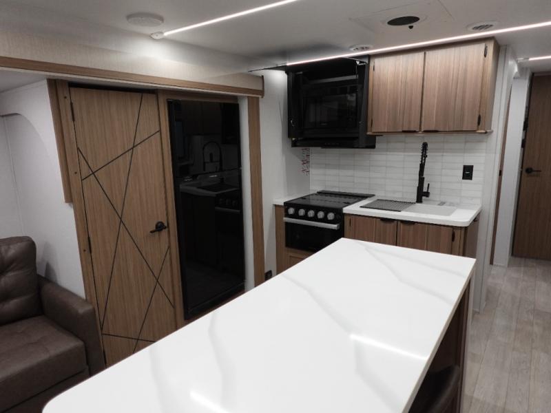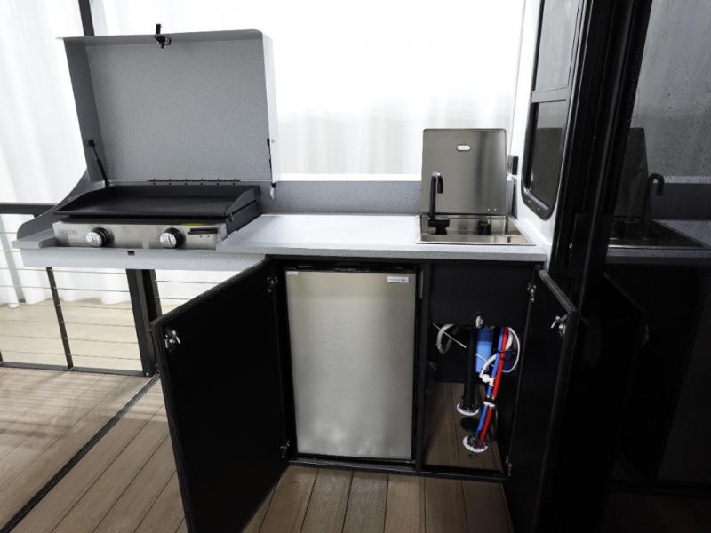 This travel trailer will feel more like home with its rear veranda/porch, dual entry doors, and front private bedroom! There is an outdoor kitchen on the back porch so you can make lunch in the fresh air, and the patio doors lead right into the main living area. Your crew can relax on the L-shaped sofa across from the fireplace, which will make your space more cozy. A kitchen island with four chairs will provide a place to dine at, and there is a spacious pantry and refrigerator for food storage. You will love having your own space in the private bedroom, and the Versa-Tilt custom king bed will let you sit up in bed to read your book at night.