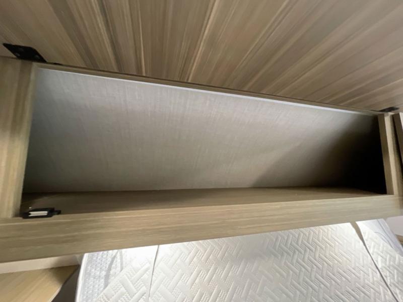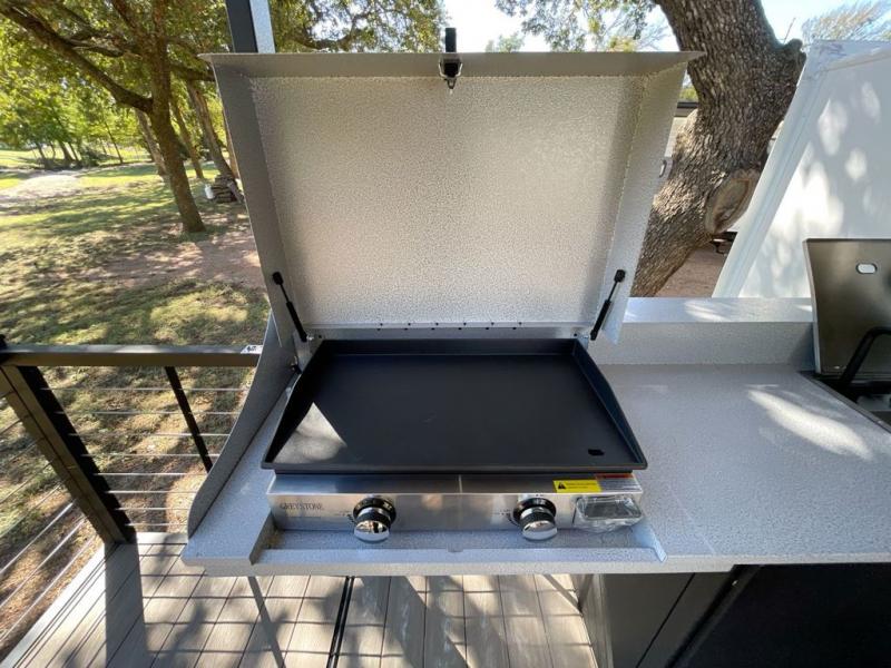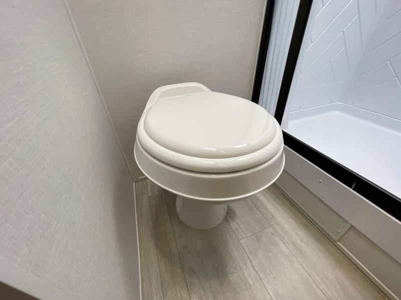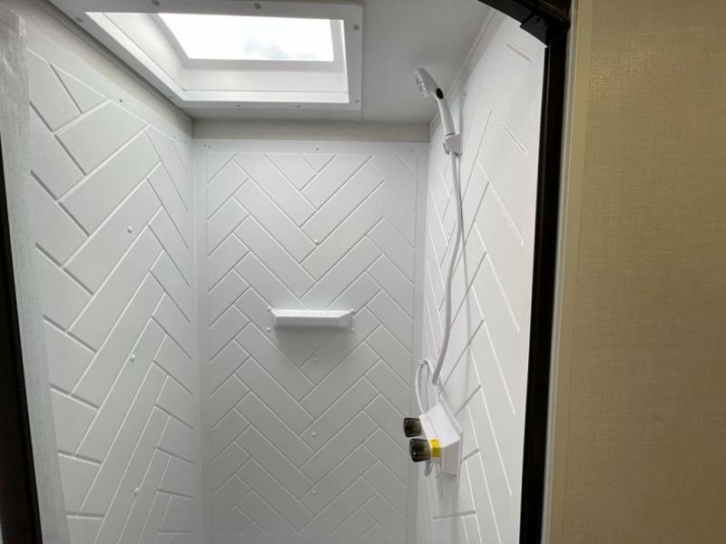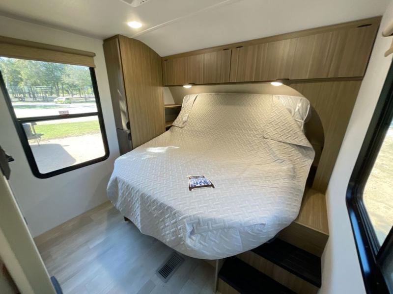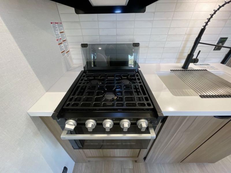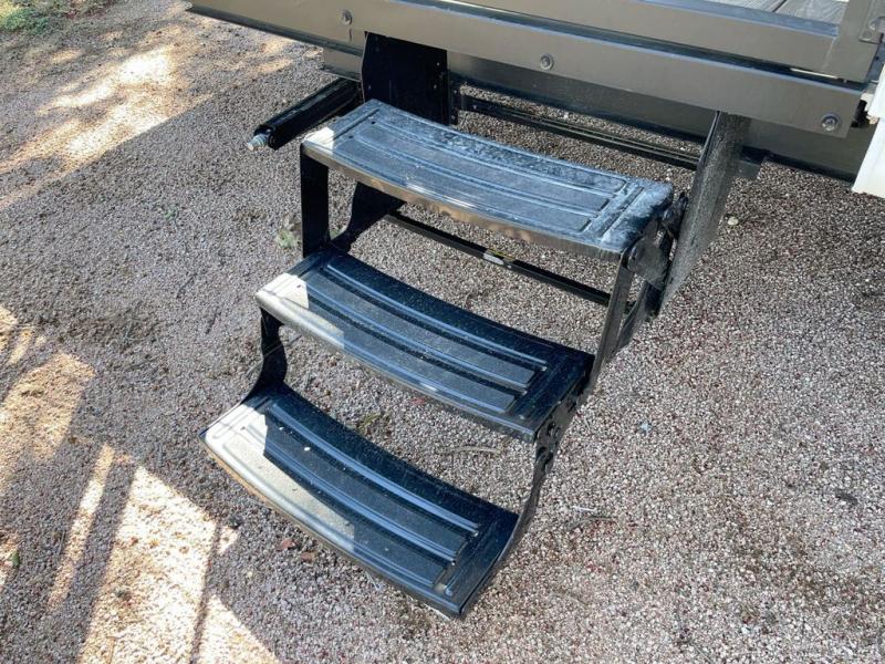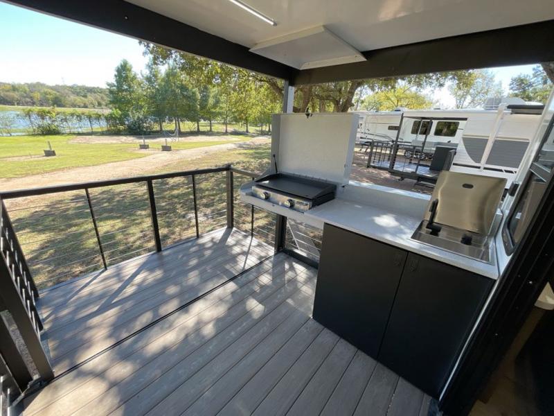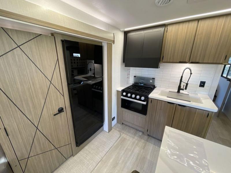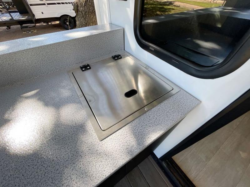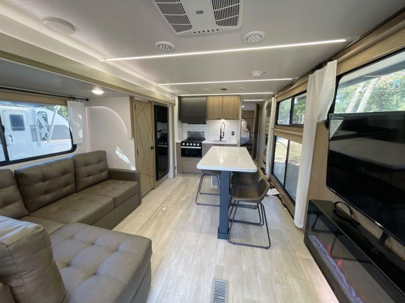 This travel trailer will feel more like home with its rear veranda/porch, dual entry doors, and front private bedroom! There is an outdoor kitchen on the back porch so you can make lunch in the fresh air, and the patio doors lead right into the main living area. Your crew can relax on the L-shaped sofa across from the fireplace, which will make your space more cozy. A kitchen island with four chairs will provide a place to dine at, and there is a spacious pantry and refrigerator for food storage. You will love having your own space in the private bedroom, and the Versa-Tilt custom king bed will let you sit up in bed to read your book at night.