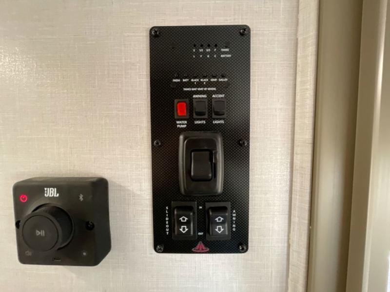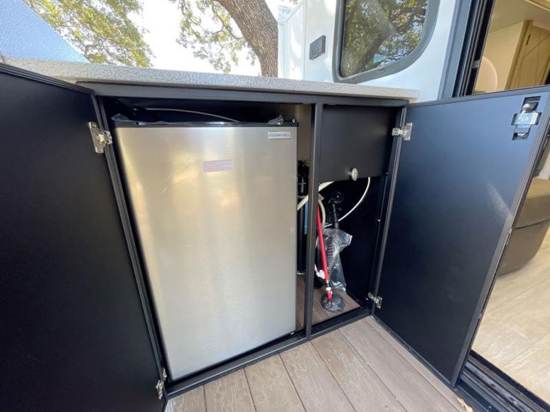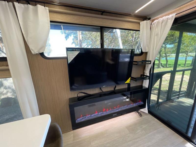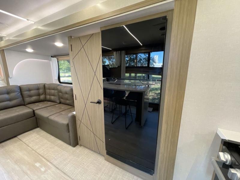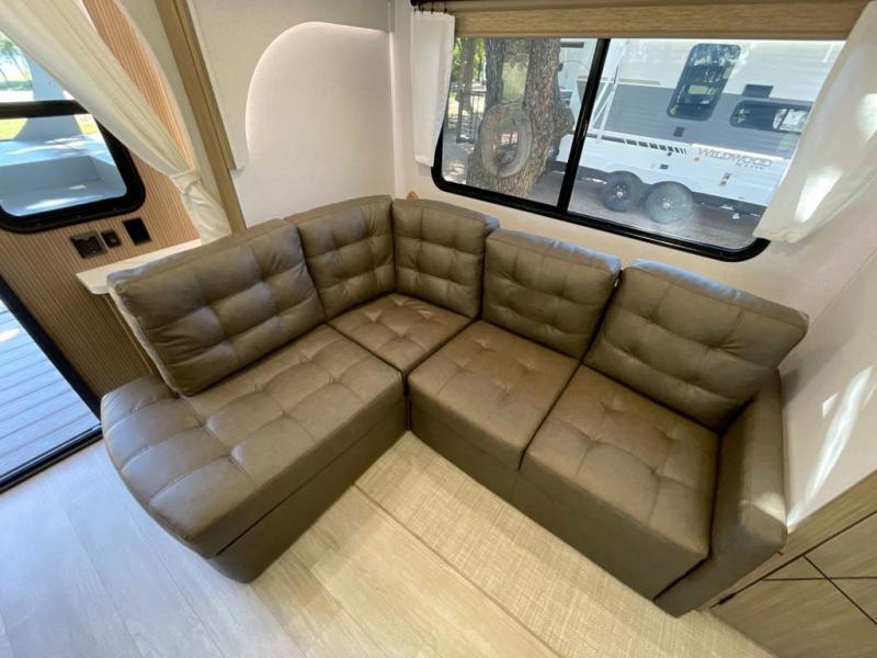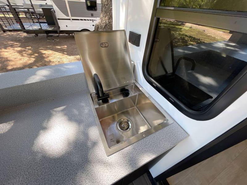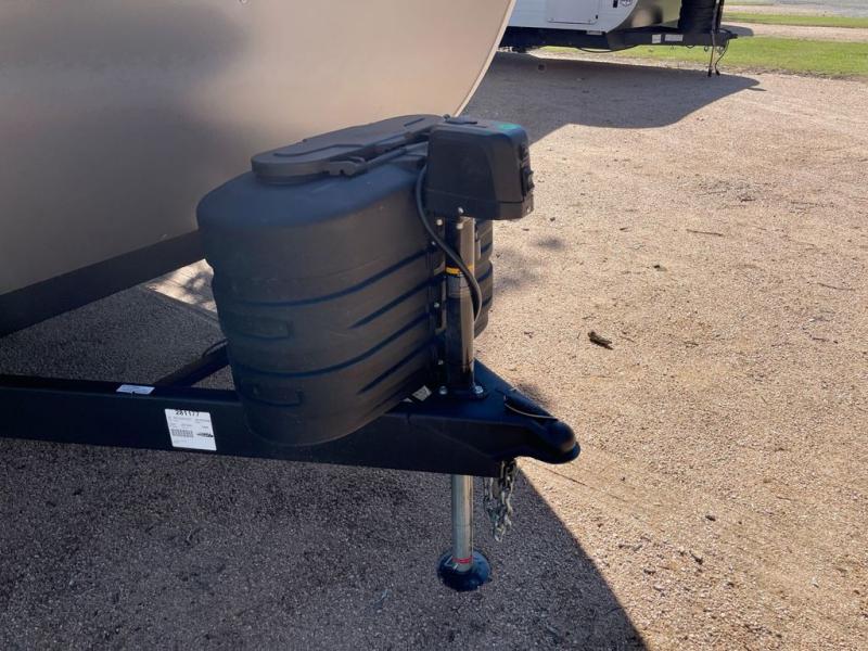 This travel trailer will feel more like home with its rear veranda/porch, dual entry doors, and front private bedroom! There is an outdoor kitchen on the back porch so you can make lunch in the fresh air, and the patio doors lead right into the main living area. Your crew can relax on the L-shaped sofa across from the fireplace, which will make your space more cozy. A kitchen island with four chairs will provide a place to dine at, and there is a spacious pantry and refrigerator for food storage. You will love having your own space in the private bedroom, and the Versa-Tilt custom king bed will let you sit up in bed to read your book at night.