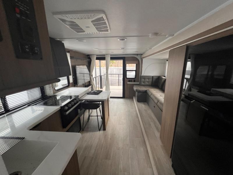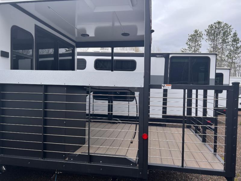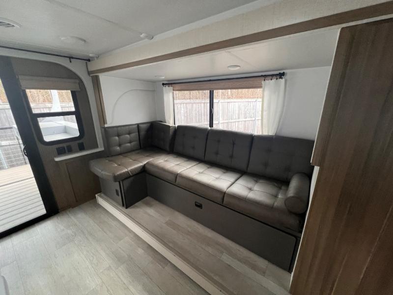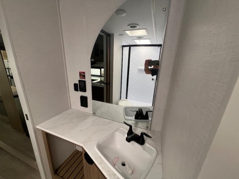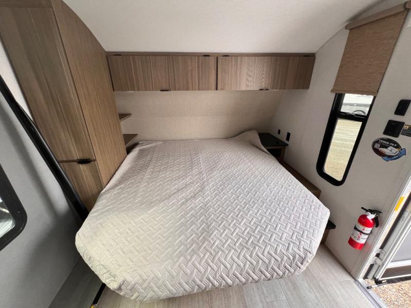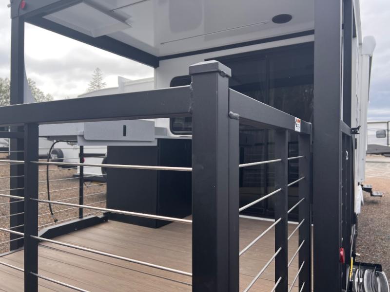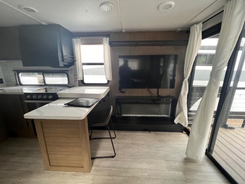 This travel trailer will feel more like home with its rear veranda/porch, dual entry doors, and front private bedroom! There is an outdoor kitchen on the back porch so you can make lunch in the fresh air, and the patio doors lead right into the main living area. Your crew can relax on the L-shaped sofa across from the fireplace, which will make your space more cozy. A kitchen island with four chairs will provide a place to dine at, and there is a spacious pantry and refrigerator for food storage. You will love having your own space in the private bedroom, and the Versa-Tilt custom king bed will let you sit up in bed to read your book at night.