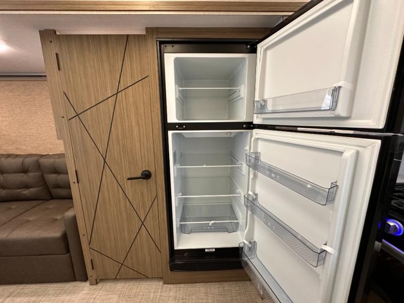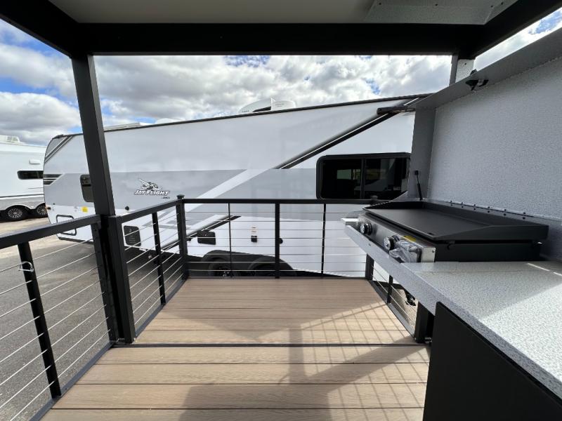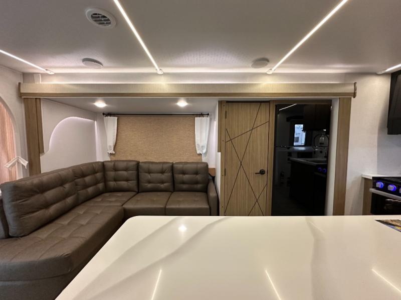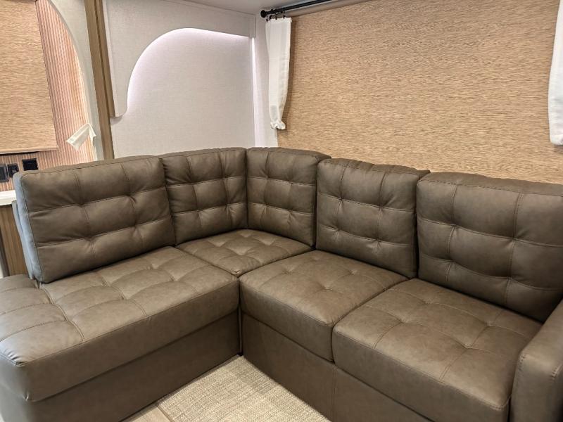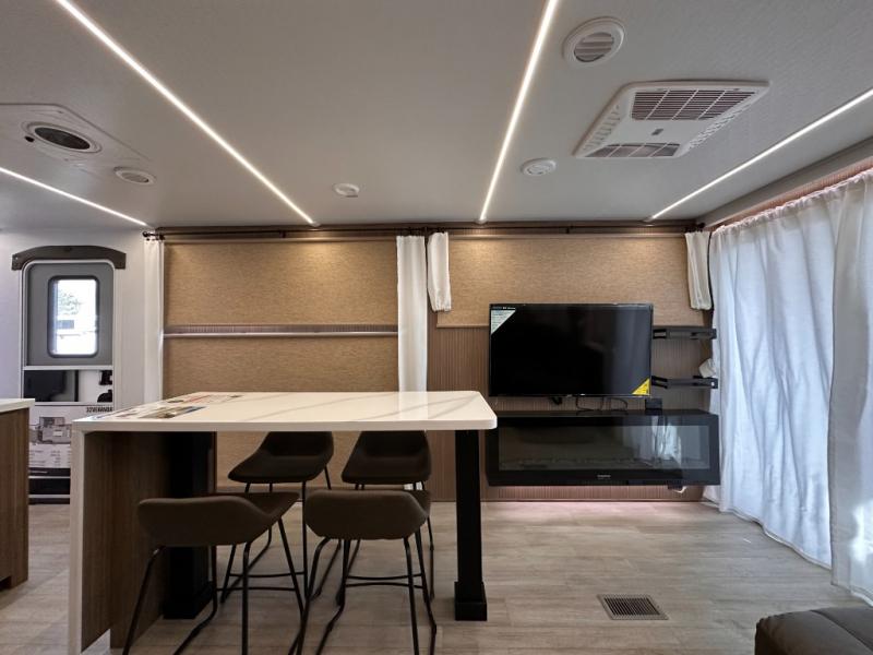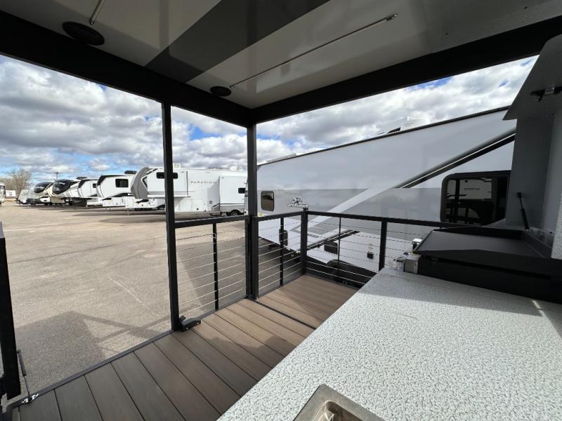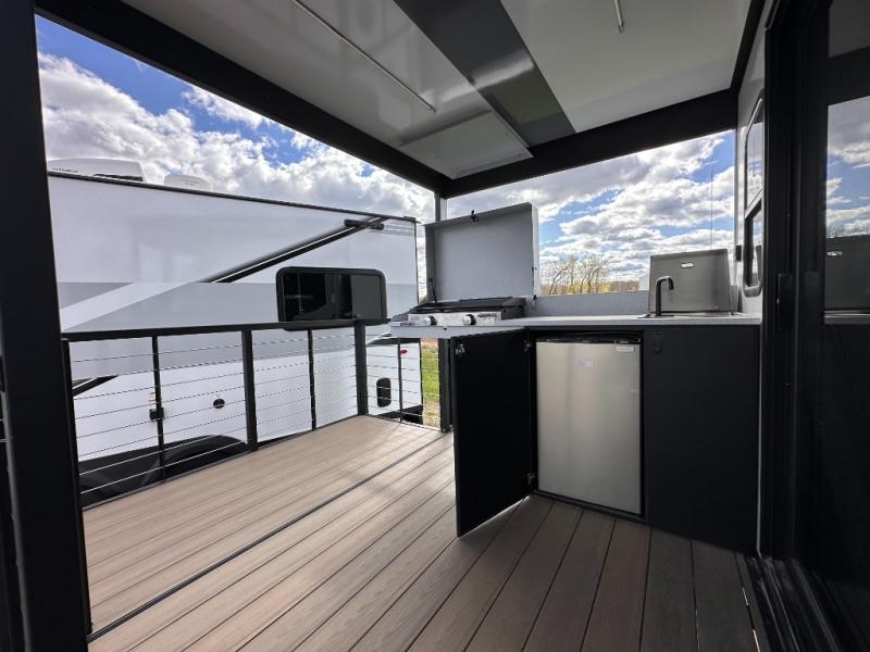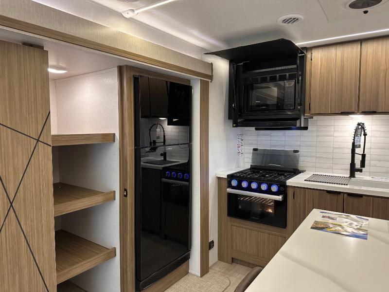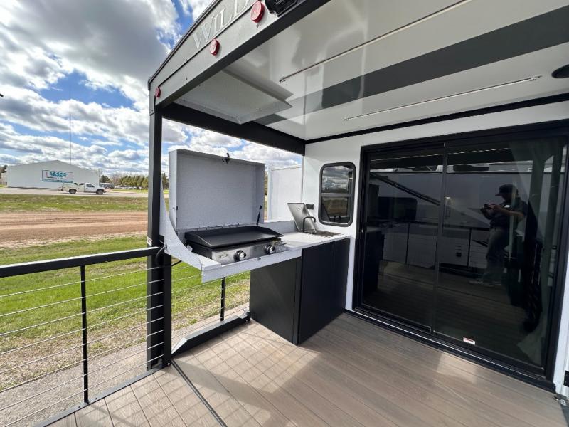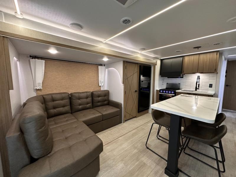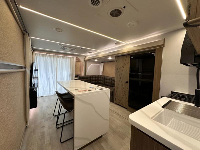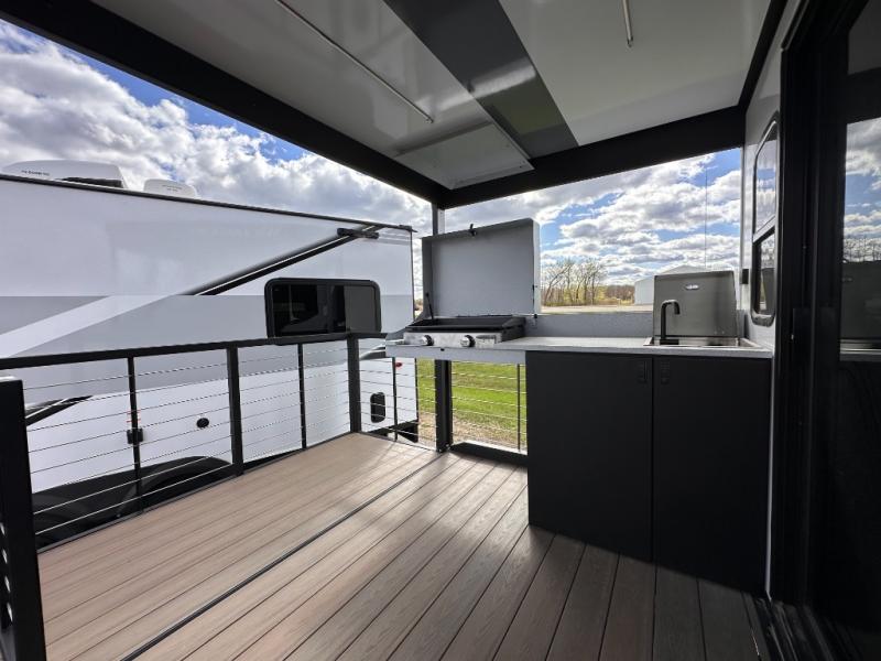 This travel trailer will feel more like home with its rear veranda/porch, dual entry doors, and front private bedroom! There is an outdoor kitchen on the back porch so you can make lunch in the fresh air, and the patio doors lead right into the main living area. Your crew can relax on the L-shaped sofa across from the fireplace, which will make your space more cozy. A kitchen island with four chairs will provide a place to dine at, and there is a spacious pantry and refrigerator for food storage. You will love having your own space in the private bedroom, and the Versa-Tilt custom king bed will let you sit up in bed to read your book at night.