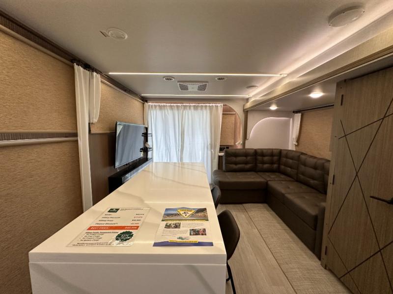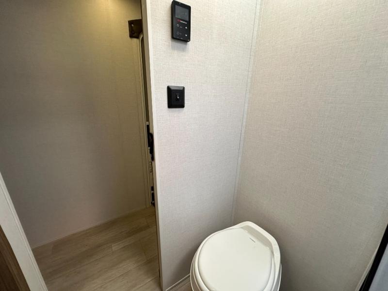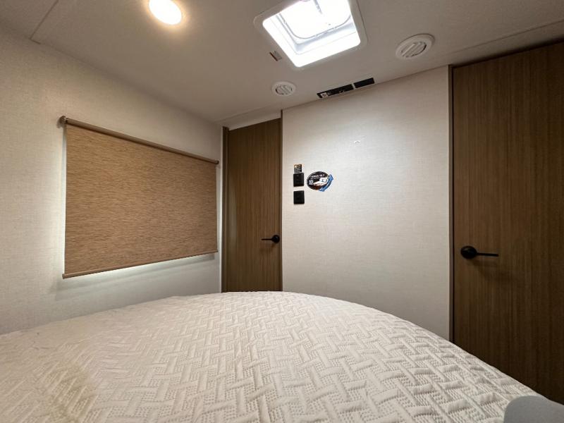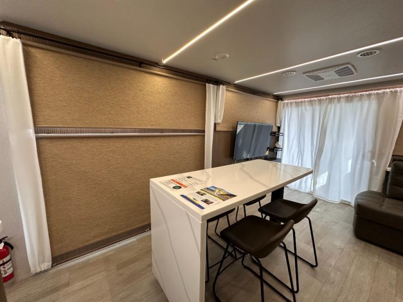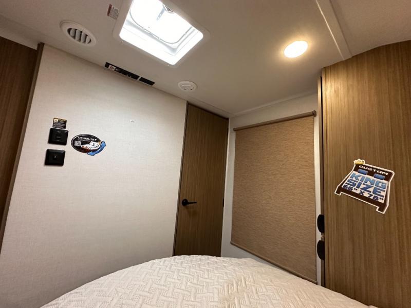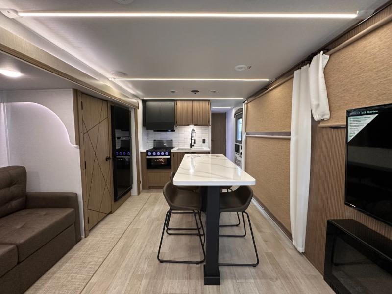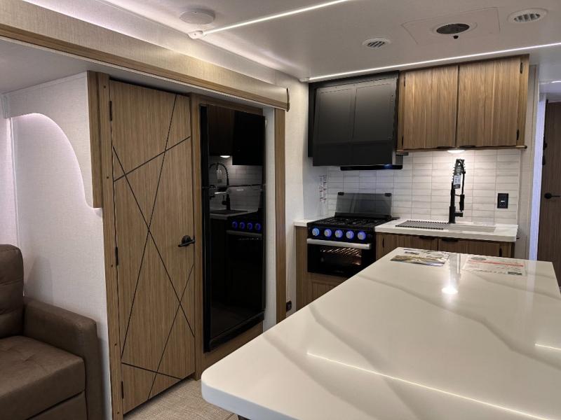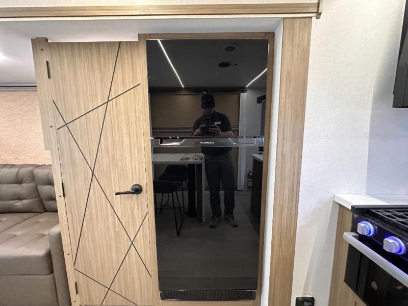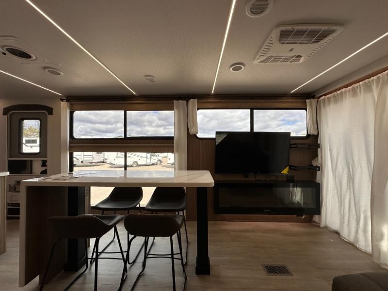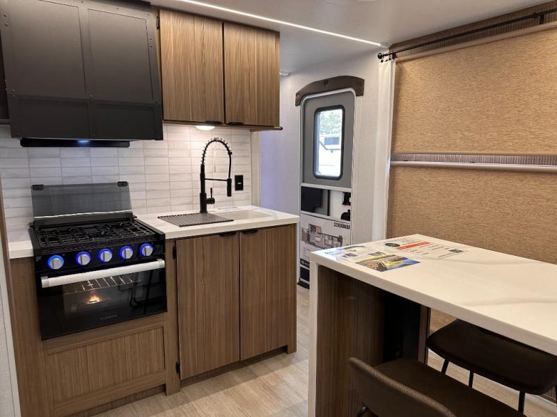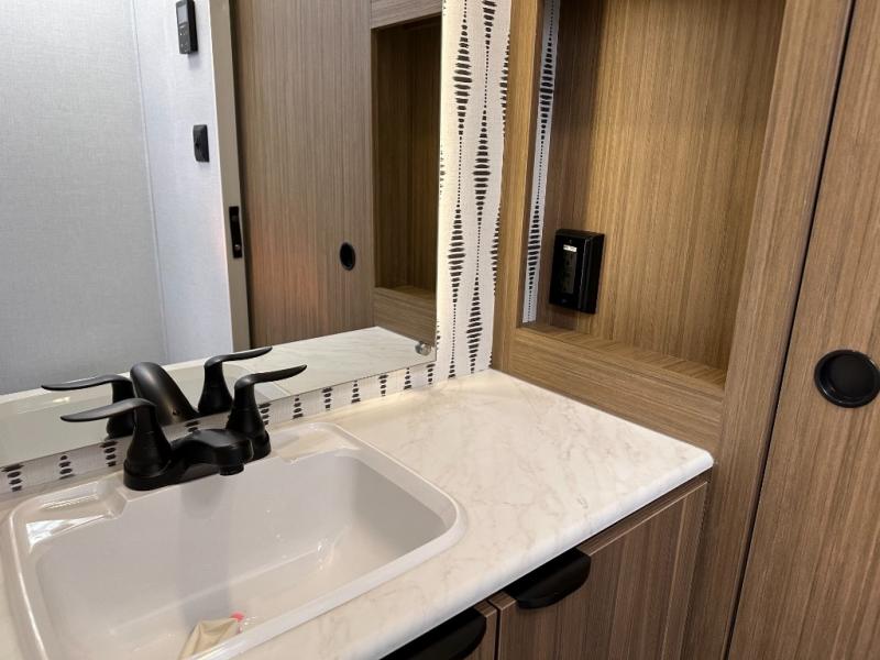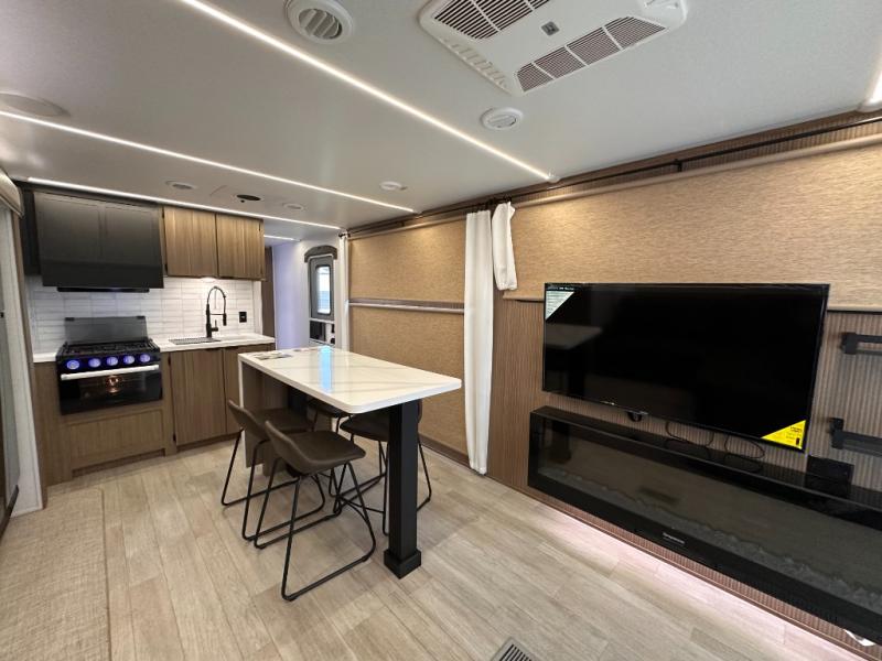This travel trailer will feel more like home with its rear veranda/porch, dual entry doors, and front private bedroom! There is an outdoor kitchen on the back porch so you can make lunch in the fresh air, and the patio doors lead right into the main living area. Your crew can relax on the L-shaped sofa across from the fireplace, which will make your space more cozy. A kitchen island with four chairs will provide a place to dine at, and there is a spacious pantry and refrigerator for food storage. You will love having your own space in the private bedroom, and the Versa-Tilt custom king bed will let you sit up in bed to read your book at night.