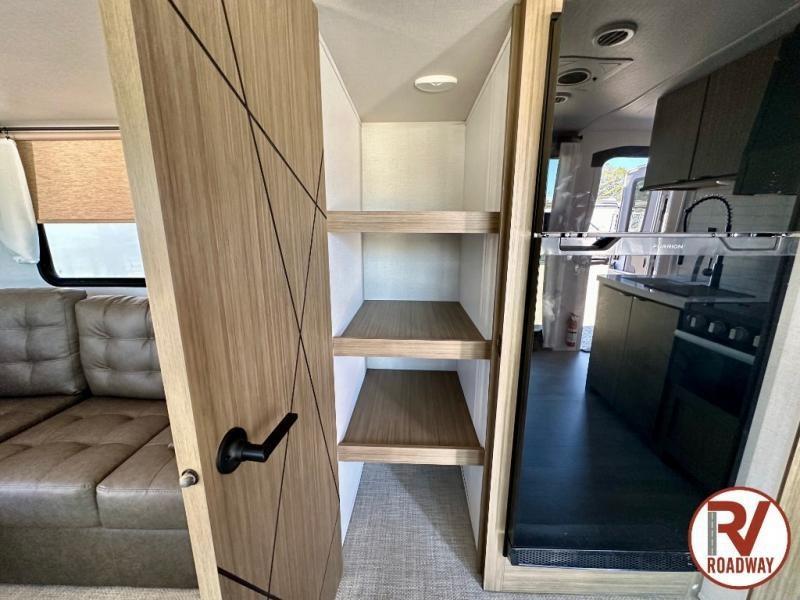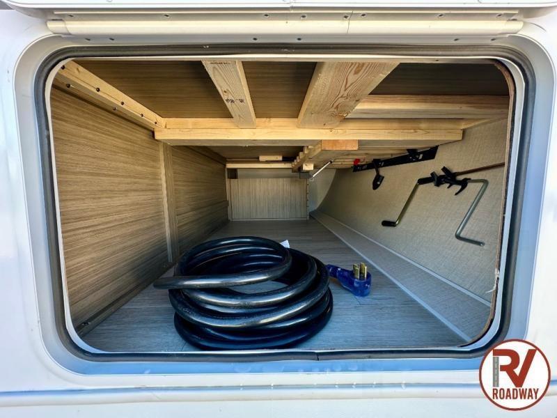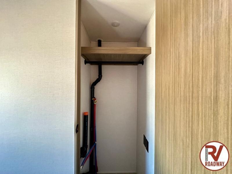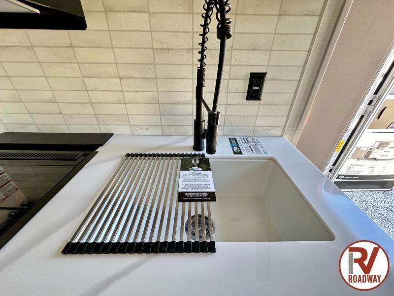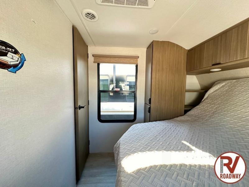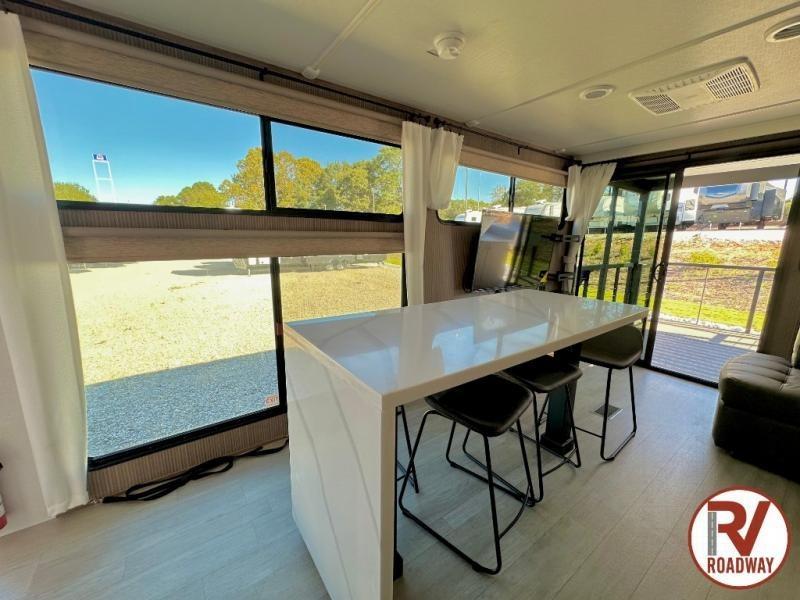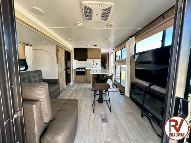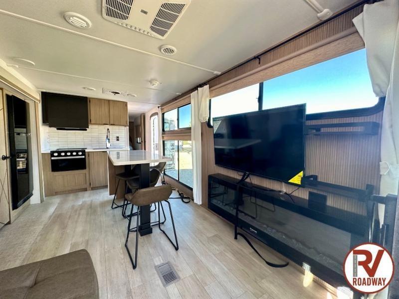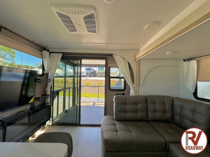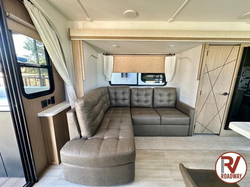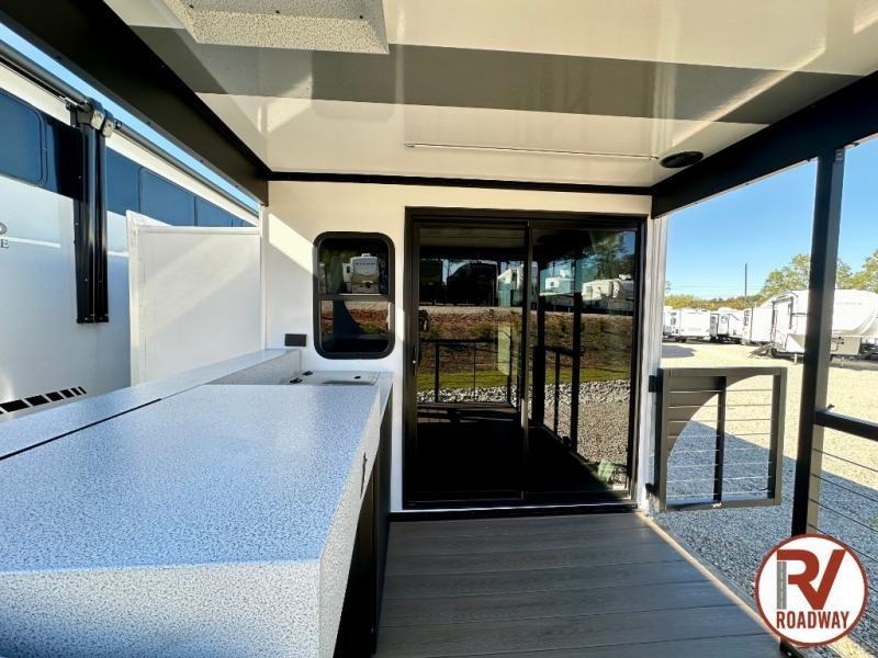 This travel trailer will feel more like home with its rear veranda/porch, dual entry doors, and front private bedroom! There is an outdoor kitchen on the back porch so you can make lunch in the fresh air, and the patio doors lead right into the main living area. Your crew can relax on the L-shaped sofa across from the fireplace, which will make your space more cozy. A kitchen island with four chairs will provide a place to dine at, and there is a spacious pantry and refrigerator for food storage. You will love having your own space in the private bedroom, and the Versa-Tilt custom king bed will let you sit up in bed to read your book at night.