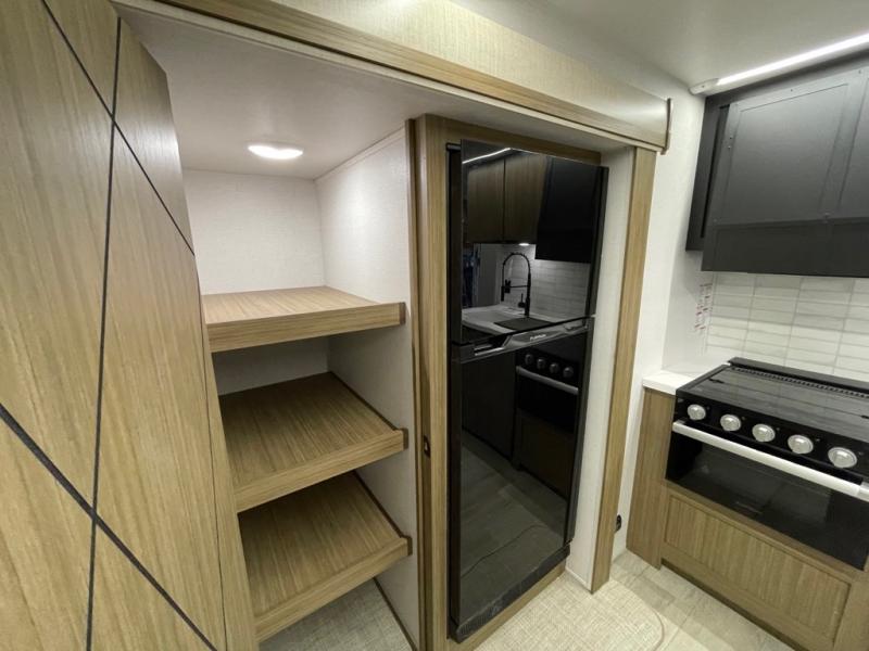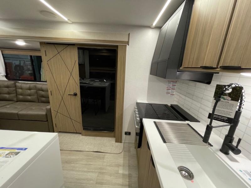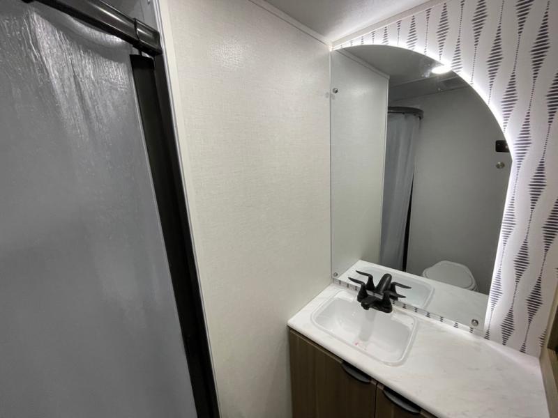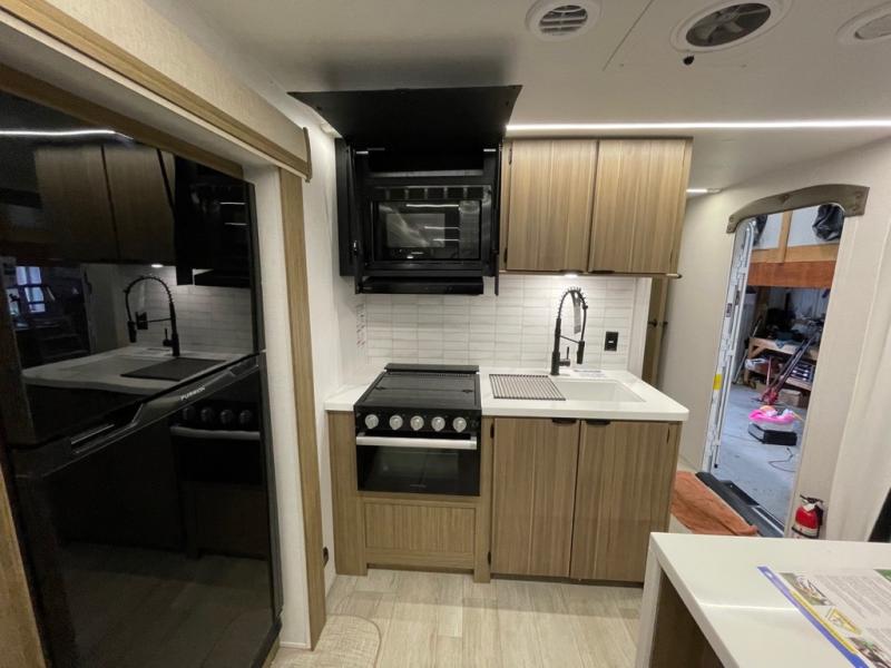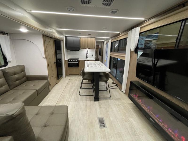 This travel trailer will feel more like home with its rear veranda/porch, dual entry doors, and front private bedroom! There is an outdoor kitchen on the back porch so you can make lunch in the fresh air, and the patio doors lead right into the main living area. Your crew can relax on the L-shaped sofa across from the fireplace, which will make your space more cozy. A kitchen island with four chairs will provide a place to dine at, and there is a spacious pantry and refrigerator for food storage. You will love having your own space in the private bedroom, and the Versa-Tilt custom king bed will let you sit up in bed to read your book at night.