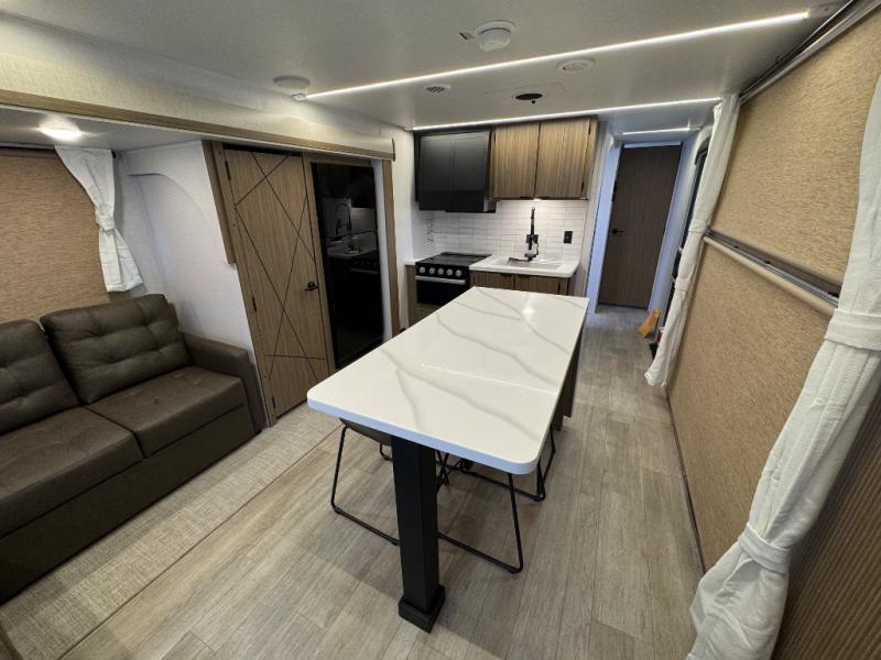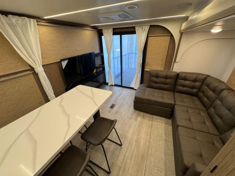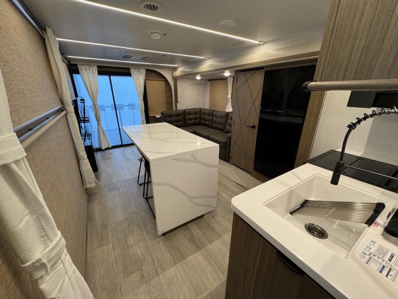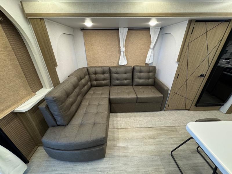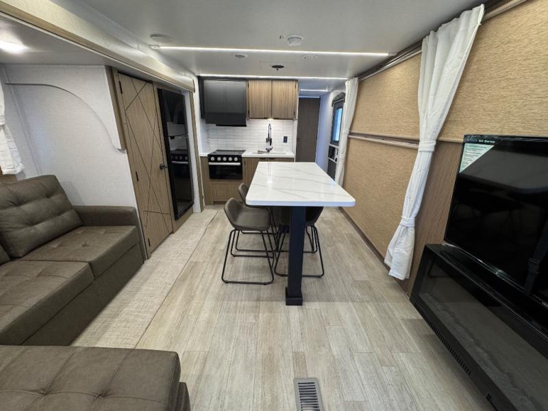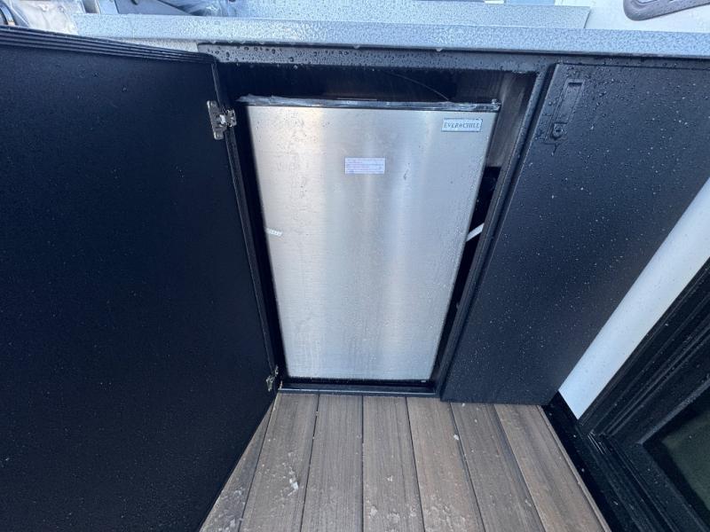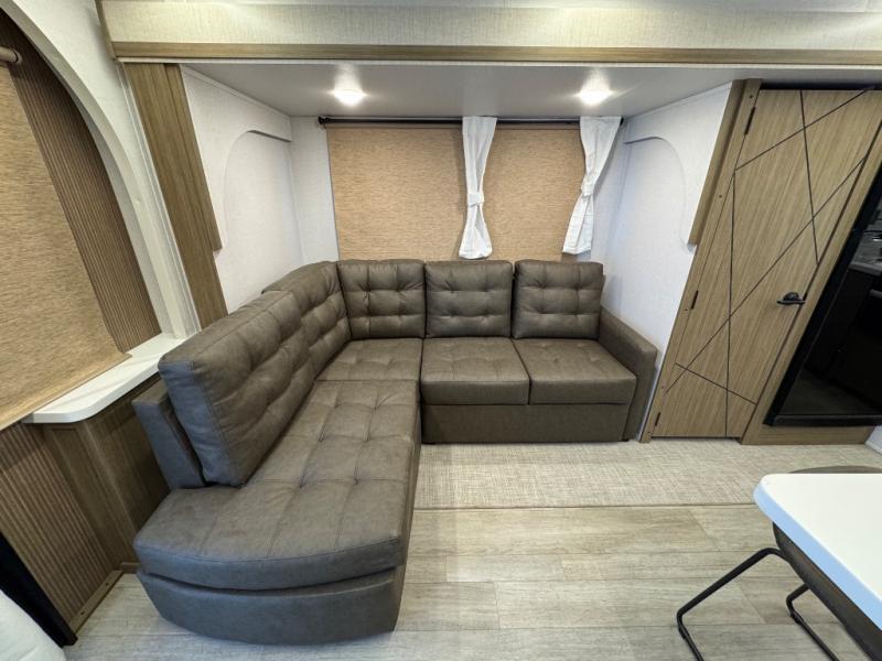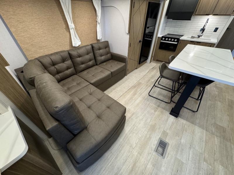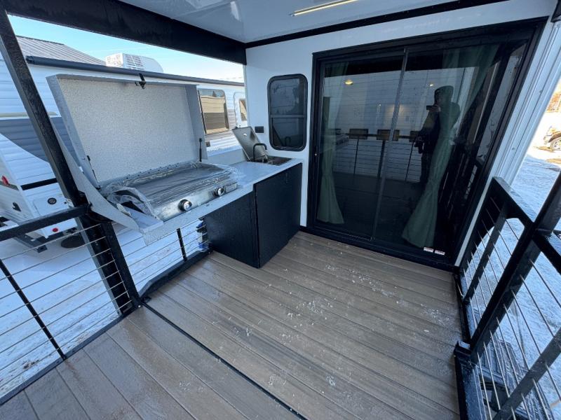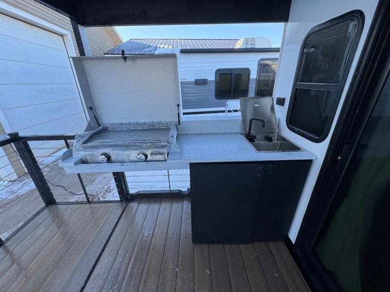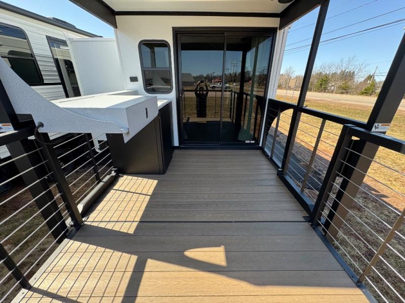 This travel trailer will feel more like home with its rear veranda/porch, dual entry doors, and front private bedroom! There is an outdoor kitchen on the back porch so you can make lunch in the fresh air, and the patio doors lead right into the main living area. Your crew can relax on the L-shaped sofa across from the fireplace, which will make your space more cozy. A kitchen island with four chairs will provide a place to dine at, and there is a spacious pantry and refrigerator for food storage. You will love having your own space in the private bedroom, and the Versa-Tilt custom king bed will let you sit up in bed to read your book at night.