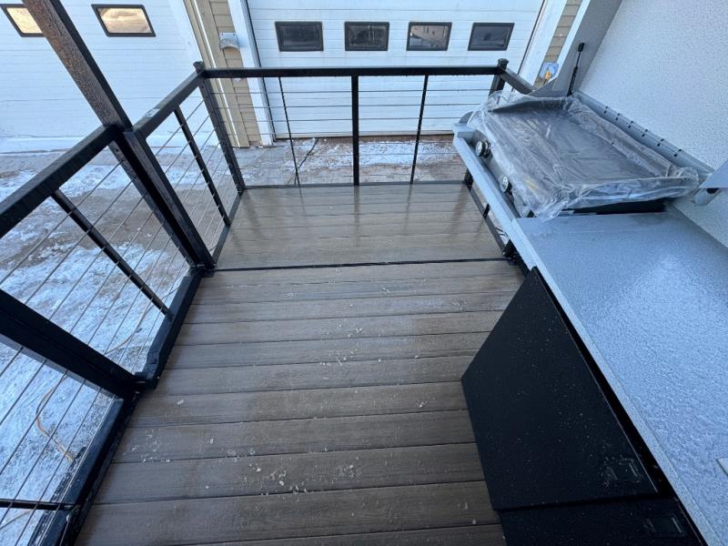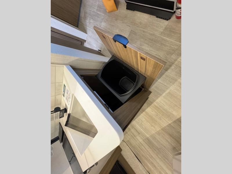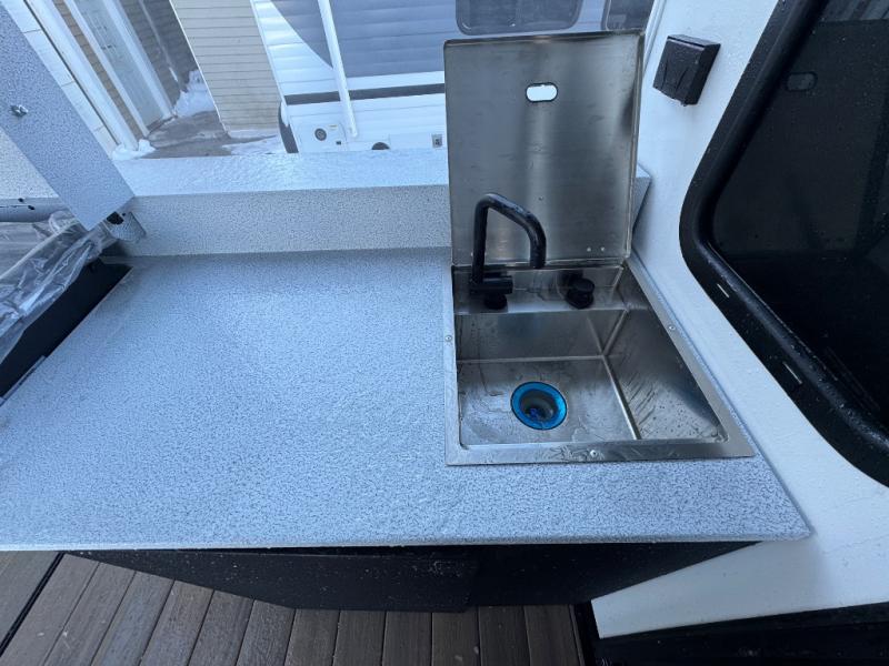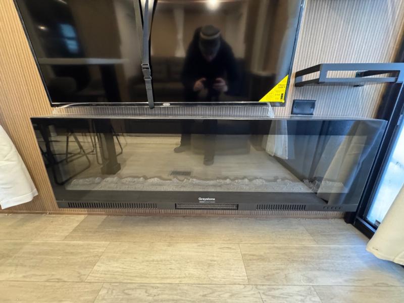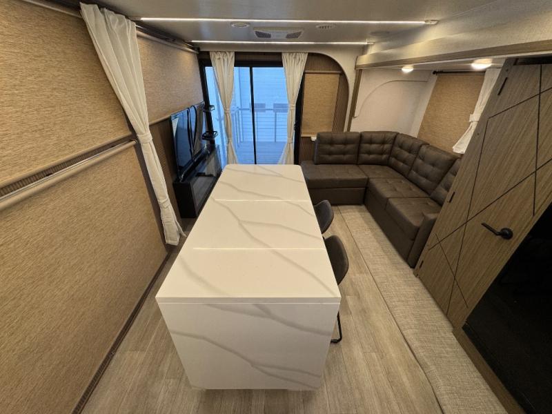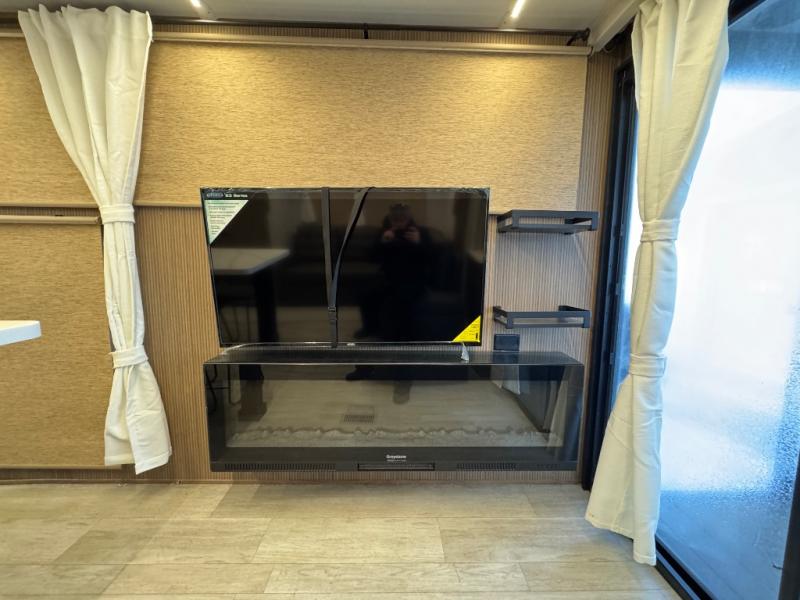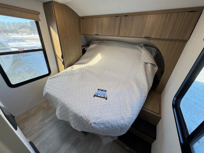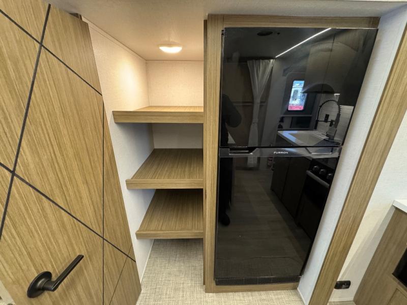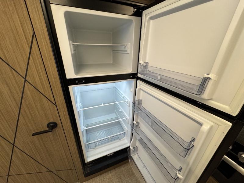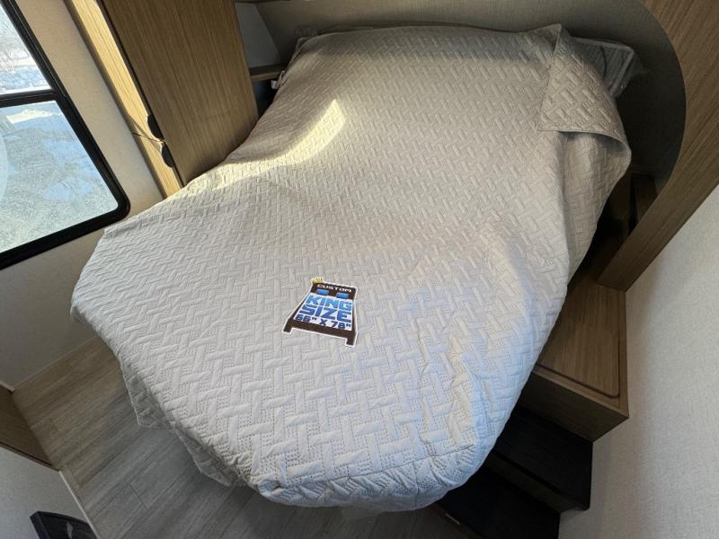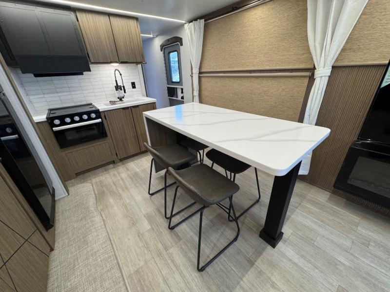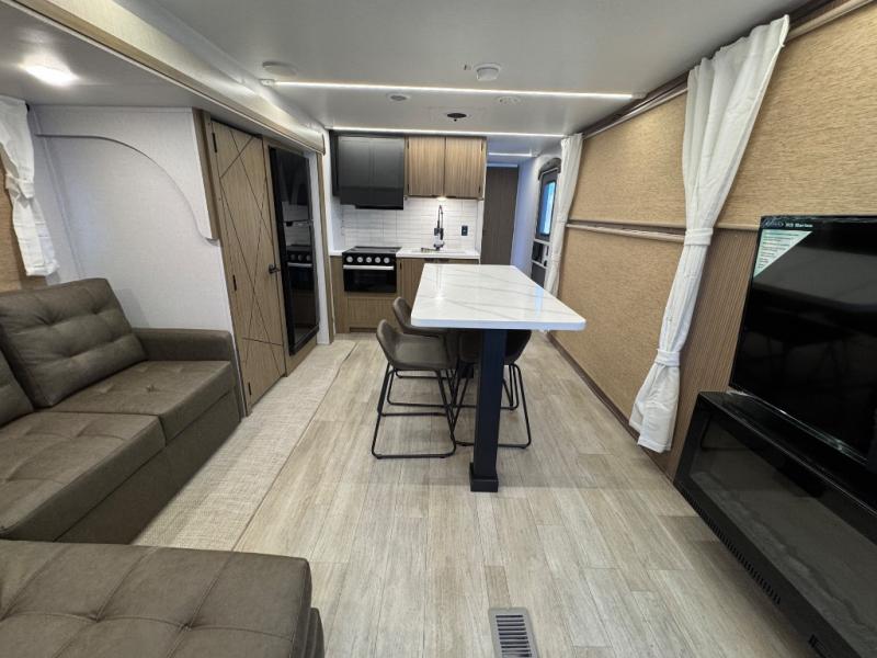 This travel trailer will feel more like home with its rear veranda/porch, dual entry doors, and front private bedroom! There is an outdoor kitchen on the back porch so you can make lunch in the fresh air, and the patio doors lead right into the main living area. Your crew can relax on the L-shaped sofa across from the fireplace, which will make your space more cozy. A kitchen island with four chairs will provide a place to dine at, and there is a spacious pantry and refrigerator for food storage. You will love having your own space in the private bedroom, and the Versa-Tilt custom king bed will let you sit up in bed to read your book at night.