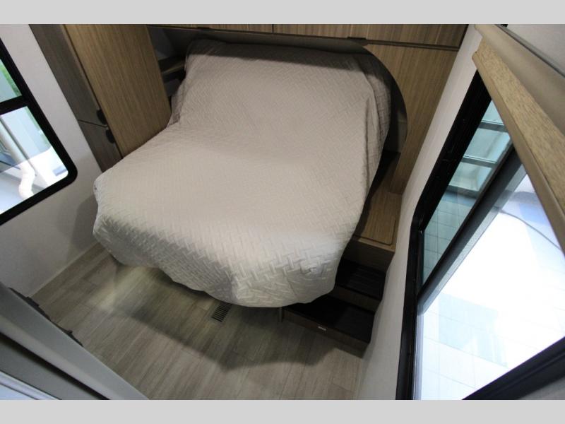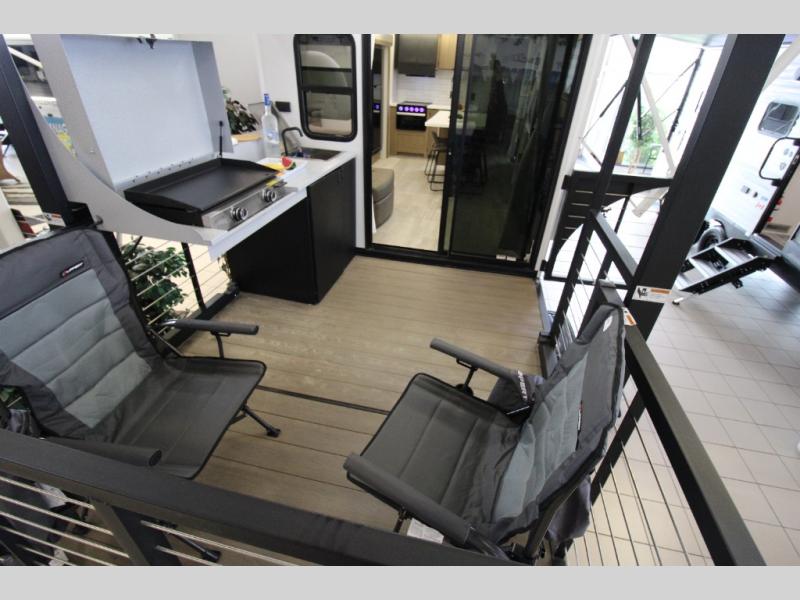 This travel trailer will feel more like home with its rear veranda/porch, dual entry doors, and front private bedroom! There is an outdoor kitchen on the back porch so you can make lunch in the fresh air, and the patio doors lead right into the main living area. Your crew can relax on the L-shaped sofa across from the fireplace, which will make your space more cozy. A kitchen island with four chairs will provide a place to dine at, and there is a spacious pantry and refrigerator for food storage. You will love having your own space in the private bedroom, and the Versa-Tilt custom king bed will let you sit up in bed to read your book at night.