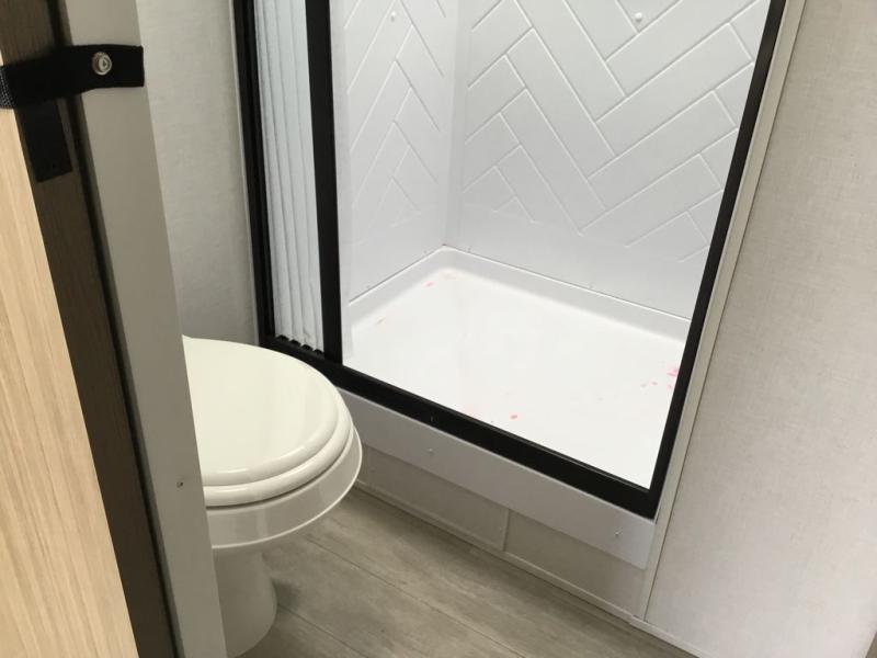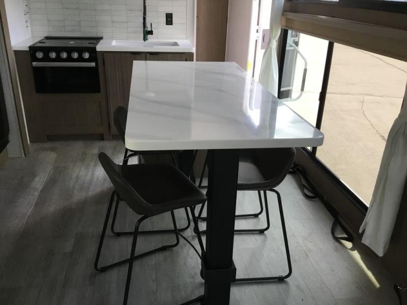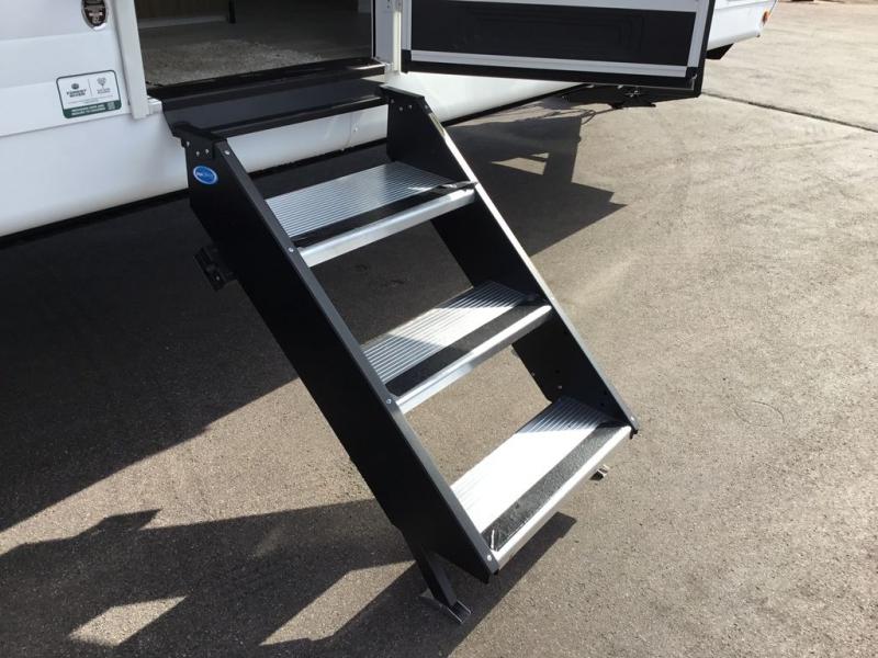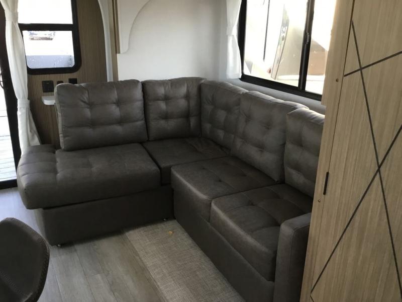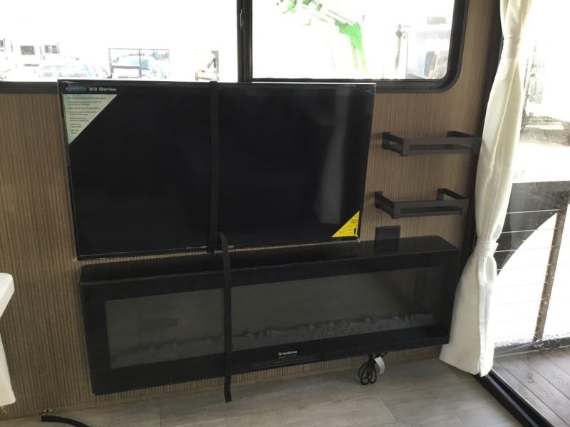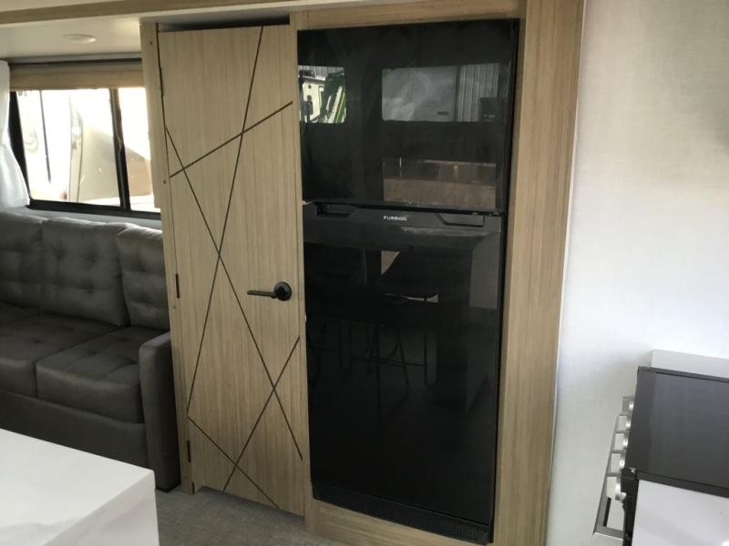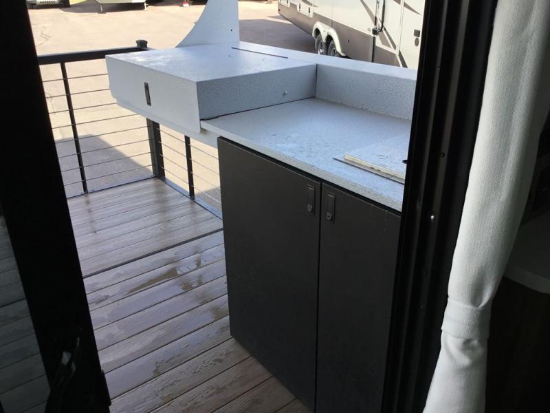This travel trailer will feel more like home with its rear veranda/porch, dual entry doors, and front private bedroom! There is an outdoor kitchen on the back porch so you can make lunch in the fresh air, and the patio doors lead right into the main living area. Your crew can relax on the L-shaped sofa across from the fireplace, which will make your space more cozy. A kitchen island with four chairs will provide a place to dine at, and there is a spacious pantry and refrigerator for food storage. You will love having your own space in the private bedroom, and the Versa-Tilt custom king bed will let you sit up in bed to read your book at night.