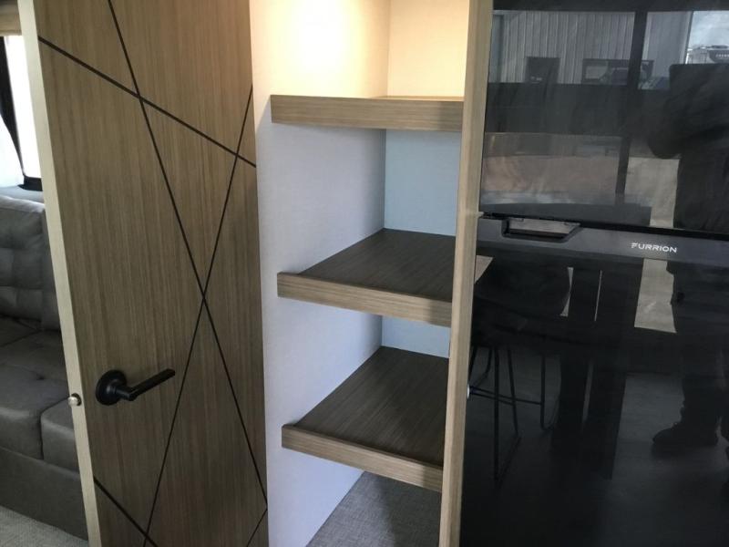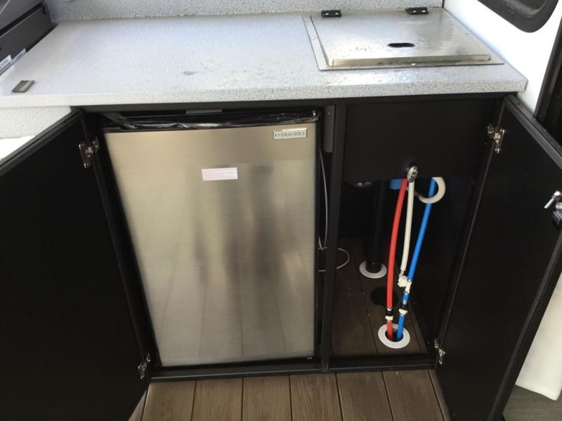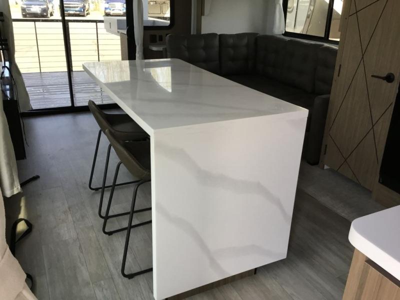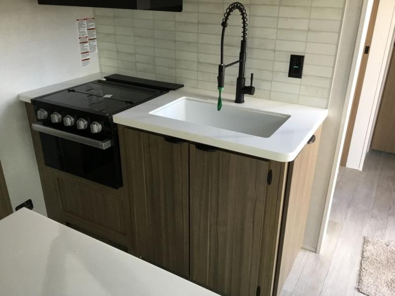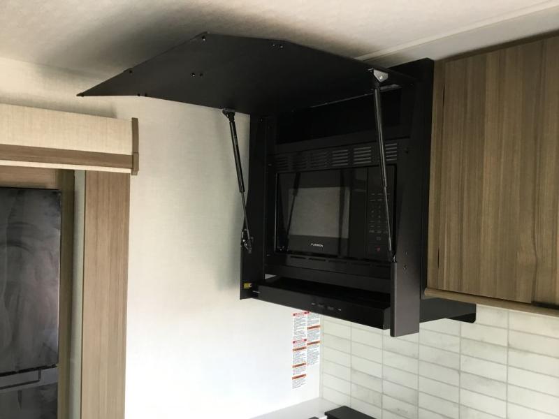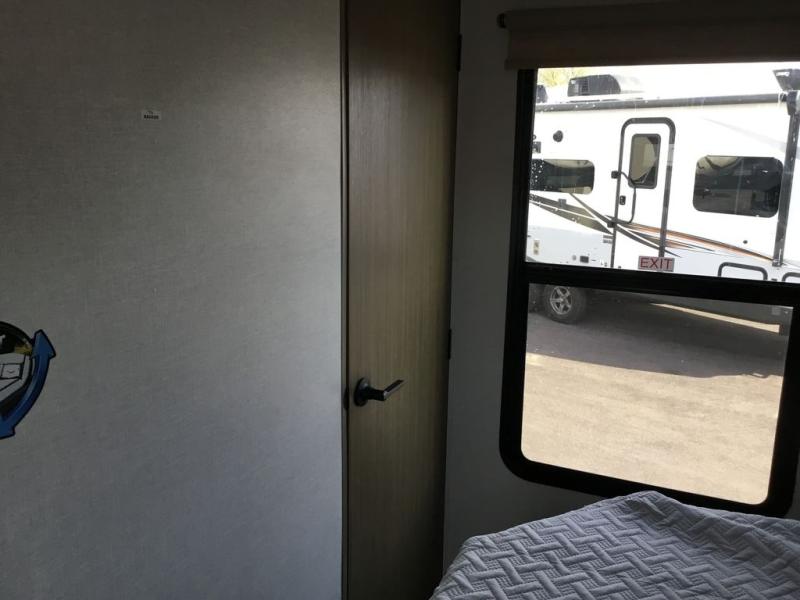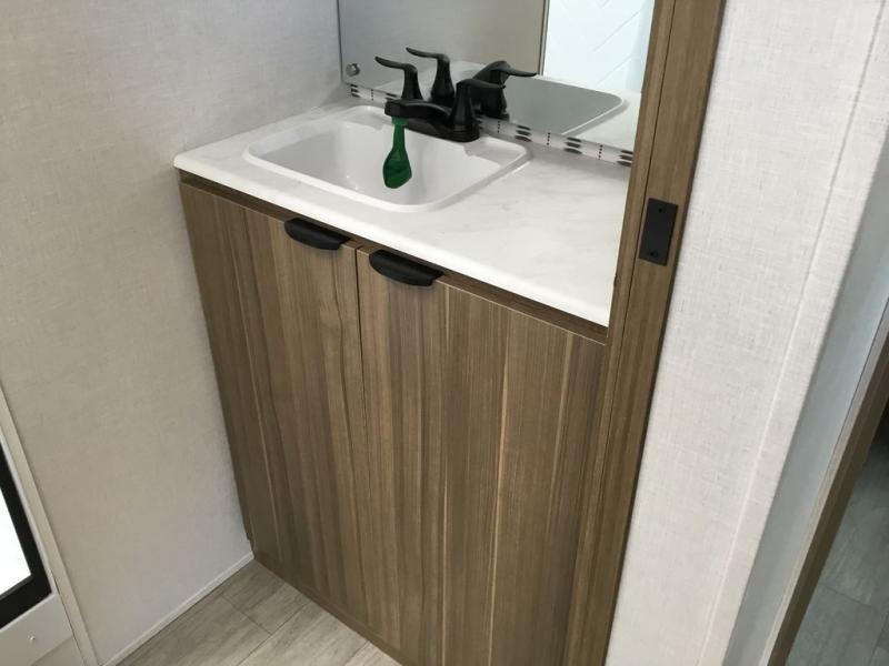This travel trailer will feel more like home with its rear veranda/porch, dual entry doors, and front private bedroom! There is an outdoor kitchen on the back porch so you can make lunch in the fresh air, and the patio doors lead right into the main living area. Your crew can relax on the L-shaped sofa across from the fireplace, which will make your space more cozy. A kitchen island with four chairs will provide a place to dine at, and there is a spacious pantry and refrigerator for food storage. You will love having your own space in the private bedroom, and the Versa-Tilt custom king bed will let you sit up in bed to read your book at night.