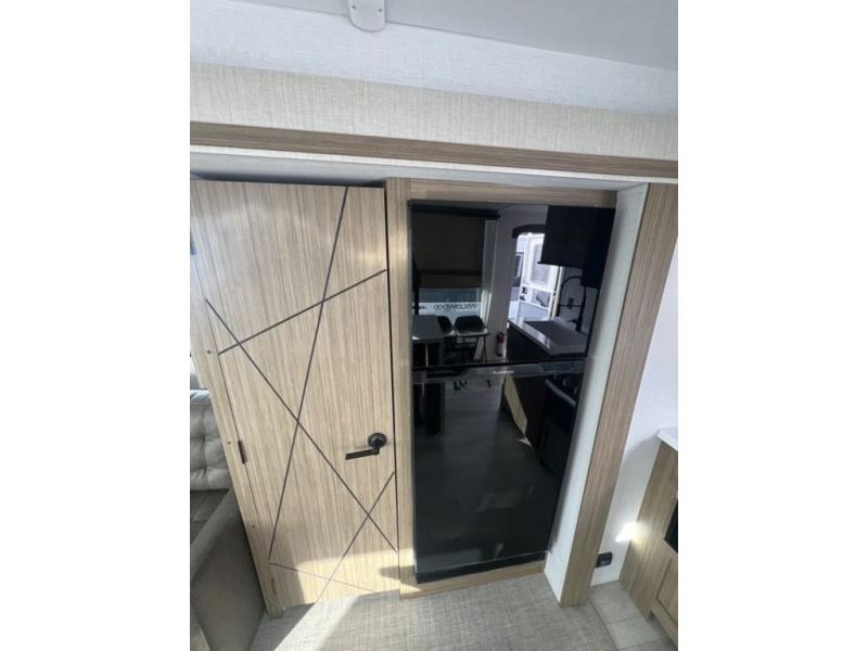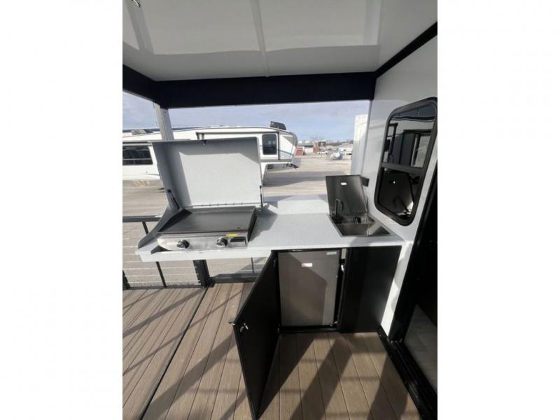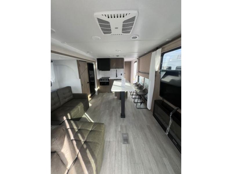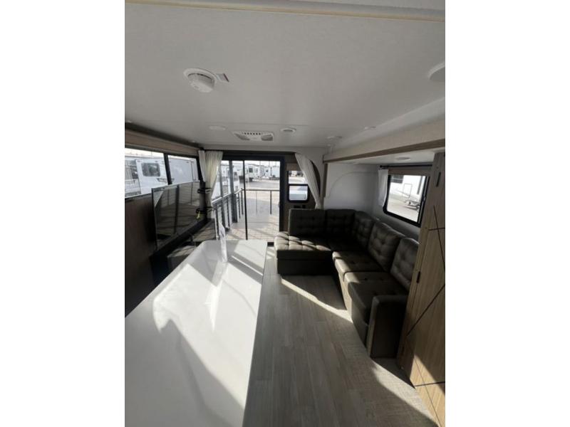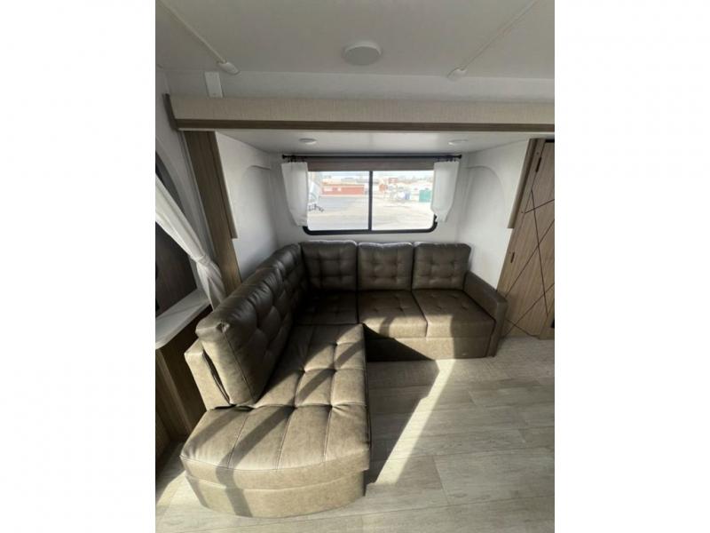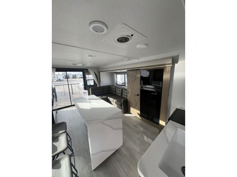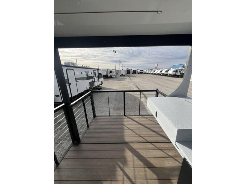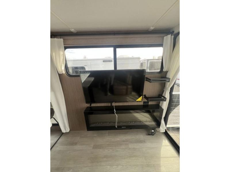 This travel trailer will feel more like home with its rear veranda/porch, dual entry doors, and front private bedroom! There is an outdoor kitchen on the back porch so you can make lunch in the fresh air, and the patio doors lead right into the main living area. Your crew can relax on the L-shaped sofa across from the fireplace, which will make your space more cozy. A kitchen island with four chairs will provide a place to dine at, and there is a spacious pantry and refrigerator for food storage. You will love having your own space in the private bedroom, and the Versa-Tilt custom king bed will let you sit up in bed to read your book at night.