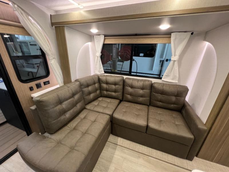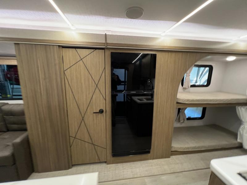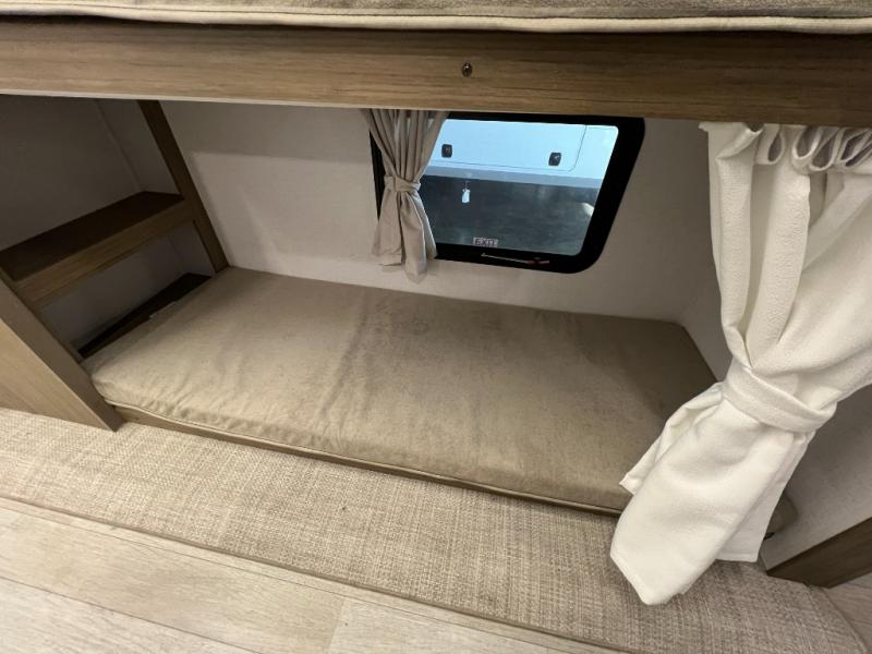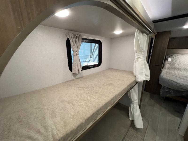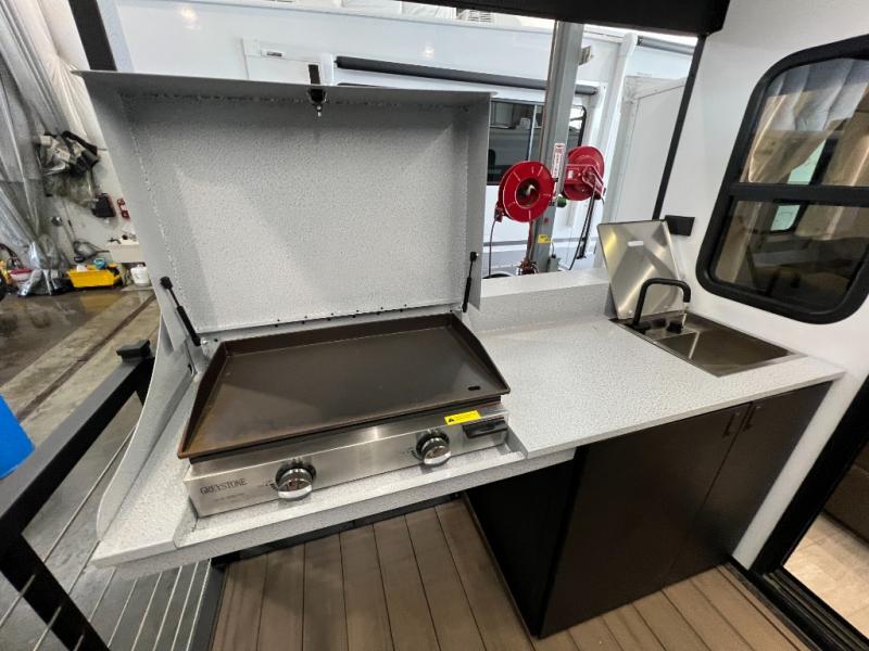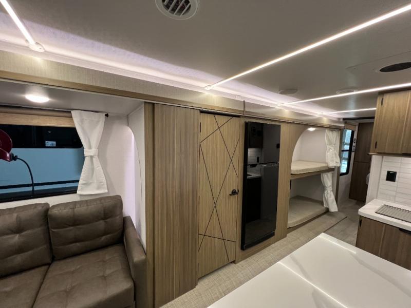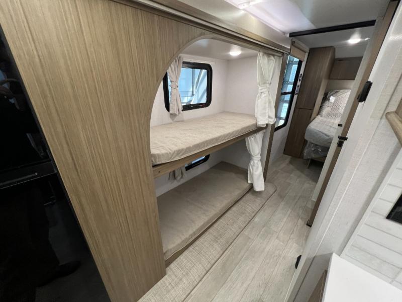 This travel trailer will feel more like home with its rear veranda/porch, dual entry doors, and front private bedroom! There is an outdoor kitchen on the back porch so you can make lunch in the fresh air, and the patio doors lead right into the main living area. Your crew can relax on the L-shaped sofa within the large slide across from the fireplace, which will make your space more cozy. There are also bunk beds with a storage cubby here, along with a pull-out pantry and a closet/pantry, and a refrigerator! A kitchen island with four chairs will provide a place to dine at, although you may just find yourselves out back or under the side awning. You will love having your own space in the private bedroom, and the Versa-Tilt custom king bed will let you sit up in bed to read your book at night.