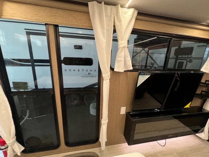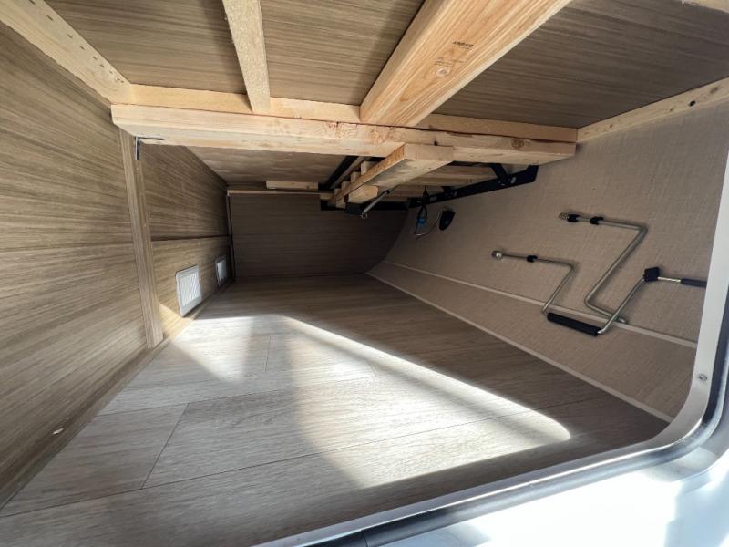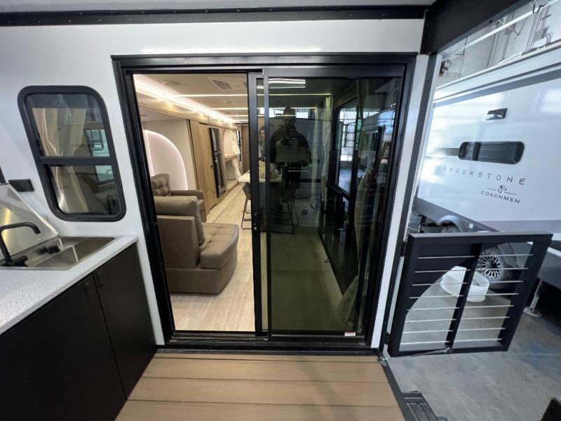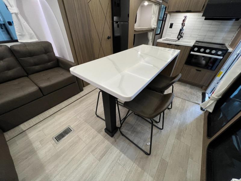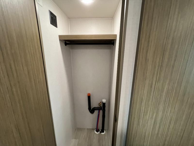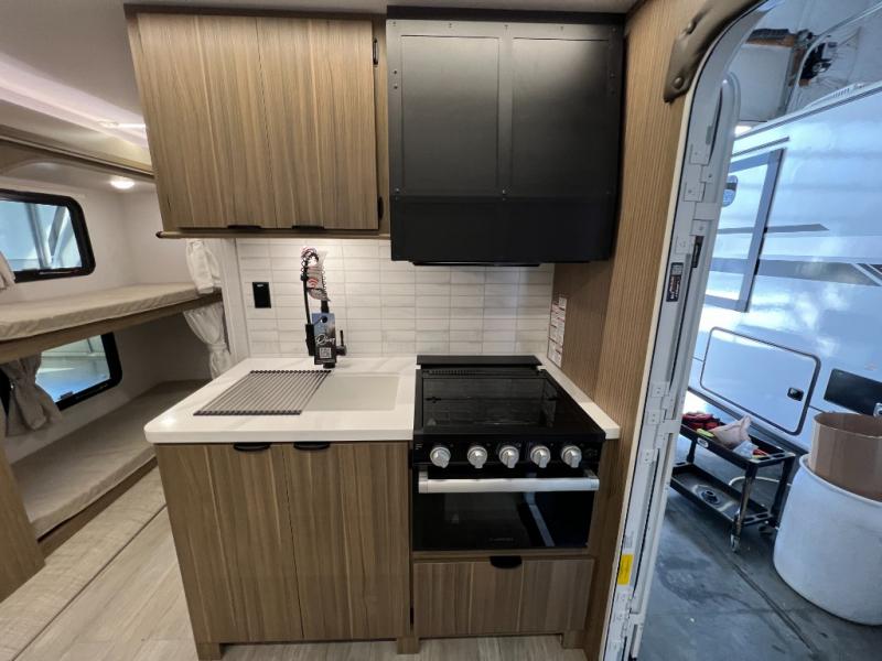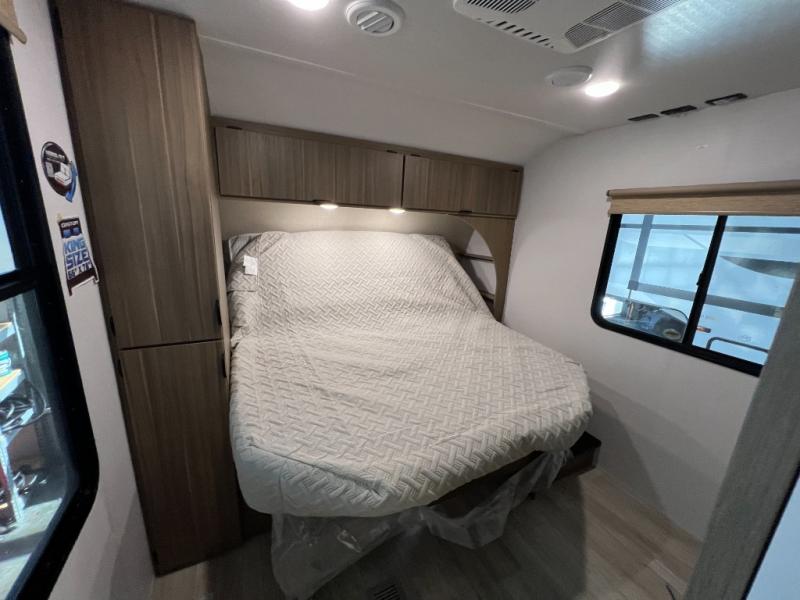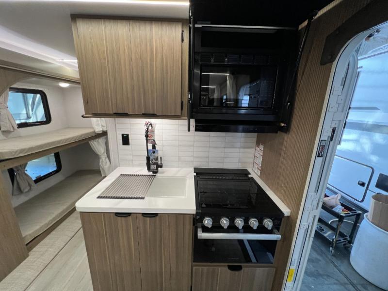 This travel trailer will feel more like home with its rear veranda/porch, dual entry doors, and front private bedroom! There is an outdoor kitchen on the back porch so you can make lunch in the fresh air, and the patio doors lead right into the main living area. Your crew can relax on the L-shaped sofa within the large slide across from the fireplace, which will make your space more cozy. There are also bunk beds with a storage cubby here, along with a pull-out pantry and a closet/pantry, and a refrigerator! A kitchen island with four chairs will provide a place to dine at, although you may just find yourselves out back or under the side awning. You will love having your own space in the private bedroom, and the Versa-Tilt custom king bed will let you sit up in bed to read your book at night.