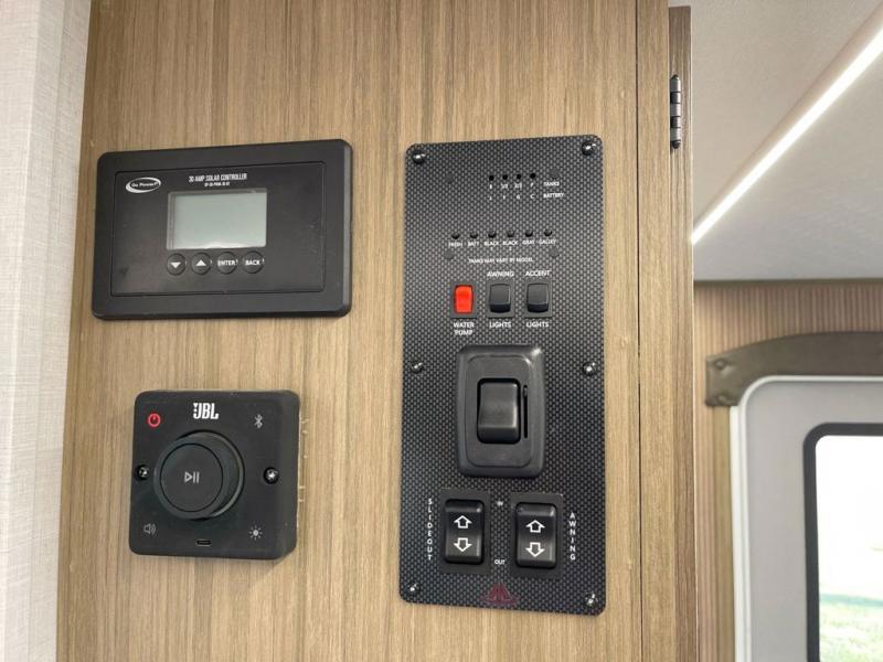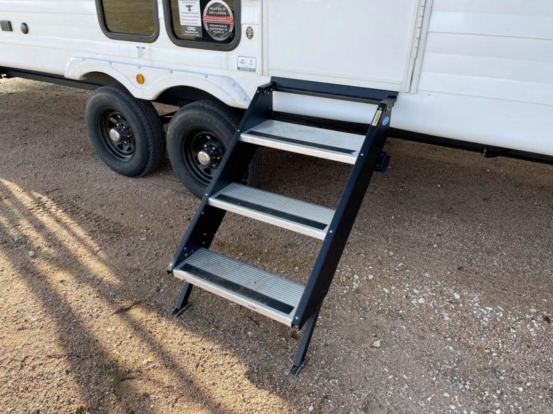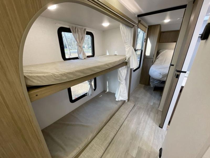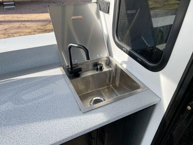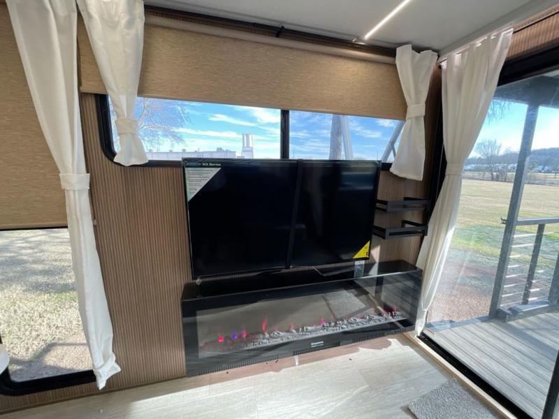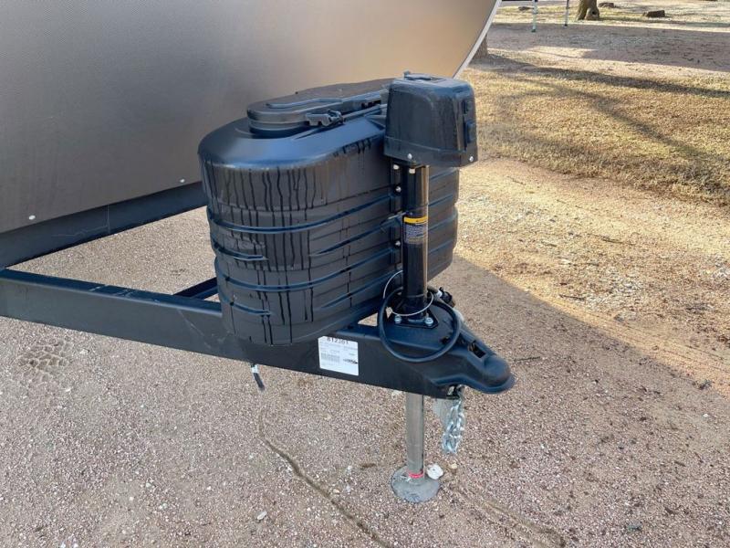 This travel trailer will feel more like home with its rear veranda/porch, dual entry doors, and front private bedroom! There is an outdoor kitchen on the back porch so you can make lunch in the fresh air, and the patio doors lead right into the main living area. Your crew can relax on the L-shaped sofa within the large slide across from the fireplace, which will make your space more cozy. There are also bunk beds with a storage cubby here, along with a pull-out pantry and a closet/pantry, and a refrigerator! A kitchen island with four chairs will provide a place to dine at, although you may just find yourselves out back or under the side awning. You will love having your own space in the private bedroom, and the Versa-Tilt custom king bed will let you sit up in bed to read your book at night.
