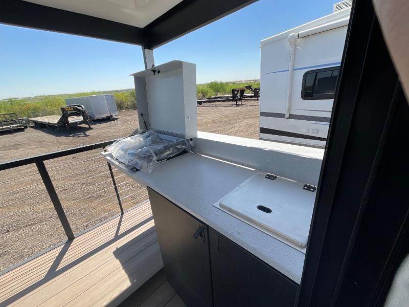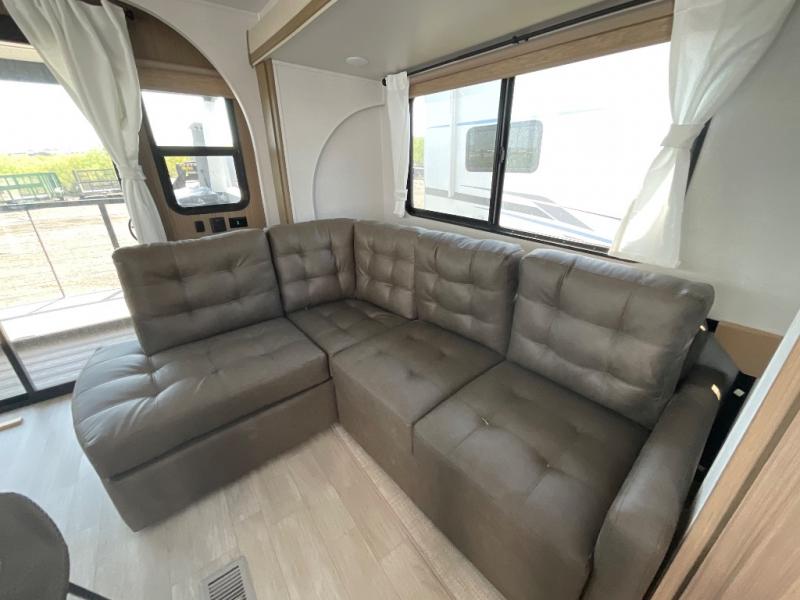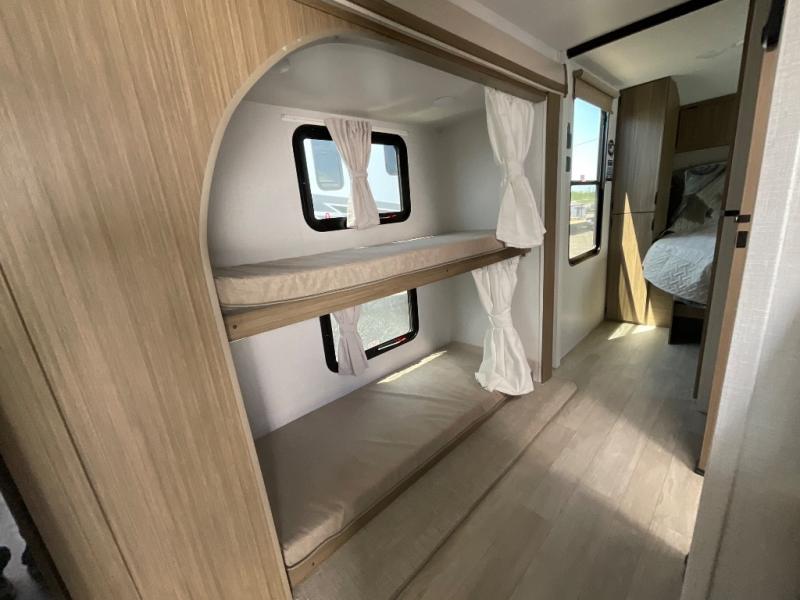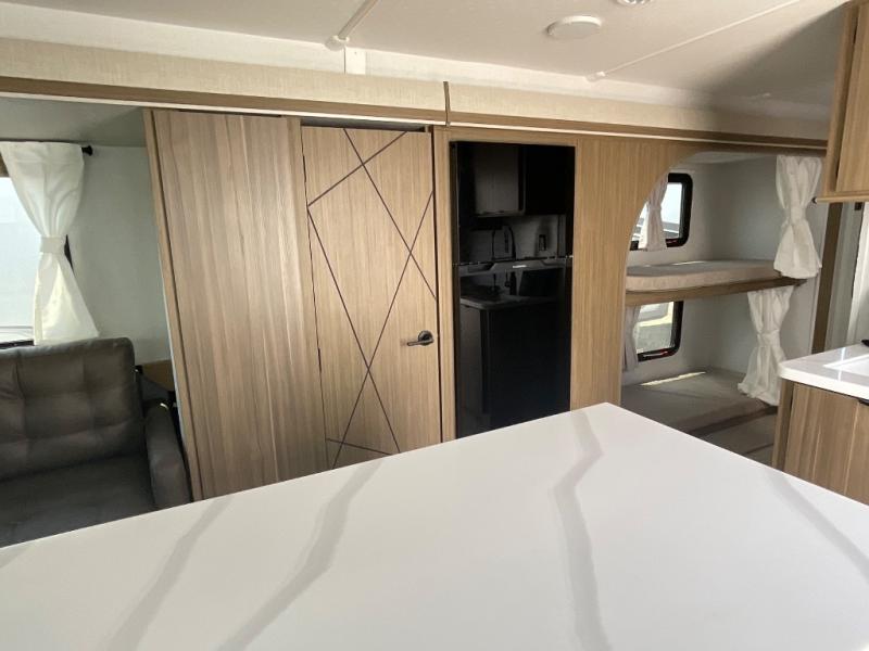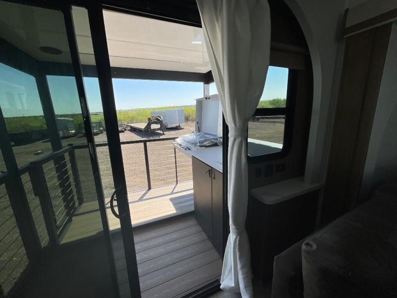 This travel trailer will feel more like home with its rear veranda/porch, dual entry doors, and front private bedroom! There is an outdoor kitchen on the back porch so you can make lunch in the fresh air, and the patio doors lead right into the main living area. Your crew can relax on the L-shaped sofa within the large slide across from the fireplace, which will make your space more cozy. There are also bunk beds with a storage cubby here, along with a pull-out pantry and a closet/pantry, and a refrigerator! A kitchen island with four chairs will provide a place to dine at, although you may just find yourselves out back or under the side awning. You will love having your own space in the private bedroom, and the Versa-Tilt custom king bed will let you sit up in bed to read your book at night.