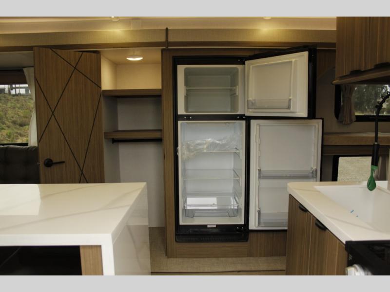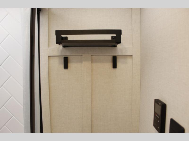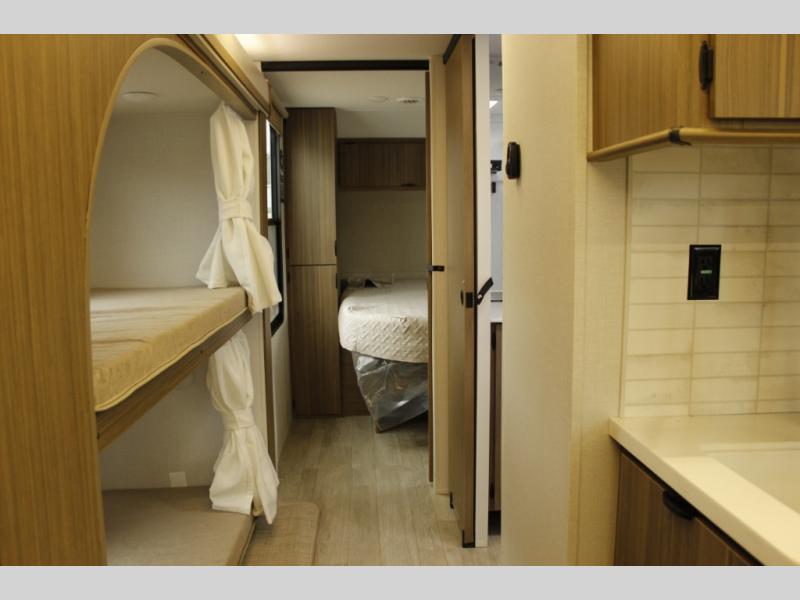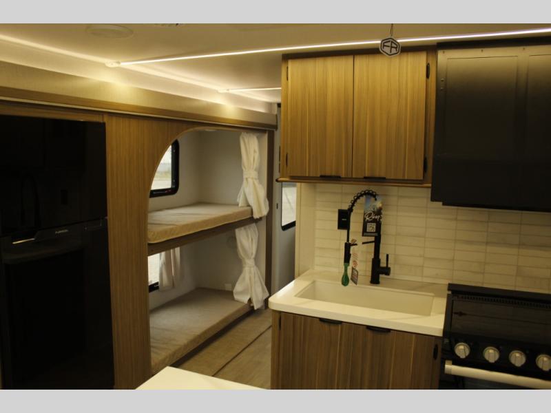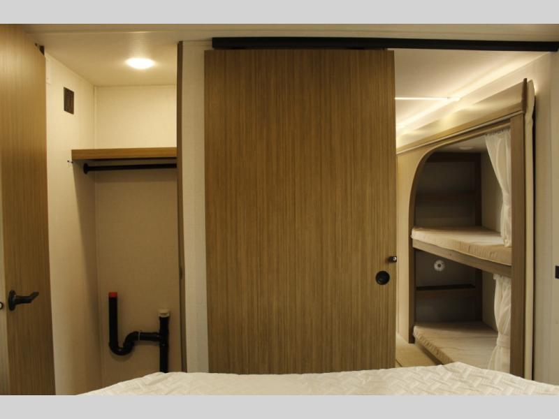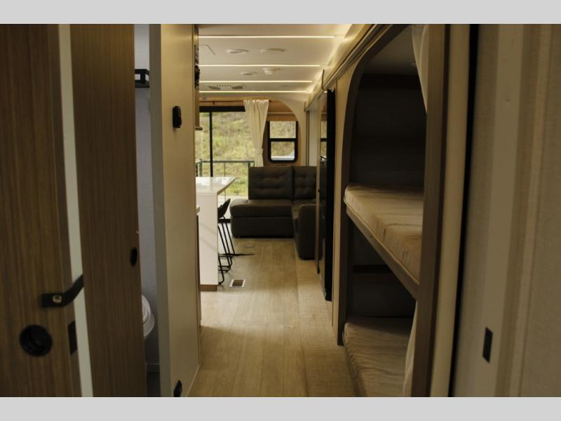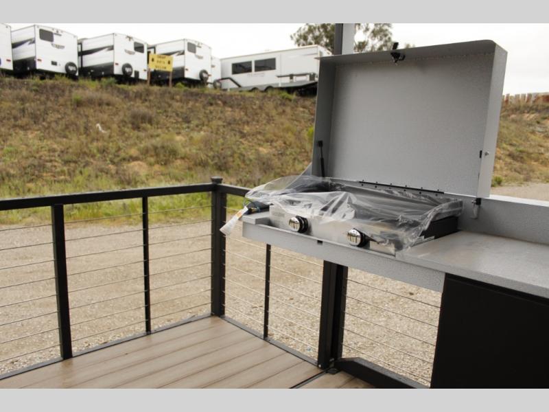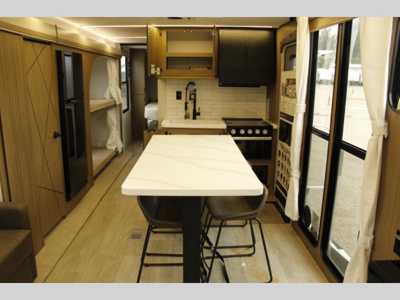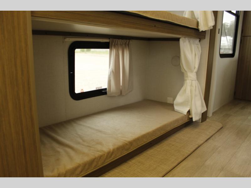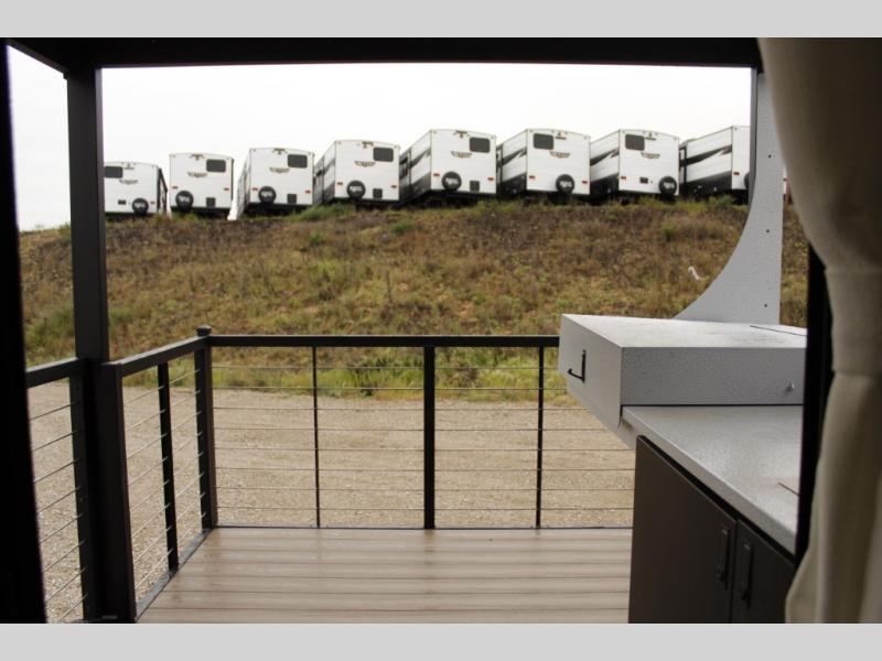 This travel trailer will feel more like home with its rear veranda/porch, dual entry doors, and front private bedroom! There is an outdoor kitchen on the back porch so you can make lunch in the fresh air, and the patio doors lead right into the main living area. Your crew can relax on the L-shaped sofa within the large slide across from the fireplace, which will make your space more cozy. There are also bunk beds with a storage cubby here, along with a pull-out pantry and a closet/pantry, and a refrigerator! A kitchen island with four chairs will provide a place to dine at, although you may just find yourselves out back or under the side awning. You will love having your own space in the private bedroom, and the Versa-Tilt custom king bed will let you sit up in bed to read your book at night.