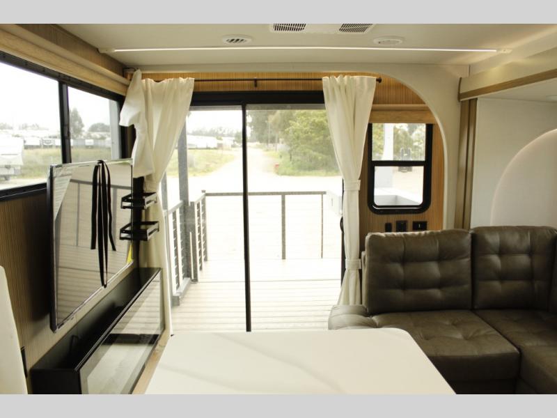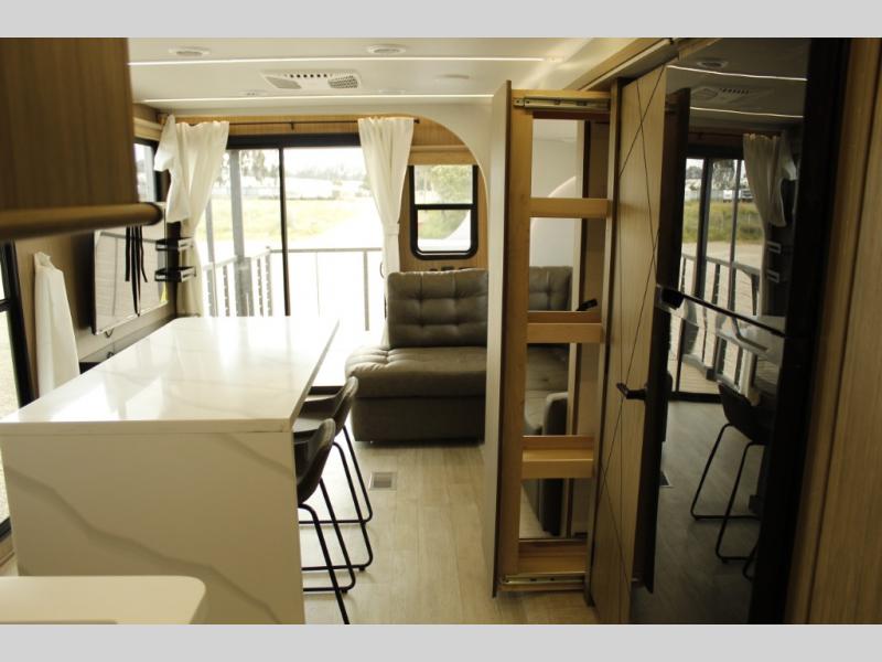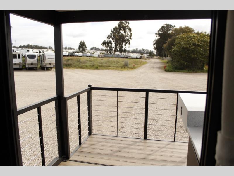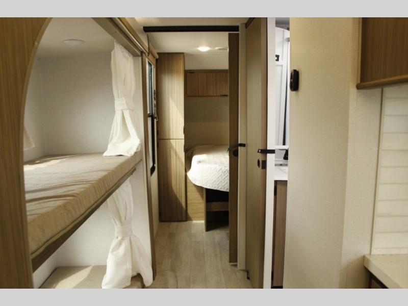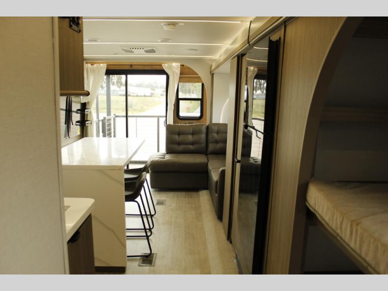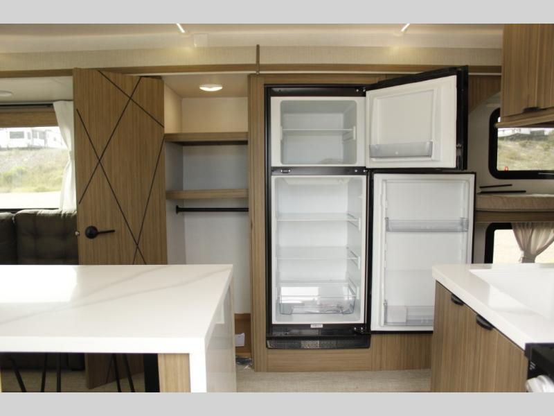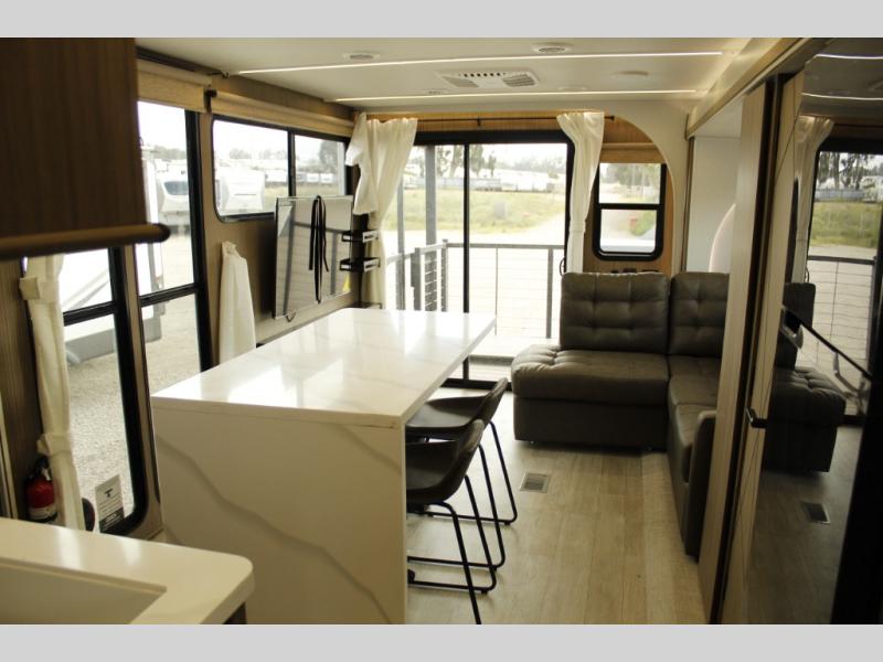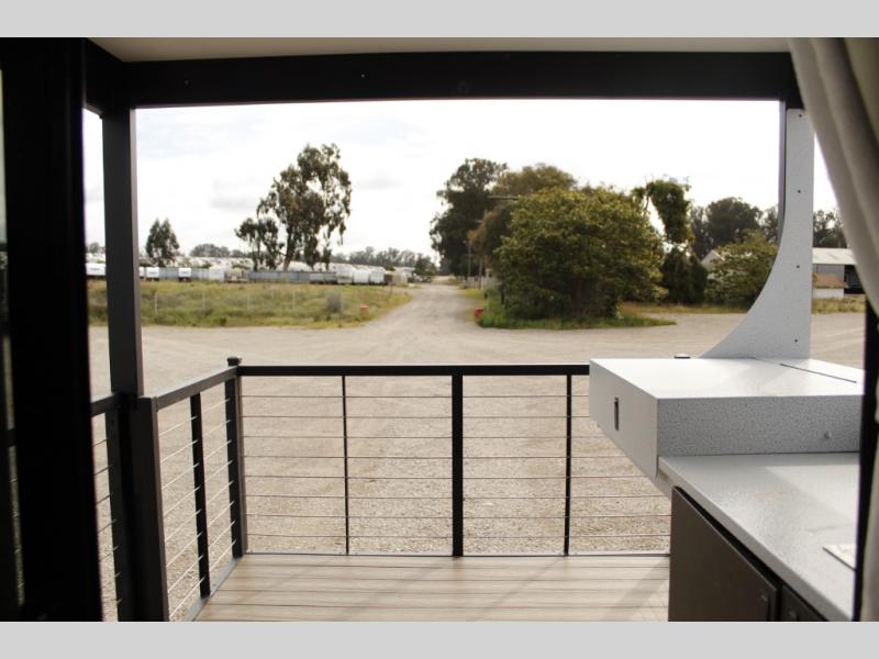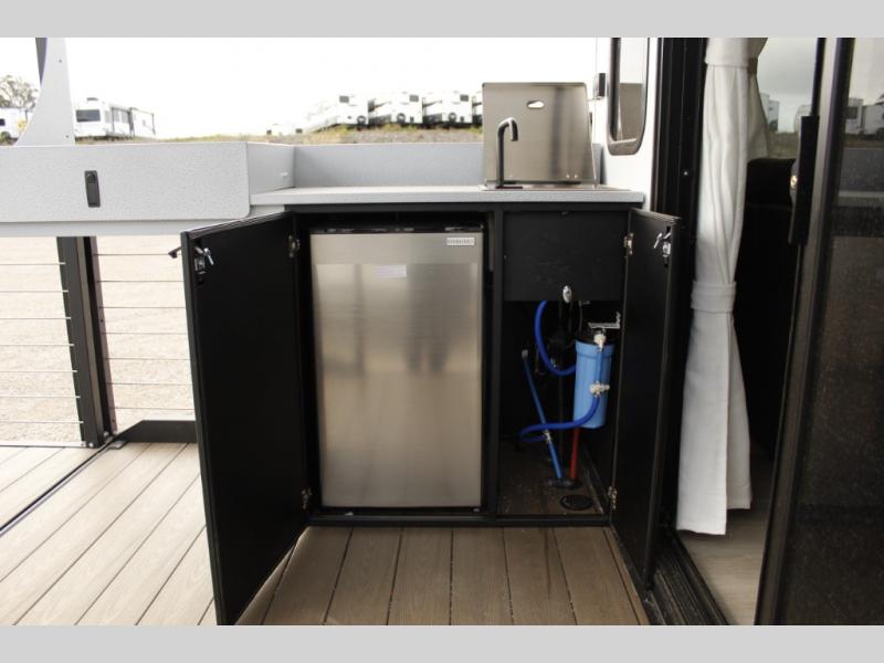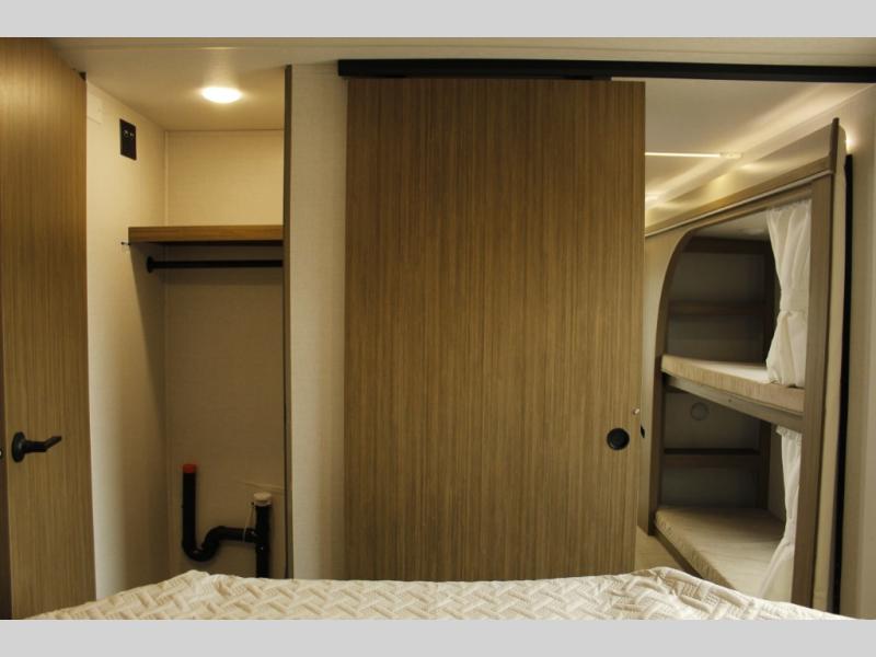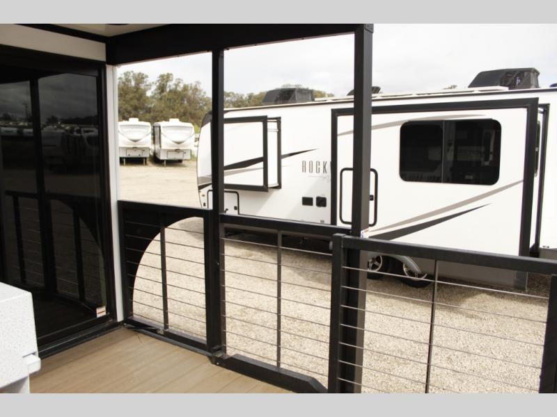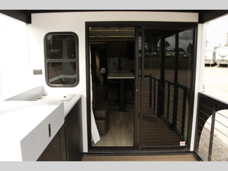This travel trailer will feel more like home with its rear veranda/porch, dual entry doors, and front private bedroom! There is an outdoor kitchen on the back porch so you can make lunch in the fresh air, and the patio doors lead right into the main living area. Your crew can relax on the L-shaped sofa within the large slide across from the fireplace, which will make your space more cozy. There are also bunk beds with a storage cubby here, along with a pull-out pantry and a closet/pantry, and a refrigerator! A kitchen island with four chairs will provide a place to dine at, although you may just find yourselves out back or under the side awning. You will love having your own space in the private bedroom, and the Versa-Tilt custom king bed will let you sit up in bed to read your book at night.