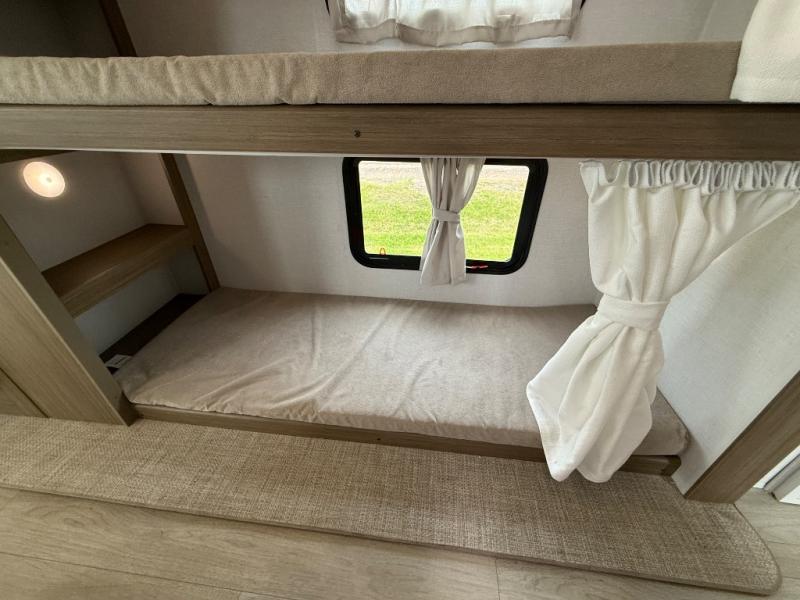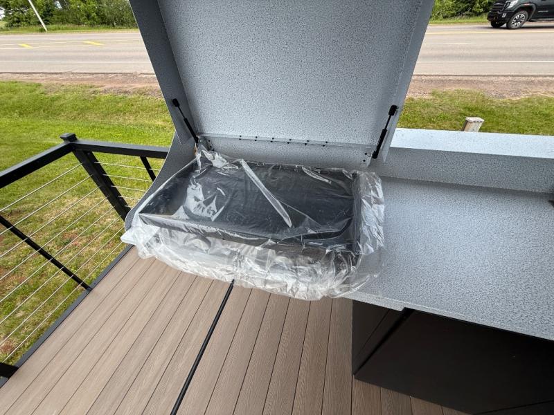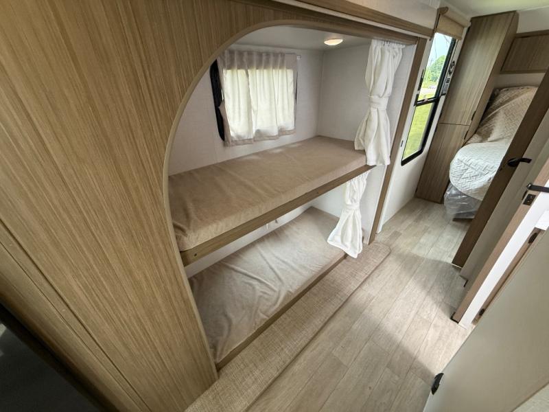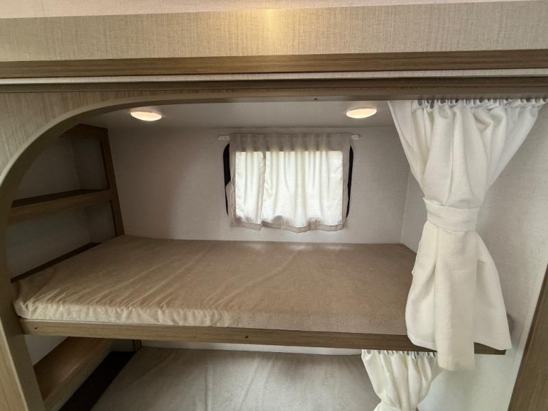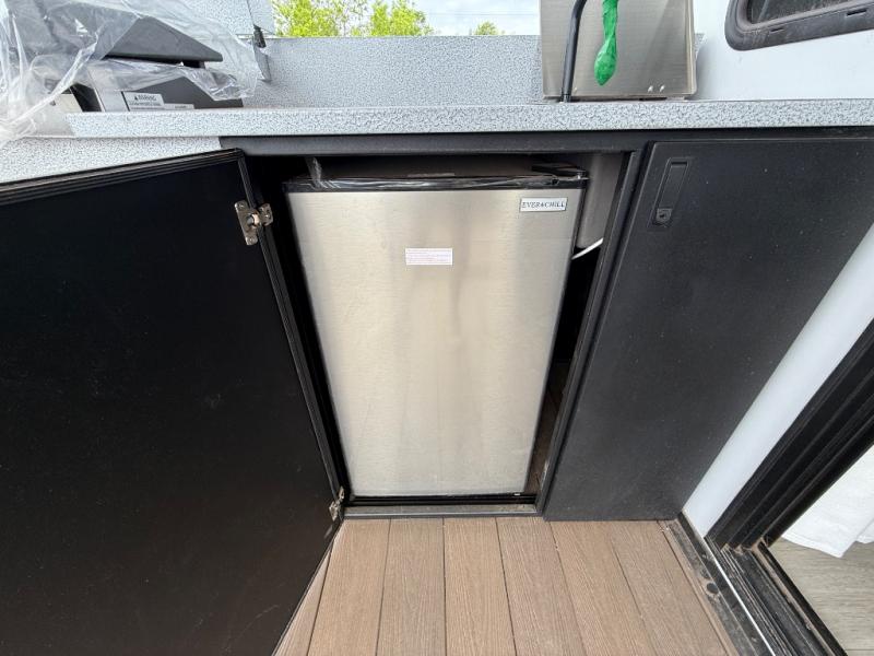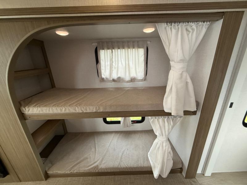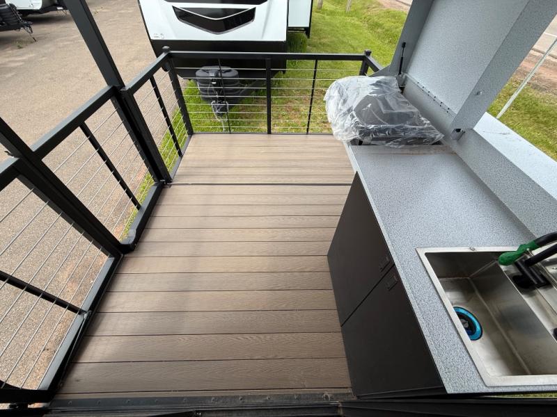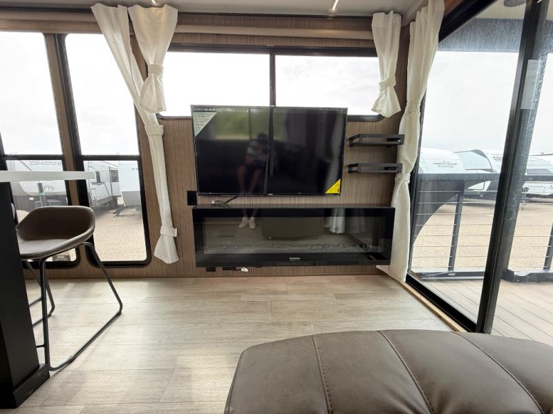 This travel trailer will feel more like home with its rear veranda/porch, dual entry doors, and front private bedroom! There is an outdoor kitchen on the back porch so you can make lunch in the fresh air, and the patio doors lead right into the main living area. Your crew can relax on the L-shaped sofa within the large slide across from the fireplace, which will make your space more cozy. There are also bunk beds with a storage cubby here, along with a pull-out pantry and a closet/pantry, and a refrigerator! A kitchen island with four chairs will provide a place to dine at, although you may just find yourselves out back or under the side awning. You will love having your own space in the private bedroom, and the Versa-Tilt custom king bed will let you sit up in bed to read your book at night.