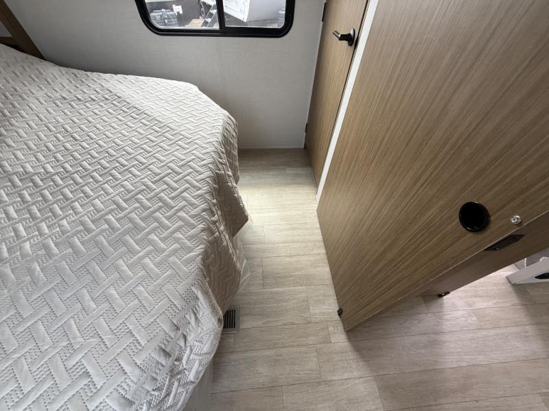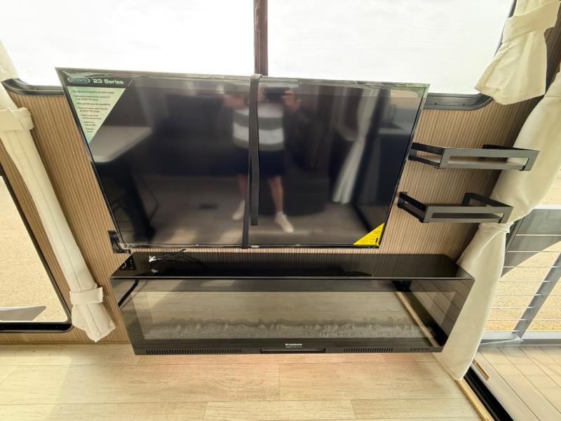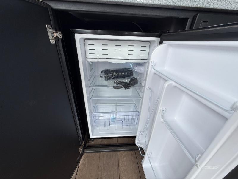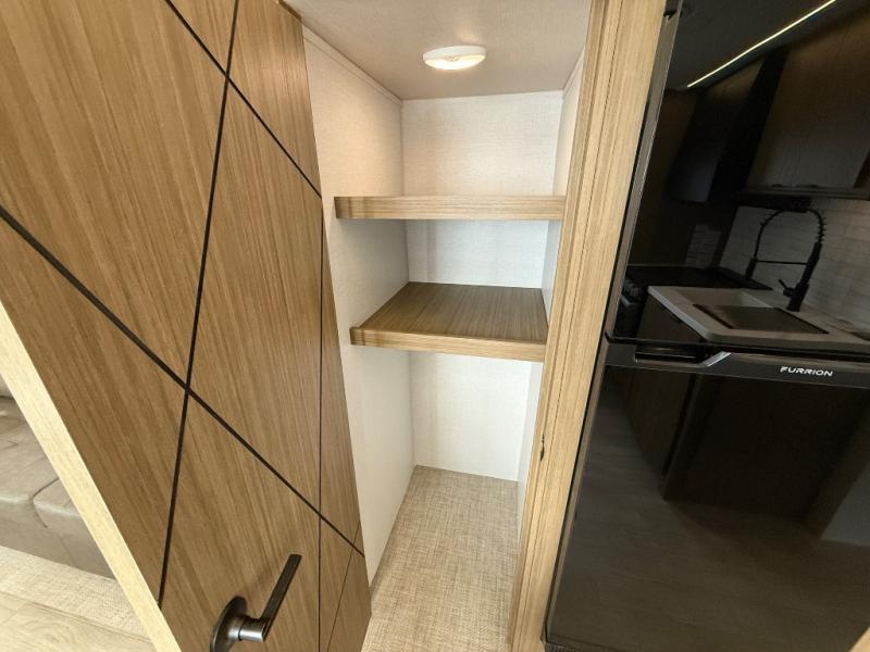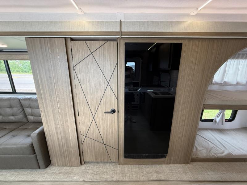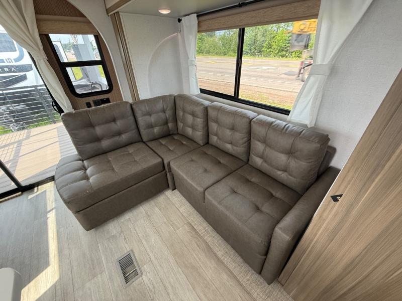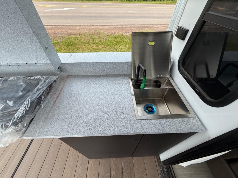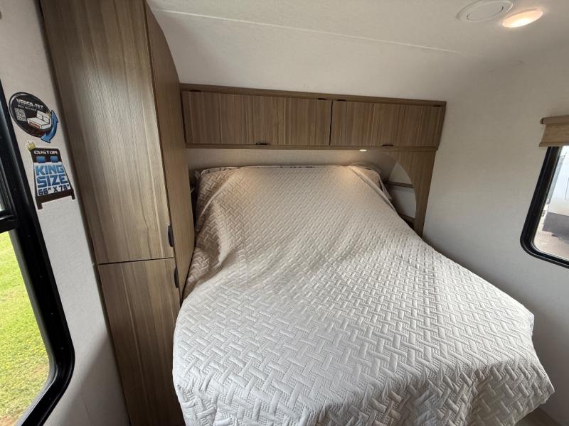 This travel trailer will feel more like home with its rear veranda/porch, dual entry doors, and front private bedroom! There is an outdoor kitchen on the back porch so you can make lunch in the fresh air, and the patio doors lead right into the main living area. Your crew can relax on the L-shaped sofa within the large slide across from the fireplace, which will make your space more cozy. There are also bunk beds with a storage cubby here, along with a pull-out pantry and a closet/pantry, and a refrigerator! A kitchen island with four chairs will provide a place to dine at, although you may just find yourselves out back or under the side awning. You will love having your own space in the private bedroom, and the Versa-Tilt custom king bed will let you sit up in bed to read your book at night.