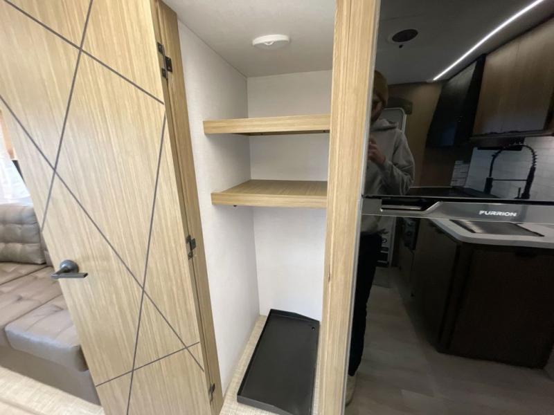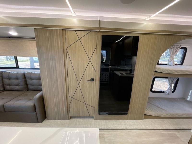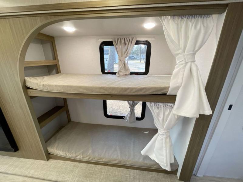 This travel trailer will feel more like home with its rear veranda/porch, dual entry doors, and front private bedroom! There is an outdoor kitchen on the back porch so you can make lunch in the fresh air, and the patio doors lead right into the main living area. Your crew can relax on the L-shaped sofa within the large slide across from the fireplace, which will make your space more cozy. There are also bunk beds with a storage cubby here, along with a pull-out pantry and a closet/pantry, and a refrigerator! A kitchen island with four chairs will provide a place to dine at, although you may just find yourselves out back or under the side awning. You will love having your own space in the private bedroom, and the Versa-Tilt custom king bed will let you sit up in bed to read your book at night.
