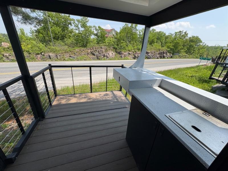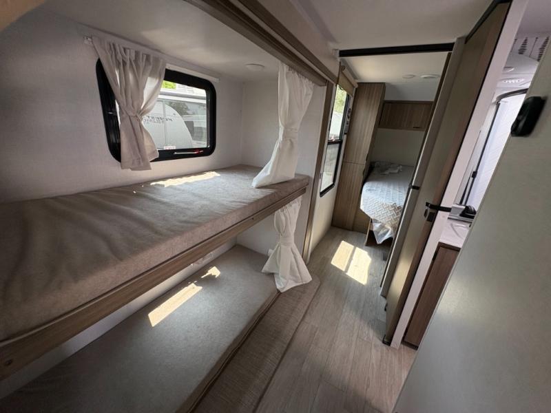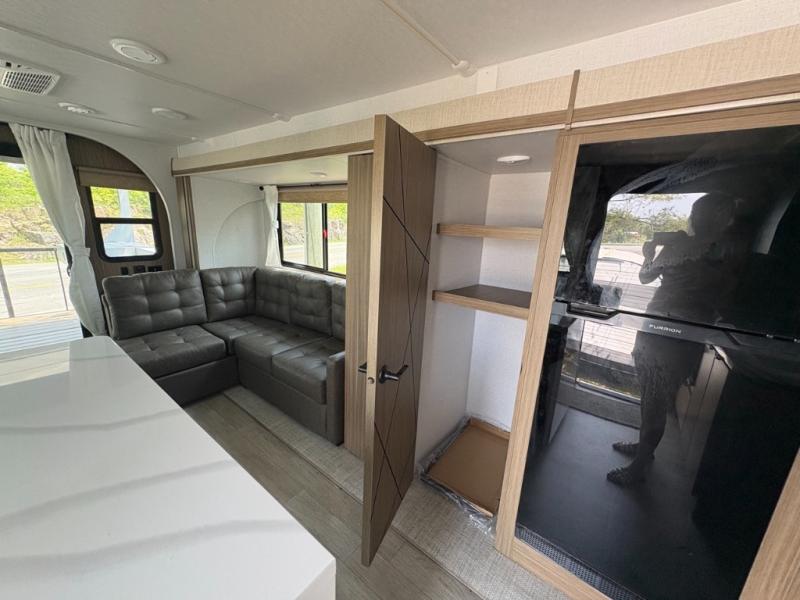 This travel trailer will feel more like home with its rear veranda/porch, dual entry doors, and front private bedroom! There is an outdoor kitchen on the back porch so you can make lunch in the fresh air, and the patio doors lead right into the main living area. Your crew can relax on the L-shaped sofa within the large slide across from the fireplace, which will make your space more cozy. There are also bunk beds with a storage cubby here, along with a pull-out pantry and a closet/pantry, and a refrigerator! A kitchen island with four chairs will provide a place to dine at, although you may just find yourselves out back or under the side awning. You will love having your own space in the private bedroom, and the Versa-Tilt custom king bed will let you sit up in bed to read your book at night.