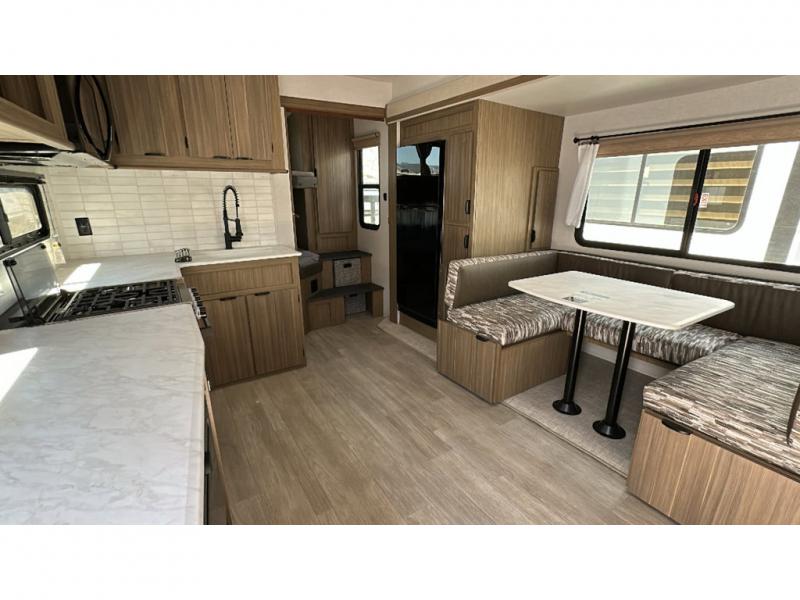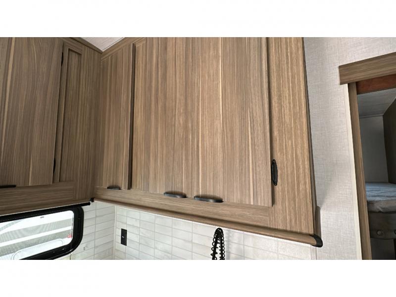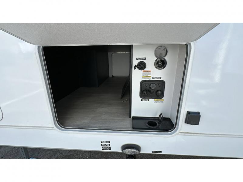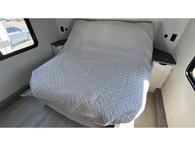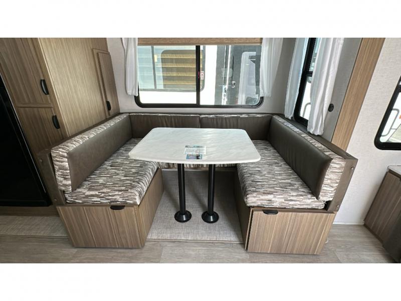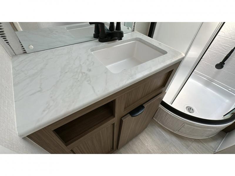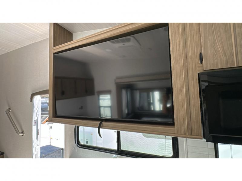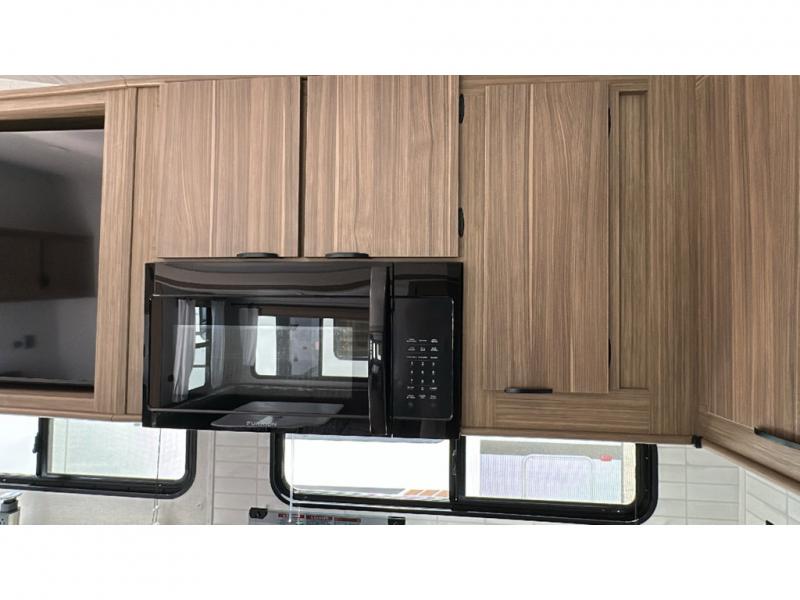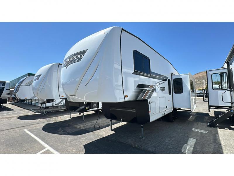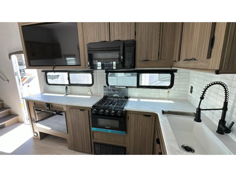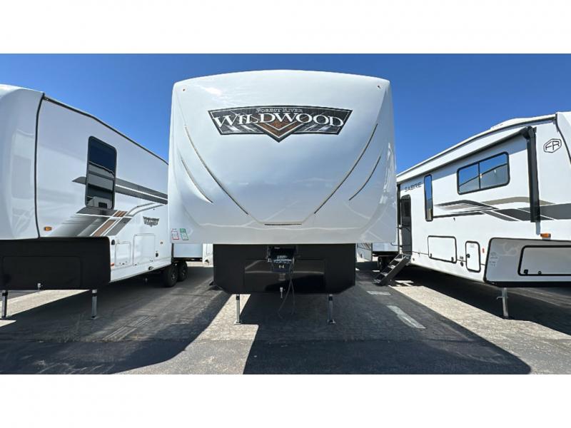 The Wildwood fifth wheels by Forest River feature a wide-body construction and new aluma framed laminated sidewalls for durability, plus rear quick drop stabilizer jacks for easy set up. There are many more new features, including aluminum wheels, heated and enclosed tanks, an LED lighted front cap, and roof ladder prep. The Thermofoil countertops and accent tables inside will make your space feel more like home, and the 60K BTU tankless water heater will provide endless hot showers. These fifth wheels also include a 200W solar panel with a regulator, an LED Smart TV in the living room, outside marine speakers, and an exterior TV backer if you want to add outside entertainment.