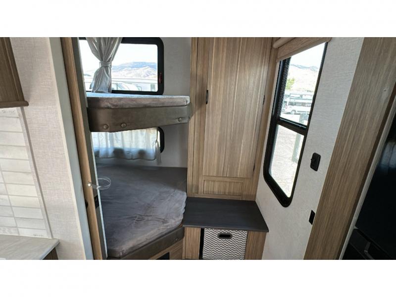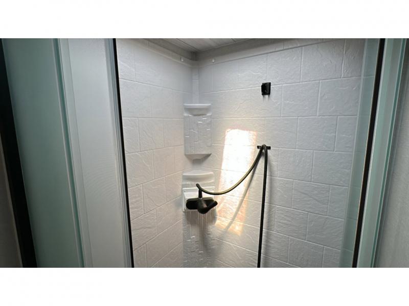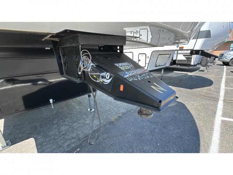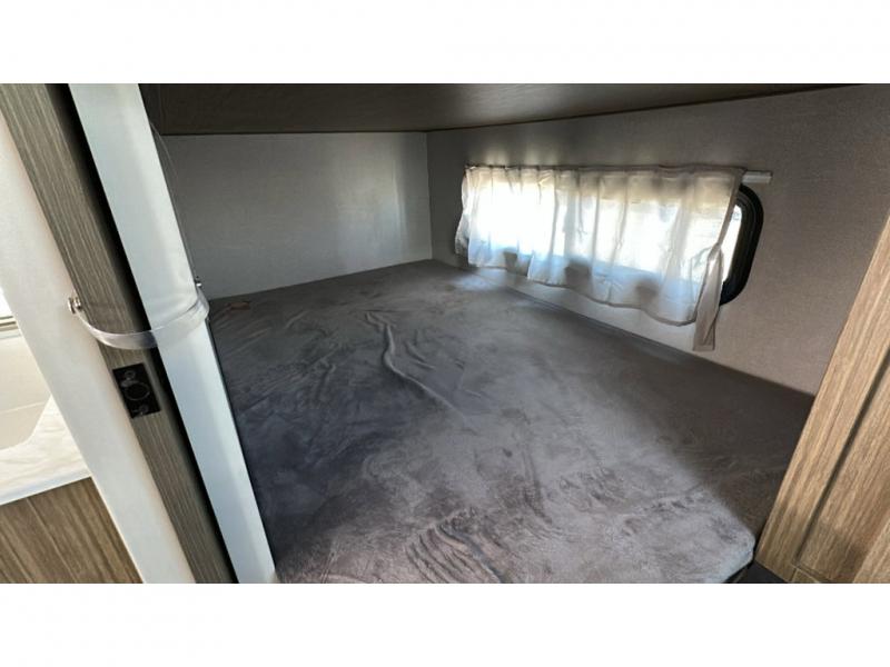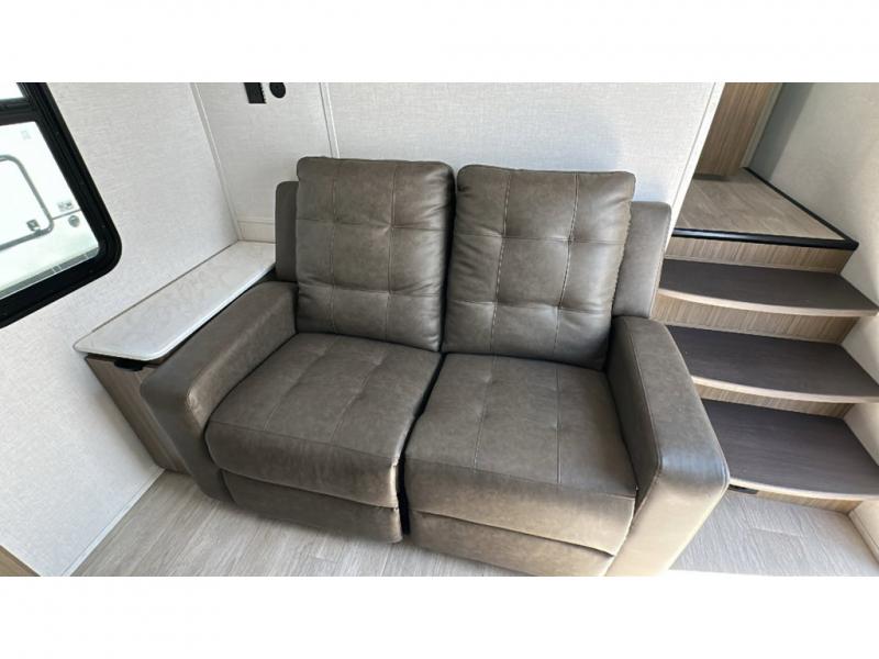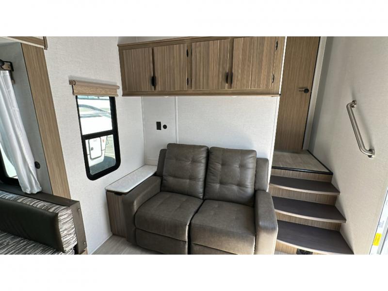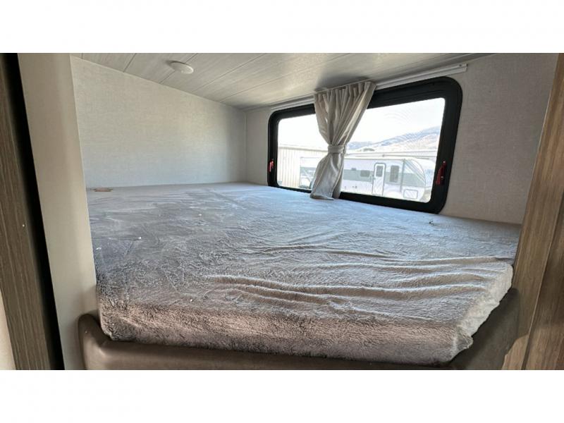 Your whole gang will love this fifth wheel with its double-size bunks in the back with steps and Versa-Tilt custom king bed in the front bedroom. There is also a U-shaped dinette and jackknife sofa that can double as seating and sleeping space. The large slide out will provide more floor space to let the dog stretch out and the fireplace makes this space feel more like home. The chef will love the full kitchen with generous counter space and overhead cabinets, and everyone can stay clean each day by using the full bath!