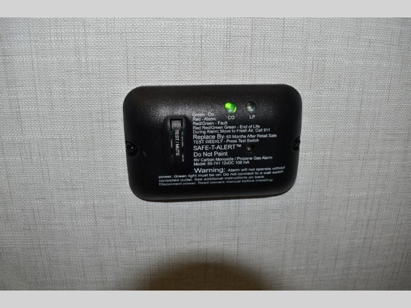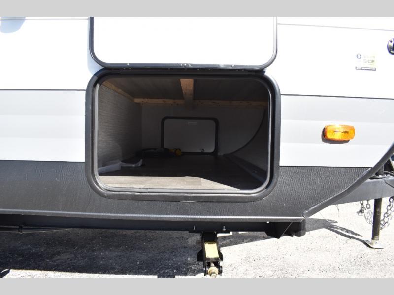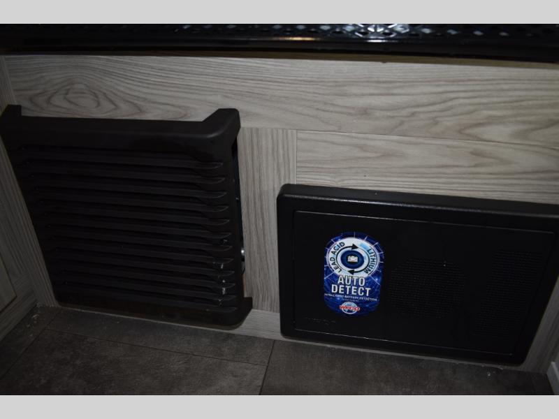 Perfect for your family, this single slide with split bunk and queen bed provides your family comfortable sleeping for four, and the slide adds a bit more interior space in camp. The split bunk is located behind the spice rack door and TV for your entertainment and cooking needs. Speaking of cooking, you can prepare your best home cooked meals with the cooktop, and store any leftovers in the 12V refrigerator. Relax each night in the theater seating and freshen up in the rear corner bathroom each morning which features a skylight over the shower for more natural lighting.