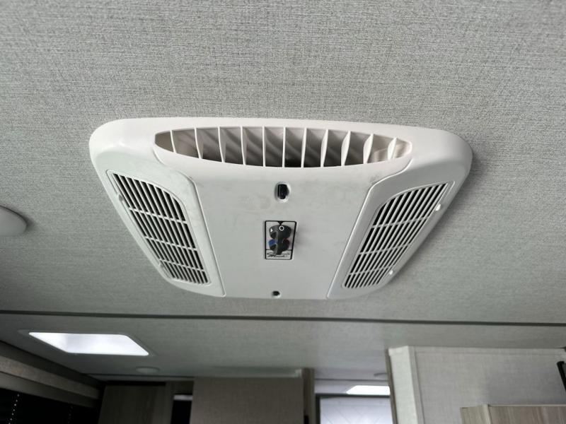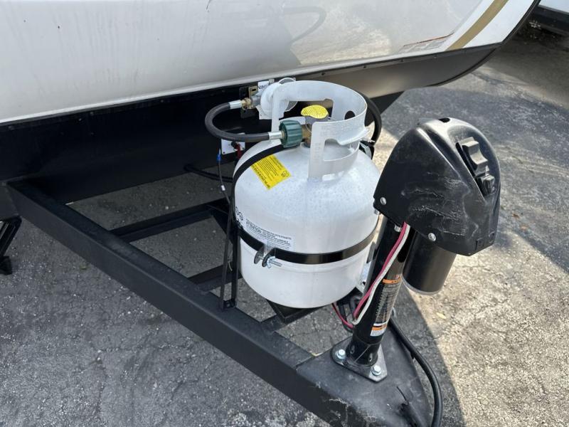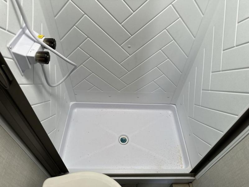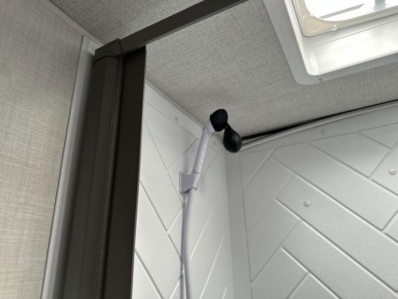 Perfect for your family, this single slide with split bunk and queen bed provides your family comfortable sleeping for four, and the slide adds a bit more interior space in camp. The split bunk is located behind the spice rack door and TV for your entertainment and cooking needs. Speaking of cooking, you can prepare your best home cooked meals with the cooktop, and store any leftovers in the 12V refrigerator. Relax each night in the theater seating and freshen up in the rear corner bathroom each morning which features a skylight over the shower for more natural lighting.