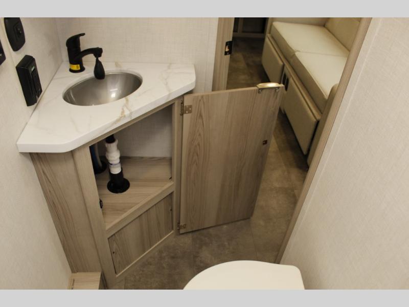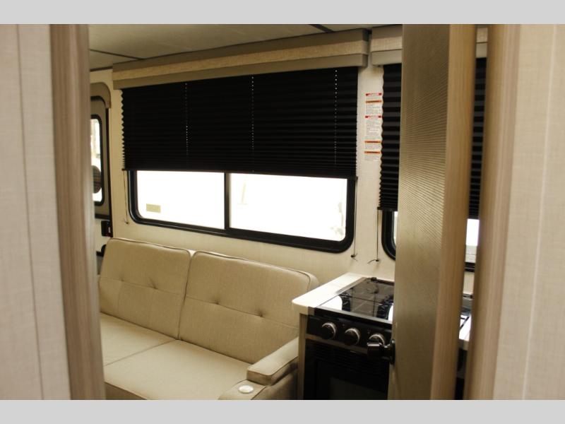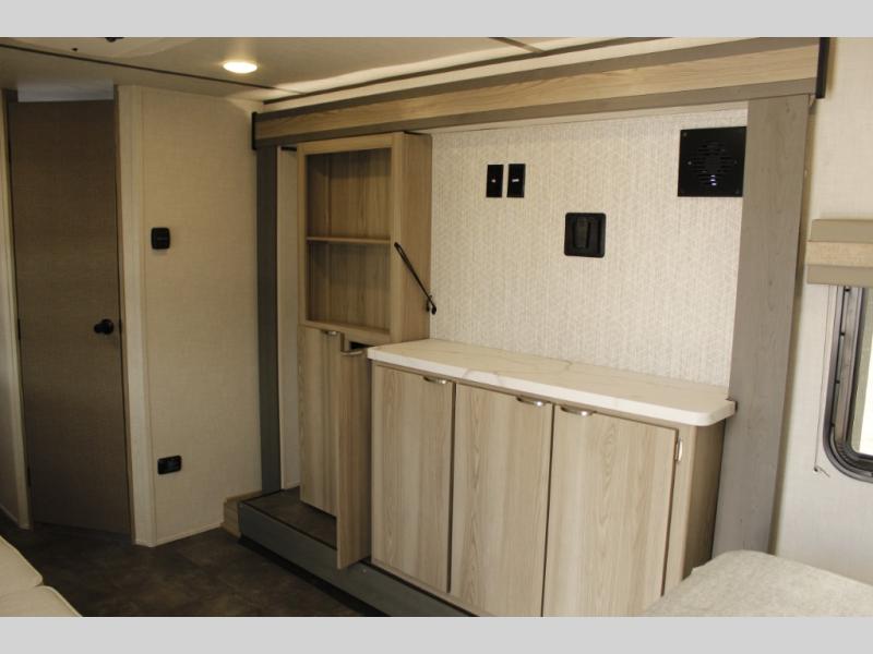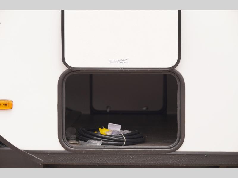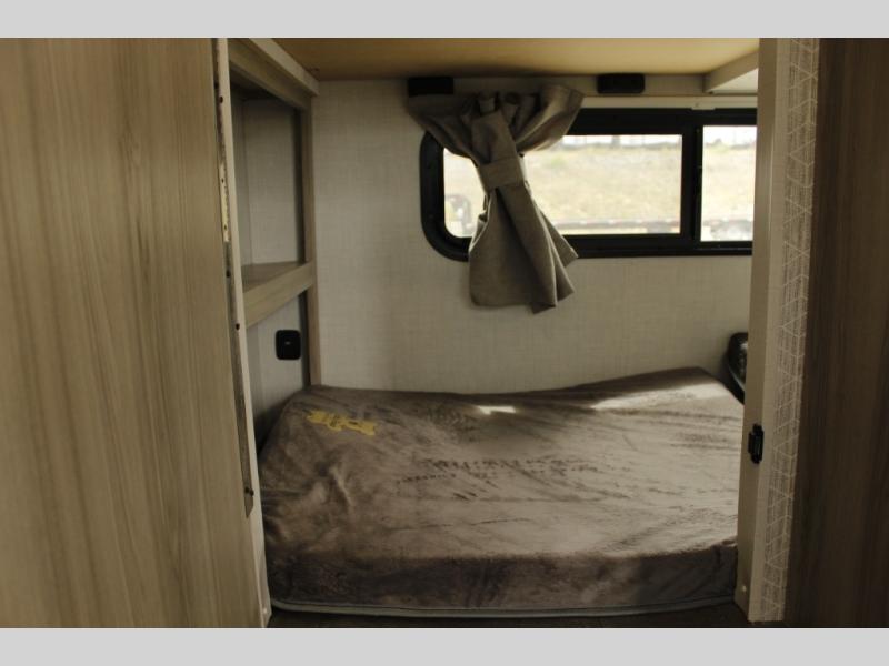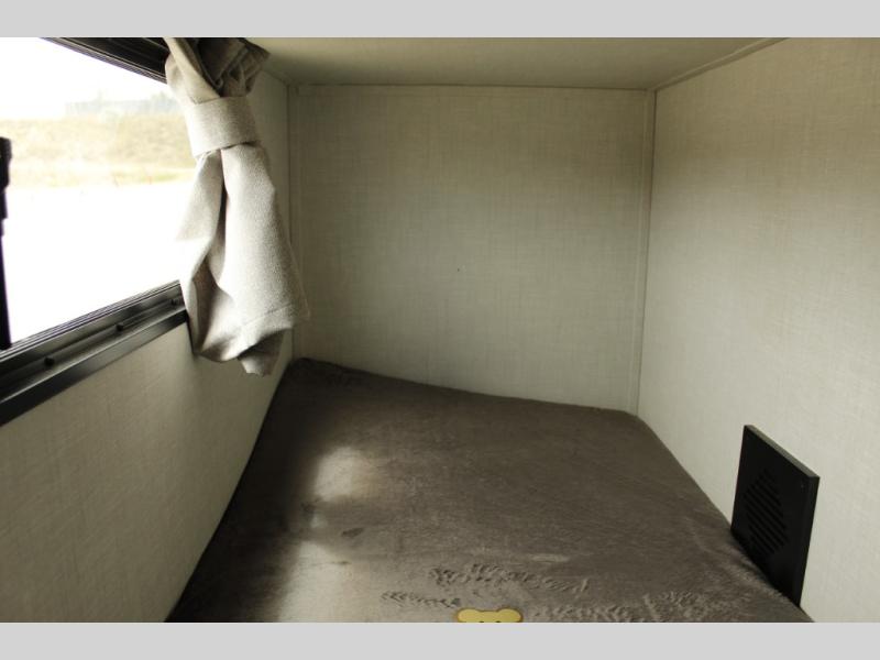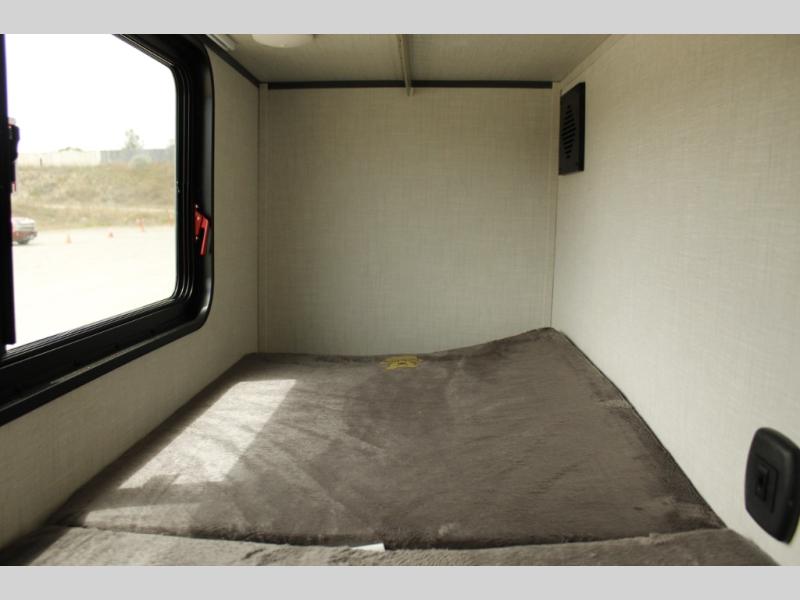 Perfect for your family, this single slide with split bunk and queen bed provides your family comfortable sleeping for four, and the slide adds a bit more interior space in camp. The split bunk is located behind the spice rack door and TV for your entertainment and cooking needs. Speaking of cooking, you can prepare your best home cooked meals with the cooktop, and store any leftovers in the 12V refrigerator. Relax each night in the theater seating and freshen up in the rear corner bathroom each morning which features a skylight over the shower for more natural lighting.