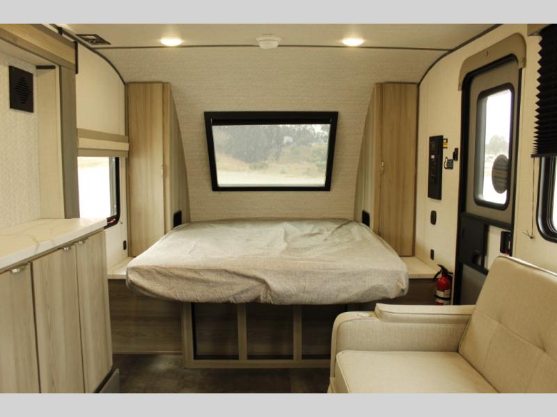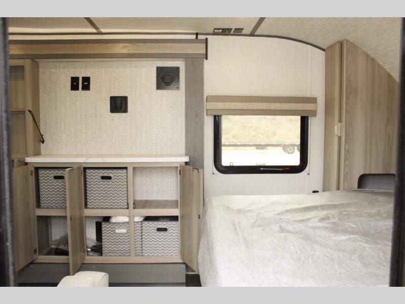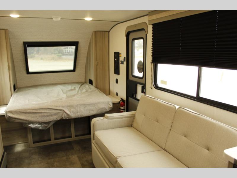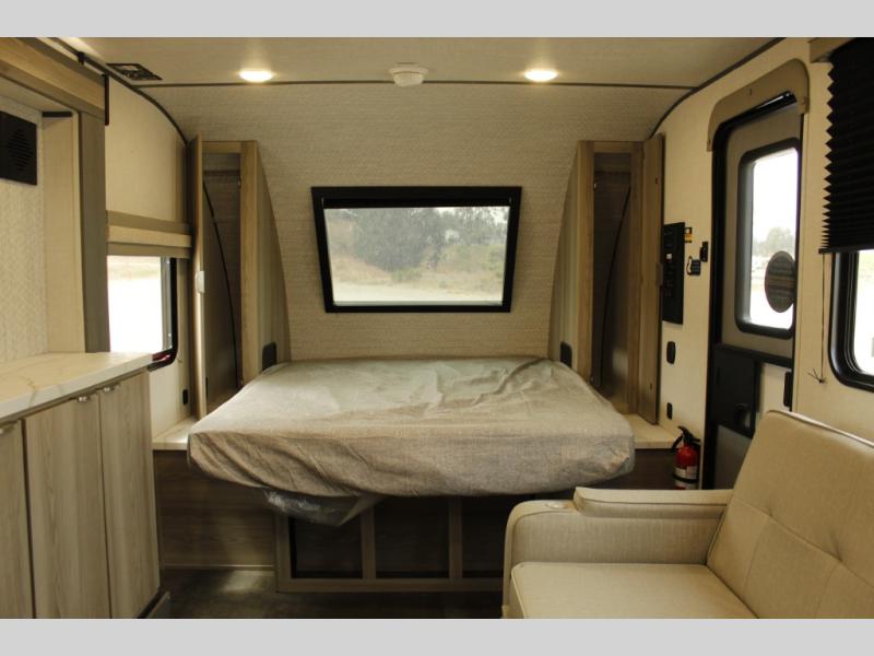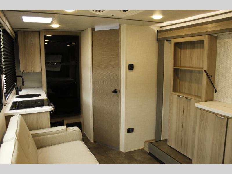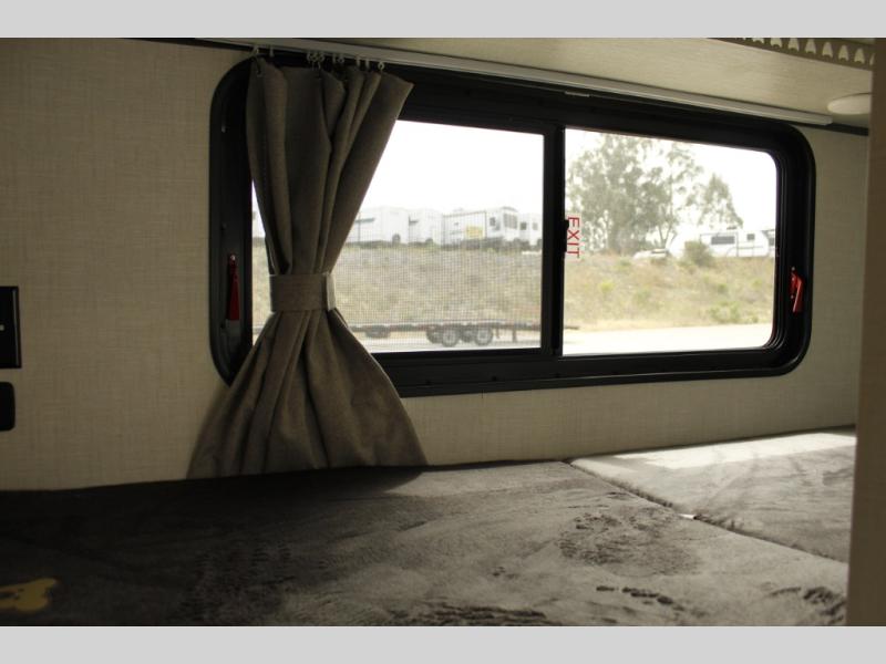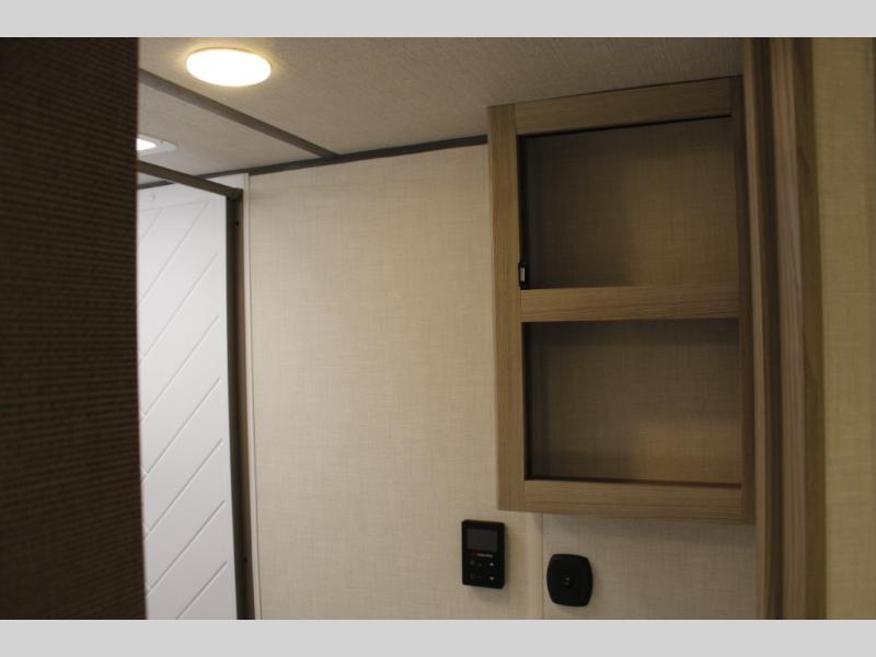 Perfect for your family, this single slide with split bunk and queen bed provides your family comfortable sleeping for four, and the slide adds a bit more interior space in camp. The split bunk is located behind the spice rack door and TV for your entertainment and cooking needs. Speaking of cooking, you can prepare your best home cooked meals with the cooktop, and store any leftovers in the 12V refrigerator. Relax each night in the theater seating and freshen up in the rear corner bathroom each morning which features a skylight over the shower for more natural lighting.