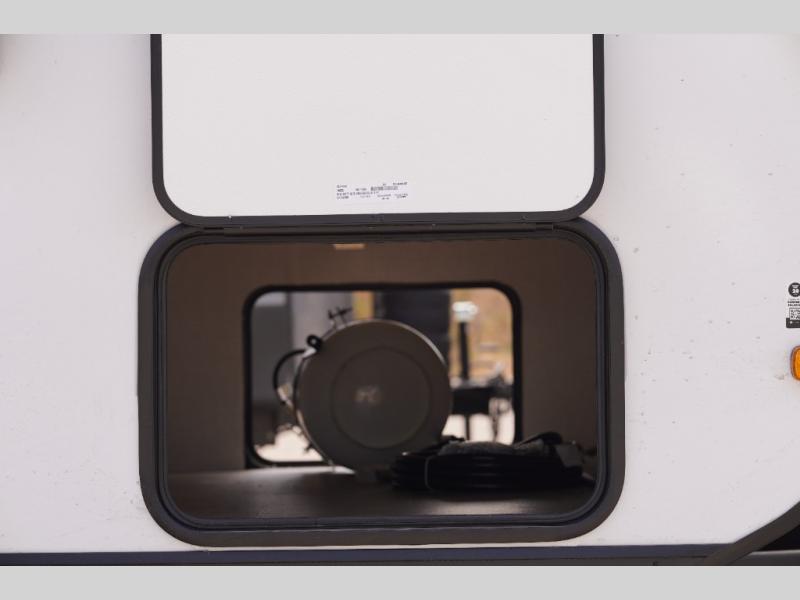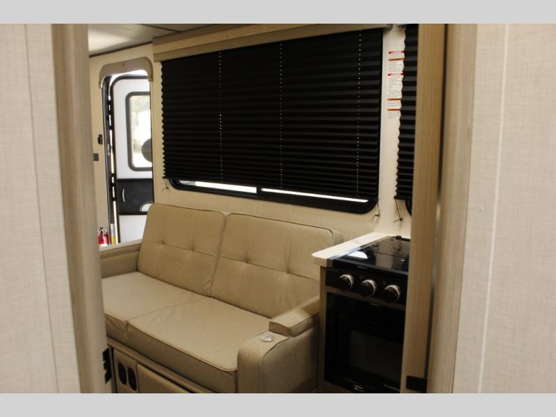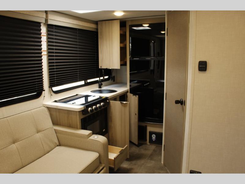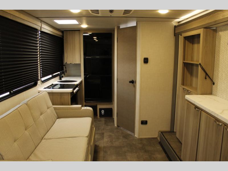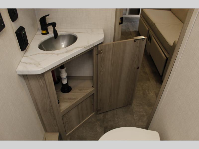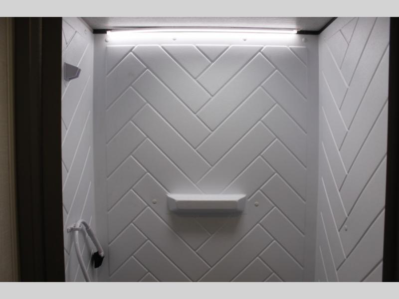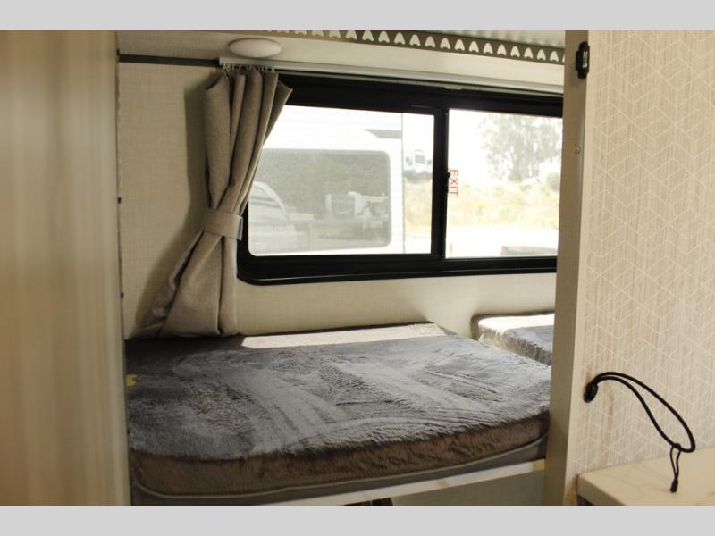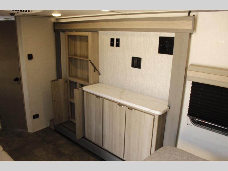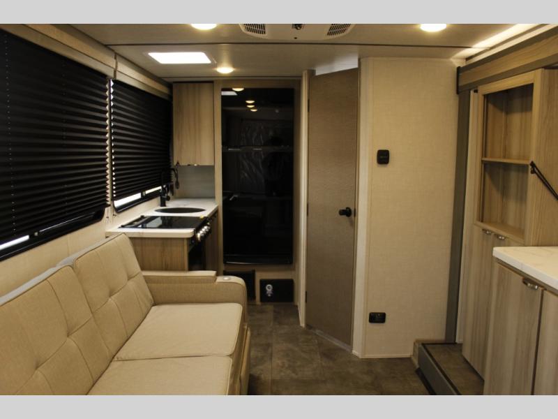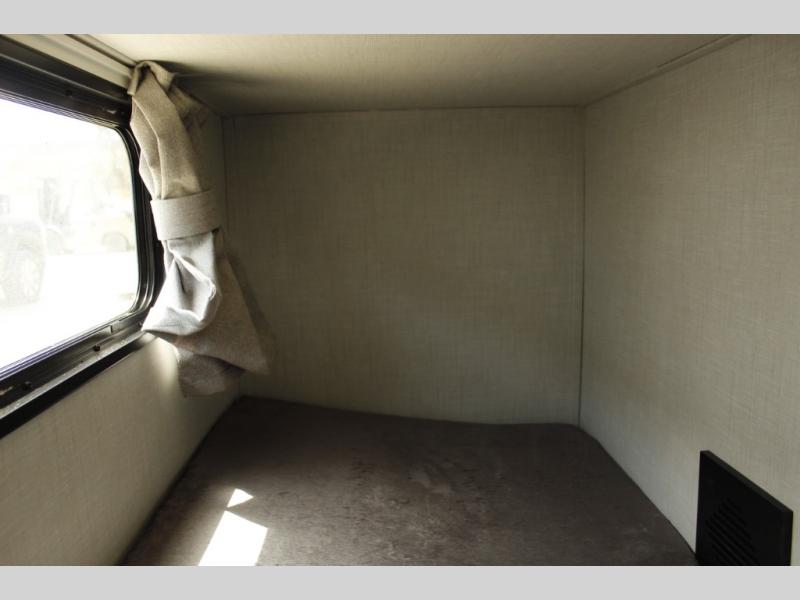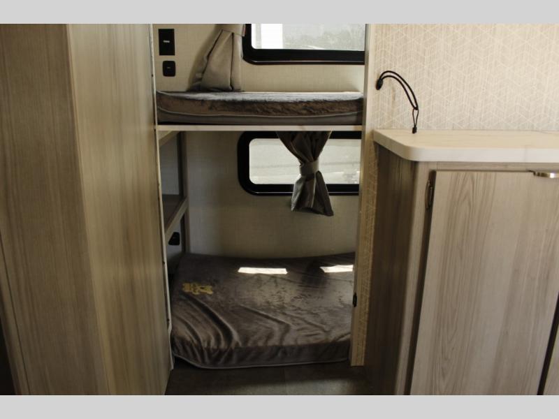 Perfect for your family, this single slide with split bunk and queen bed provides your family comfortable sleeping for four, and the slide adds a bit more interior space in camp. The split bunk is located behind the spice rack door and TV for your entertainment and cooking needs. Speaking of cooking, you can prepare your best home cooked meals with the cooktop, and store any leftovers in the 12V refrigerator. Relax each night in the theater seating and freshen up in the rear corner bathroom each morning which features a skylight over the shower for more natural lighting.
