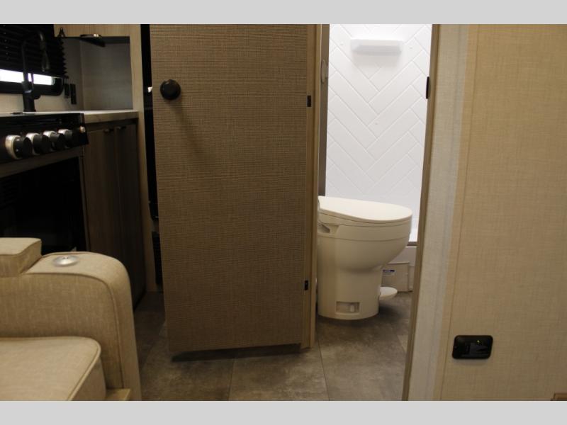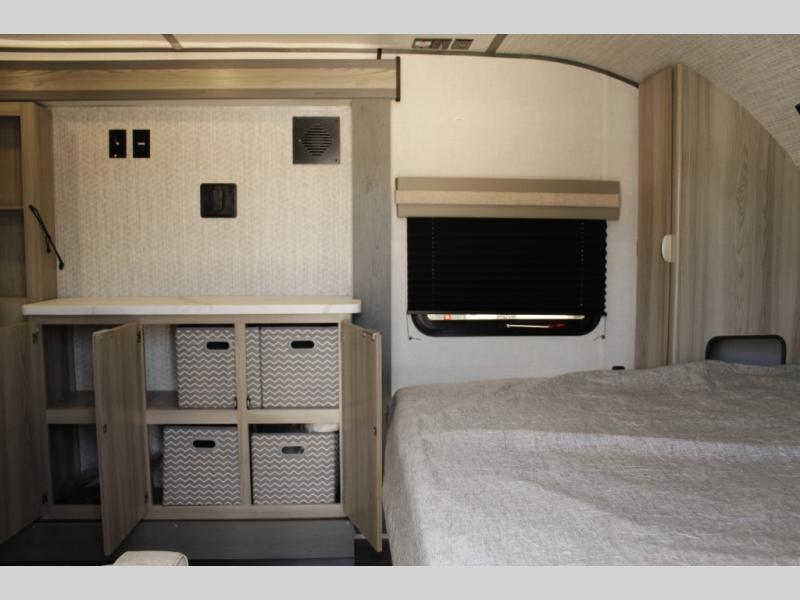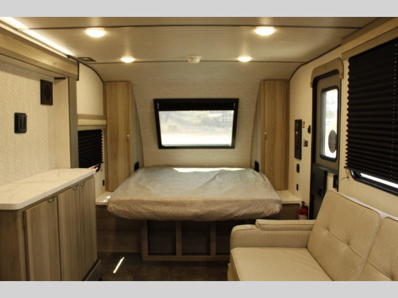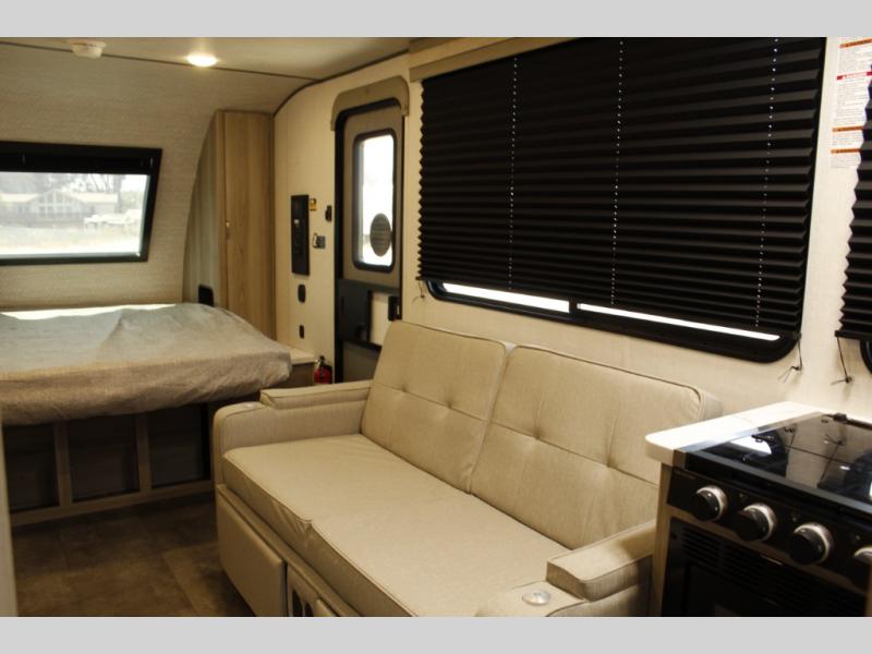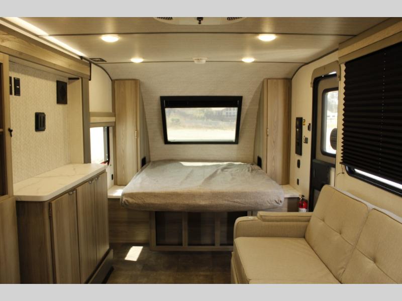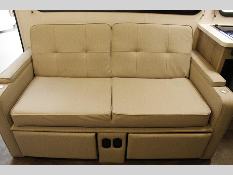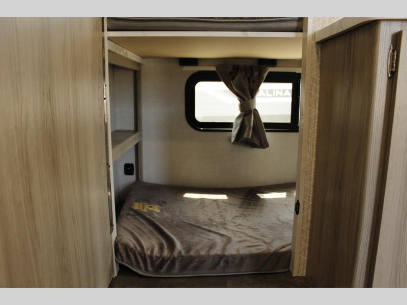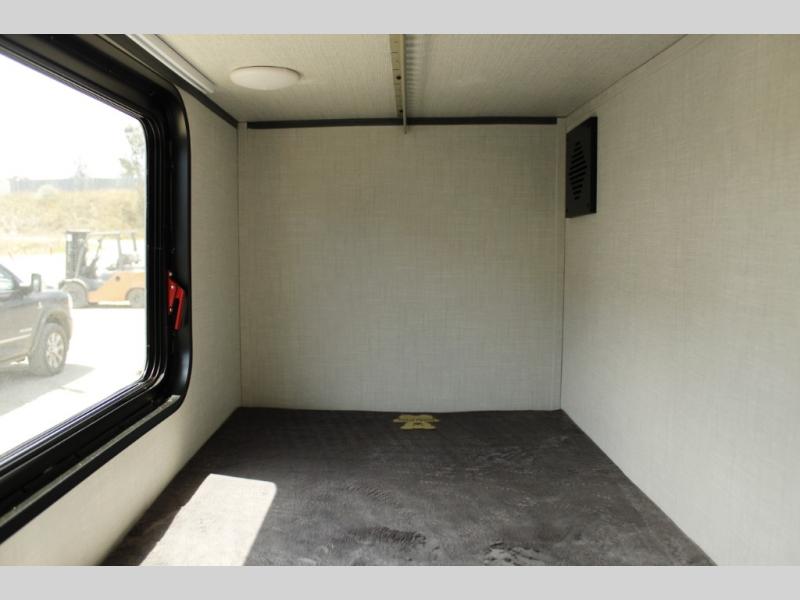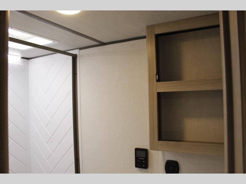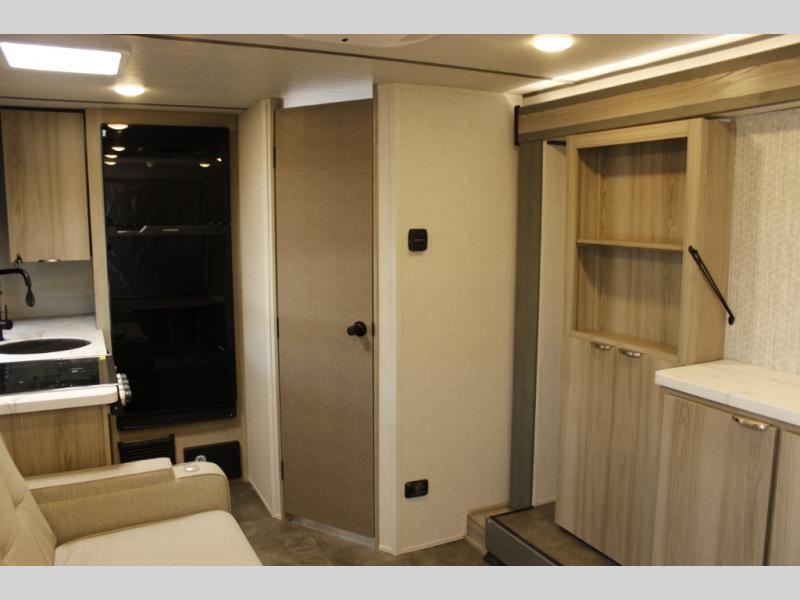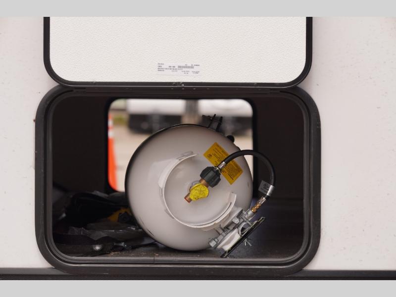 Perfect for your family, this single slide with split bunk and queen bed provides your family comfortable sleeping for four, and the slide adds a bit more interior space in camp. The split bunk is located behind the spice rack door and TV for your entertainment and cooking needs. Speaking of cooking, you can prepare your best home cooked meals with the cooktop, and store any leftovers in the 12V refrigerator. Relax each night in the theater seating and freshen up in the rear corner bathroom each morning which features a skylight over the shower for more natural lighting.
