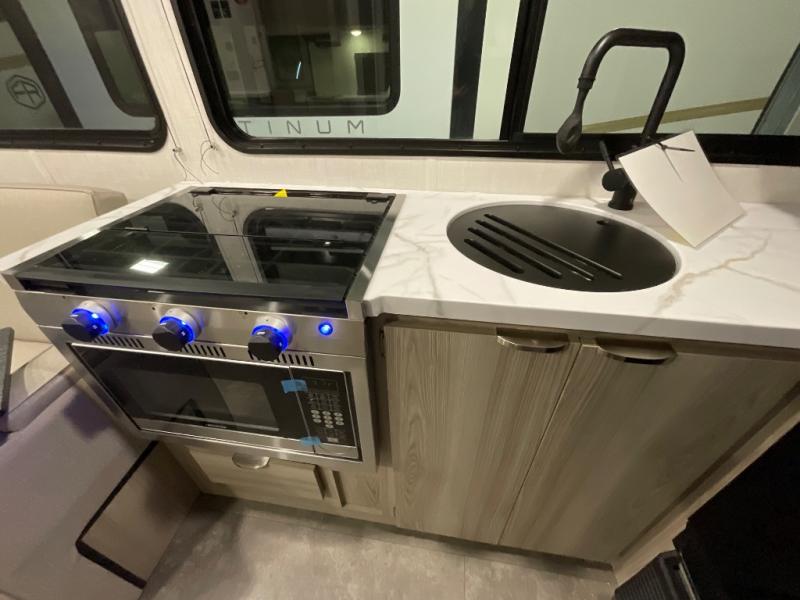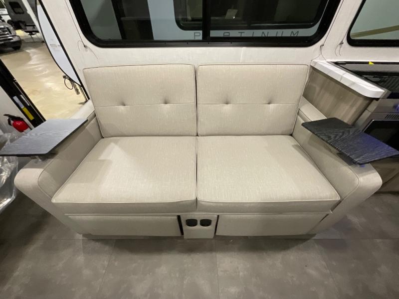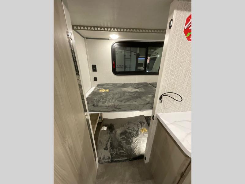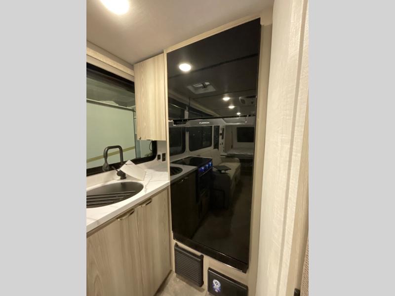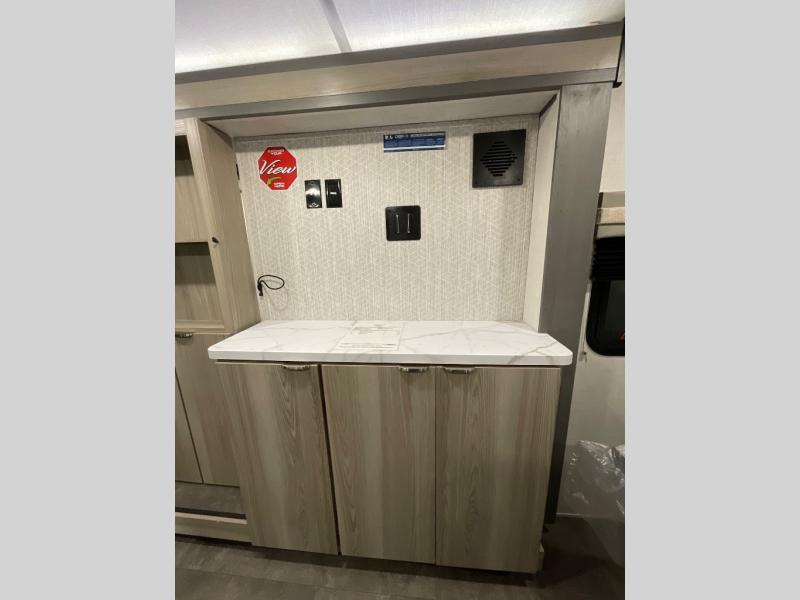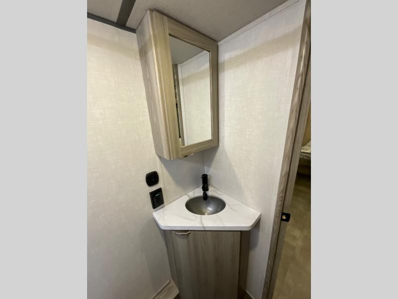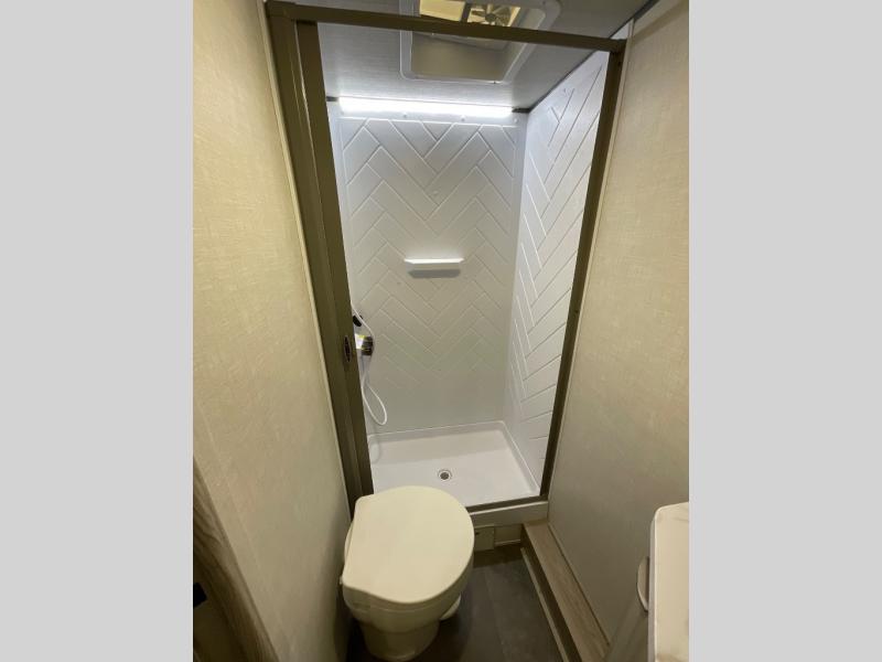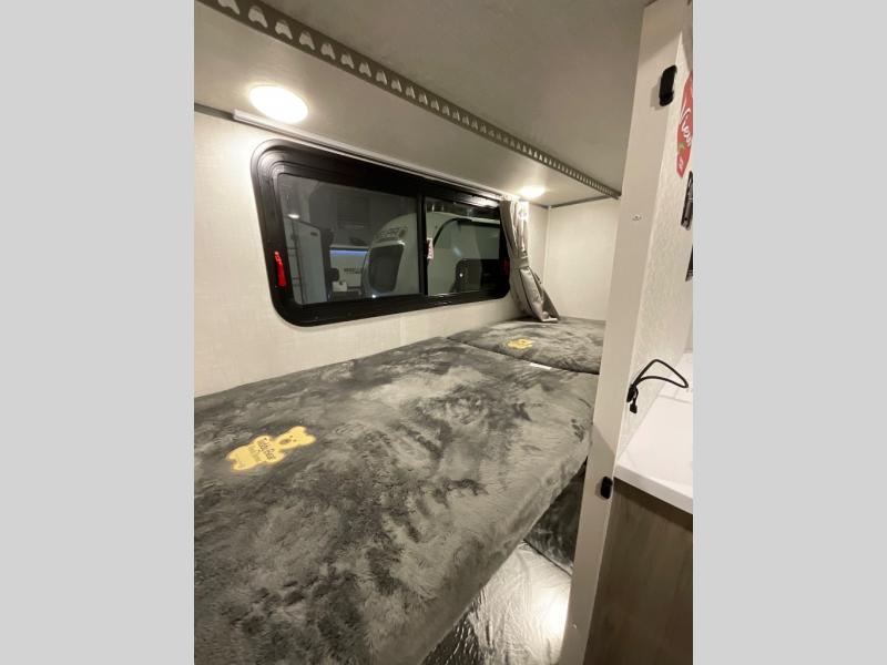 Perfect for your family, this single slide with split bunk and queen bed provides your family comfortable sleeping for four, and the slide adds a bit more interior space in camp. The split bunk is located behind the spice rack door and TV for your entertainment and cooking needs. Speaking of cooking, you can prepare your best home cooked meals with the cooktop, and store any leftovers in the dual swinging 12V refrigerator. Relax each night in the theater seating and freshen up in the rear corner bathroom each morning which features a skylight over the shower for more natural lighting.
