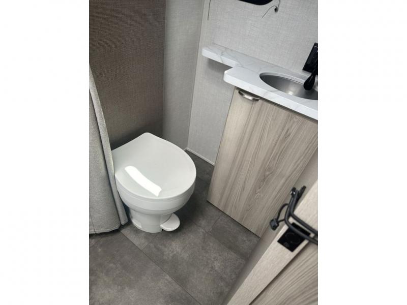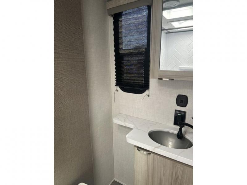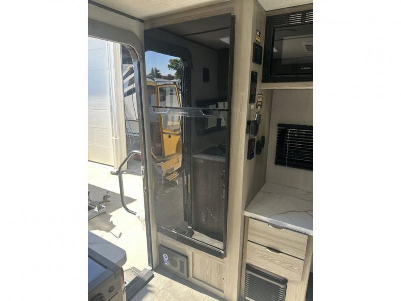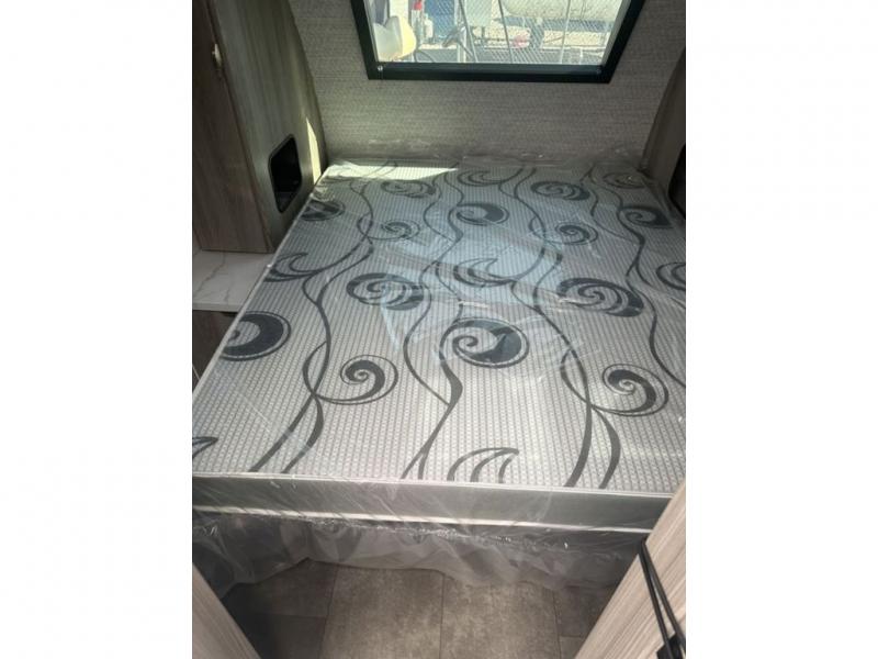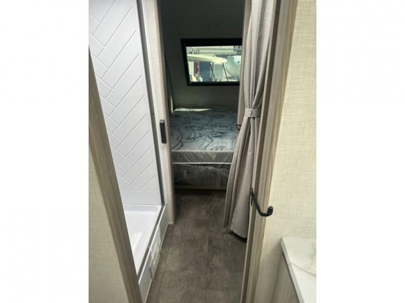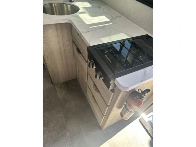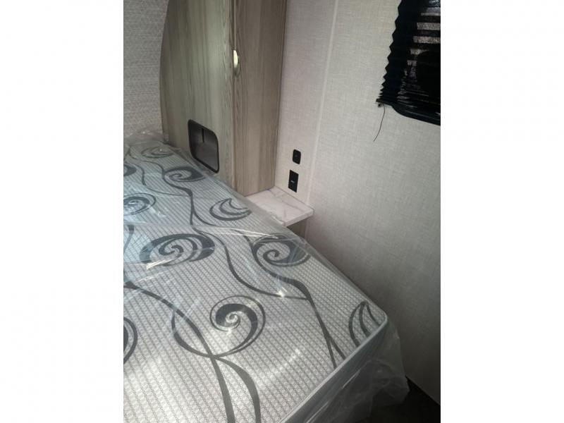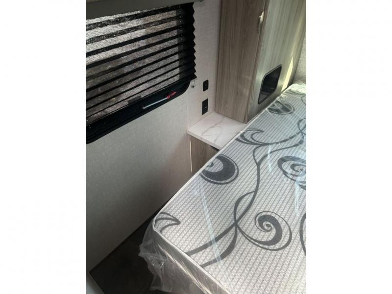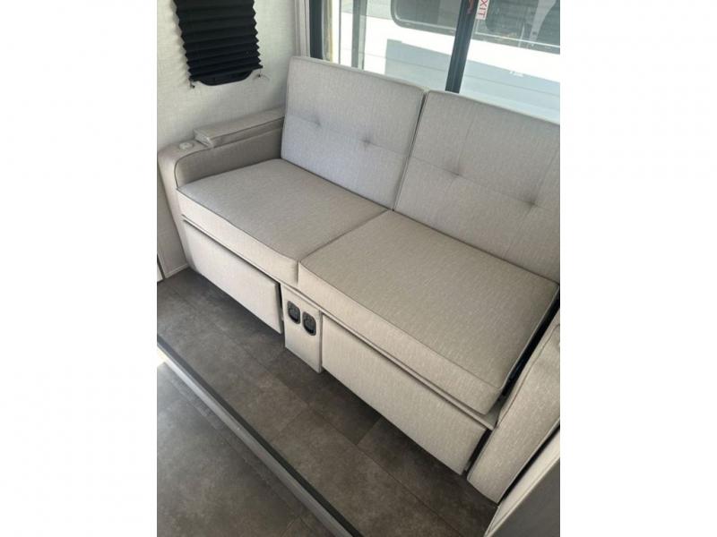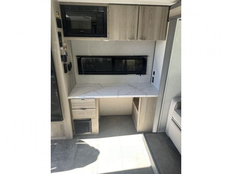 You're going to love every minute spent in this couple's trailer. The queen bed in the front private bedroom will provide a great night's rest, and there are dual wardrobes to easily get dressed in the morning. Head to the kitchen through the bath, then prepare eggs and bacon on the two burner cooktop. There is theater seating here to enjoy your coffee at each morning, or you may want to get some work done at the mobile workstation!
