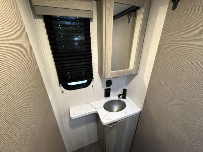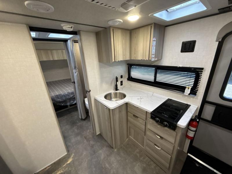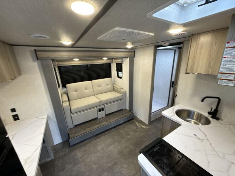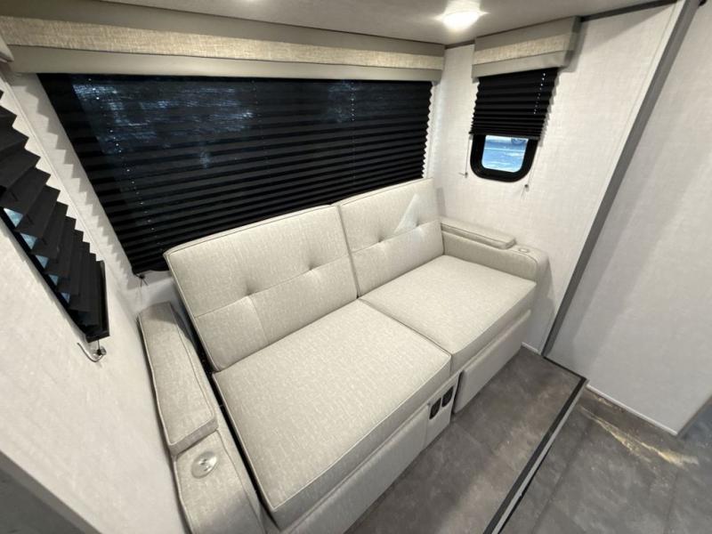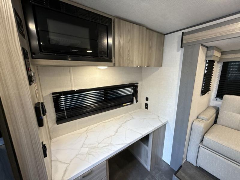 You're going to love every minute spent in this couple's trailer. The queen bed in the front private bedroom will provide a great night's rest, and there are dual wardrobes to easily get dressed in the morning. Head to the kitchen through the bath, then prepare eggs and bacon on the two burner cooktop. There is theater seating here to enjoy your coffee at each morning, or you may want to get some work done at the mobile workstation!