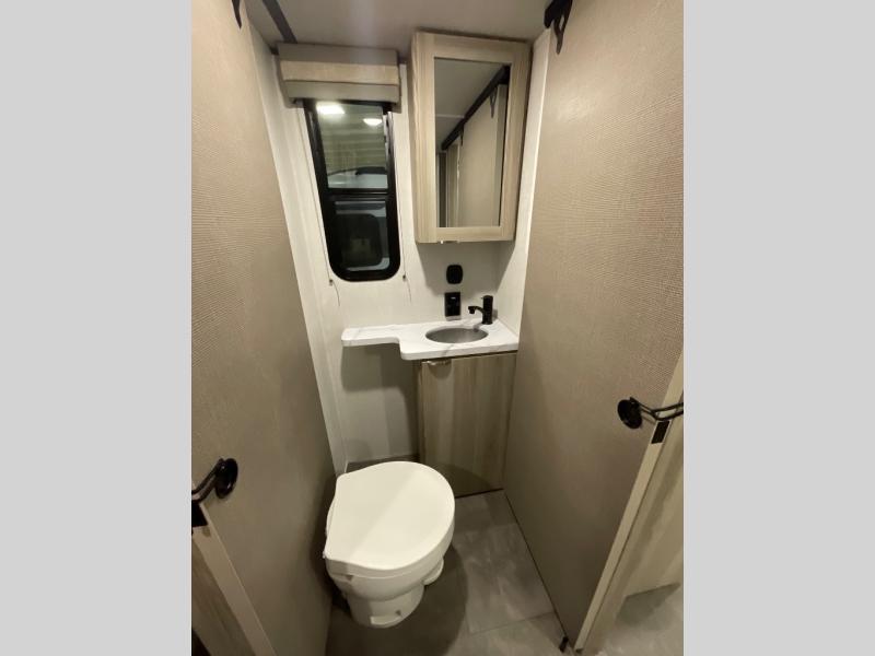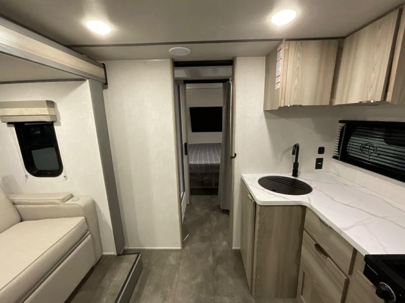You're going to love every minute spent in this couple's trailer. The queen bed in the front private bedroom will provide a great night's rest, and there are dual wardrobes to easily get dressed in the morning. Head to the kitchen through the bath, then prepare eggs and bacon on the two burner cooktop. There is theater seating here to enjoy your coffee at each morning, or you may want to get some work done at the mobile station!