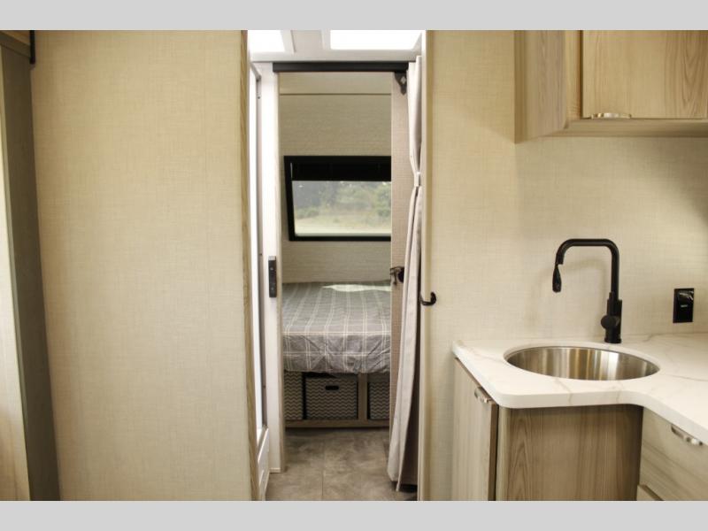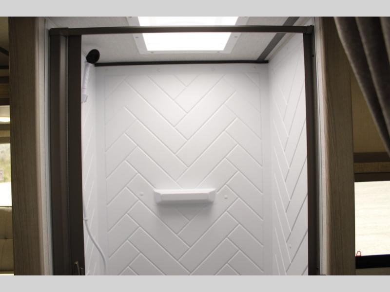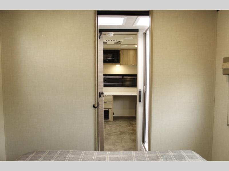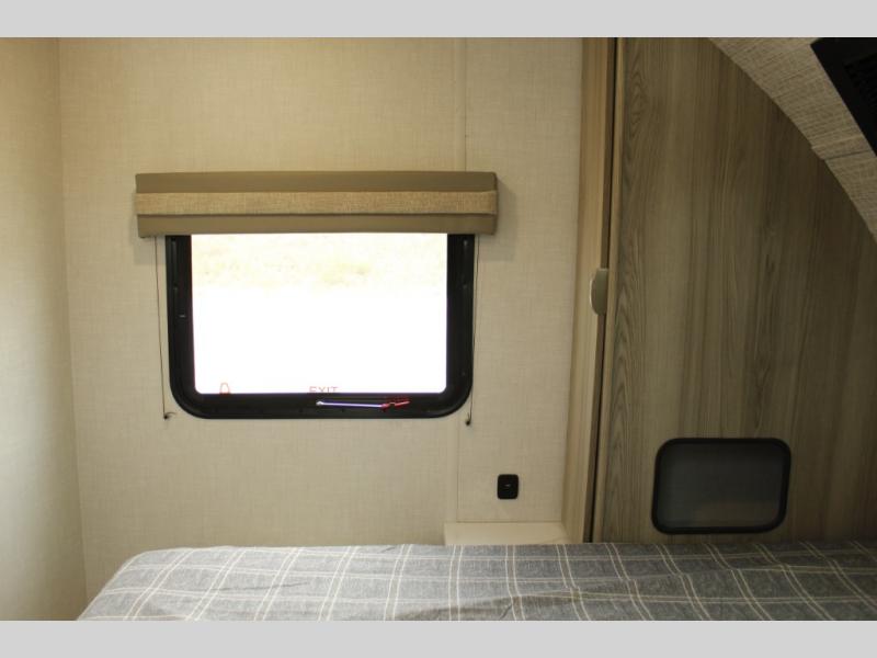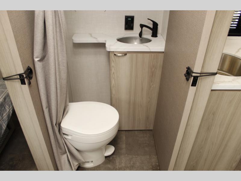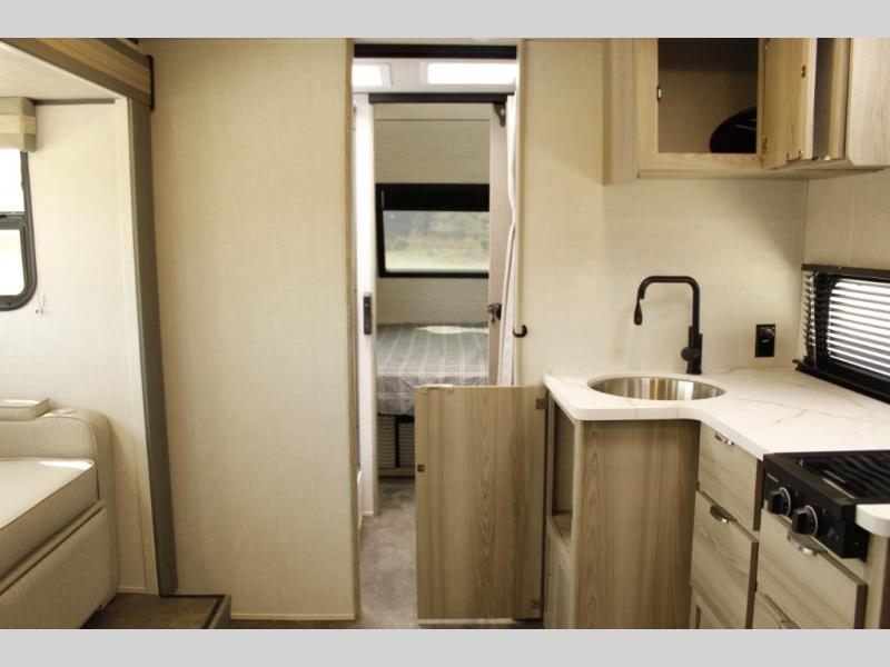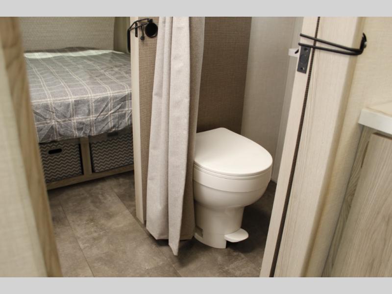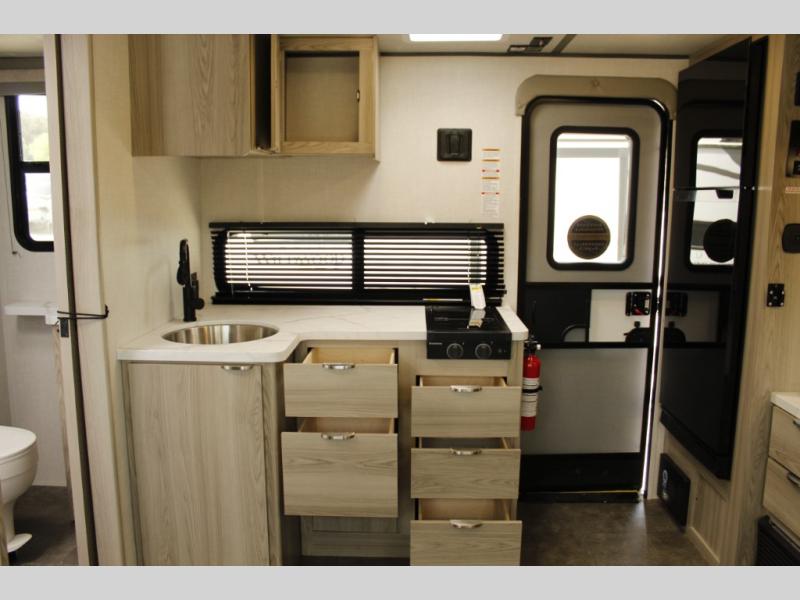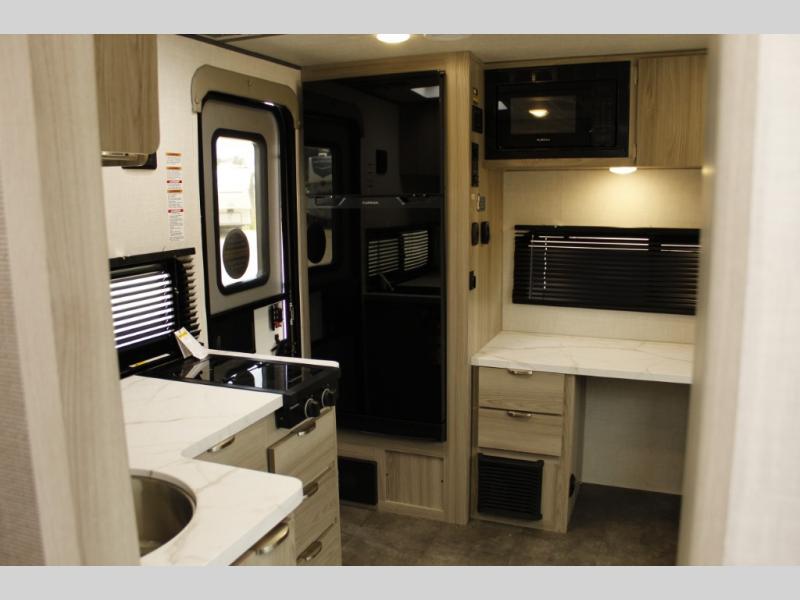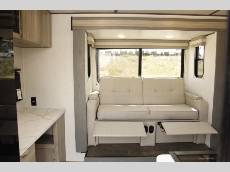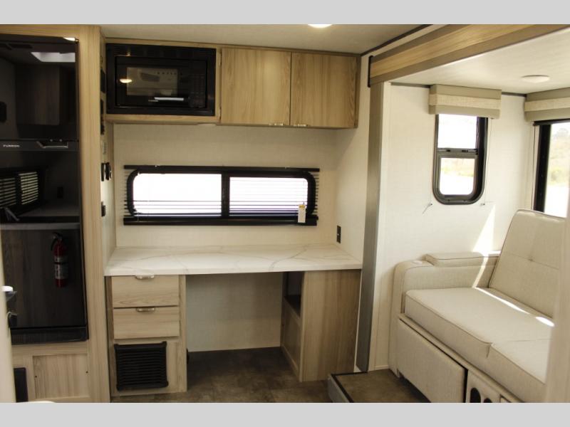 You're going to love every minute spent in this couple's trailer. The queen bed in the front private bedroom will provide a great night's rest, and there are dual wardrobes to easily get dressed in the morning. Head to the kitchen through the bath, then prepare eggs and bacon on the two burner cooktop. There is theater seating here to enjoy your coffee at each morning, or you may want to get some work done at the mobile workstation!