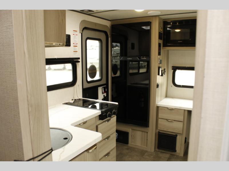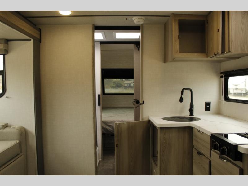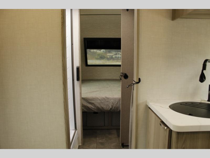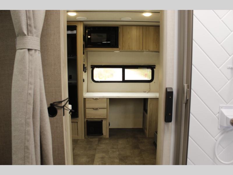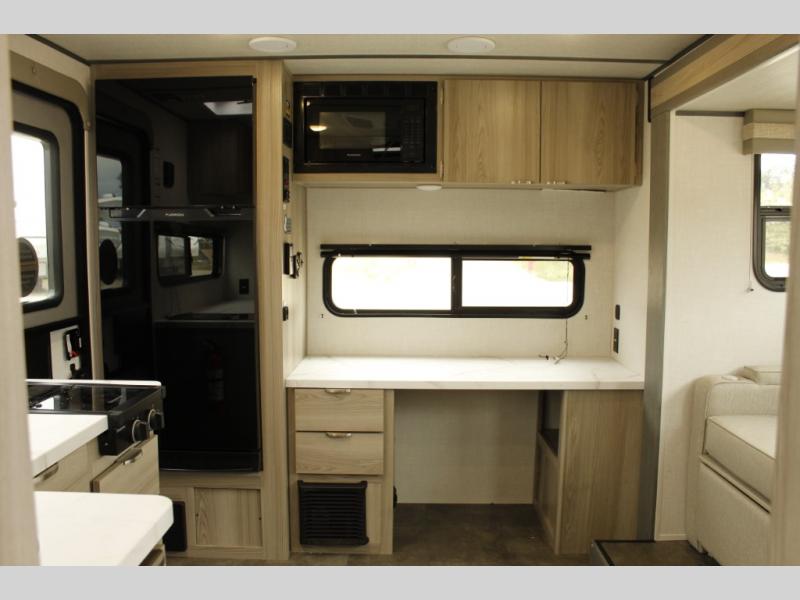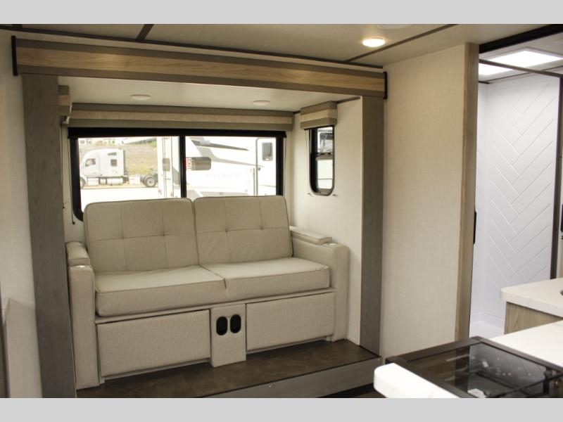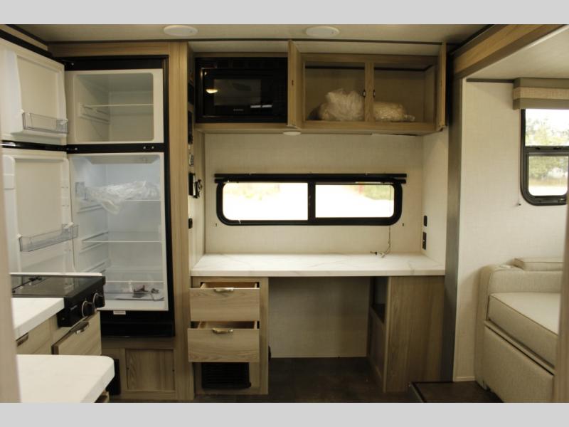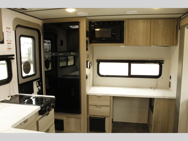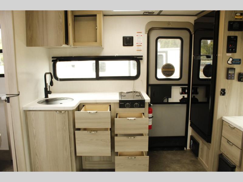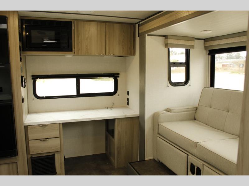 You're going to love every minute spent in this couple's trailer. The queen bed in the front private bedroom will provide a great night's rest, and there are dual wardrobes to easily get dressed in the morning. Head to the kitchen through the bath, then prepare eggs and bacon on the two burner cooktop. There is theater seating here to enjoy your coffee at each morning, or you may want to get some work done at the mobile workstation!