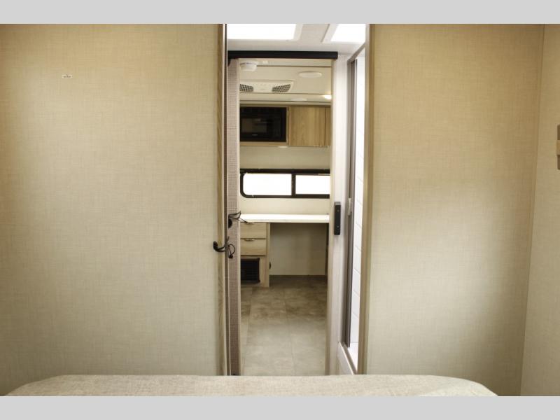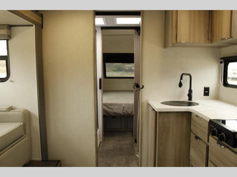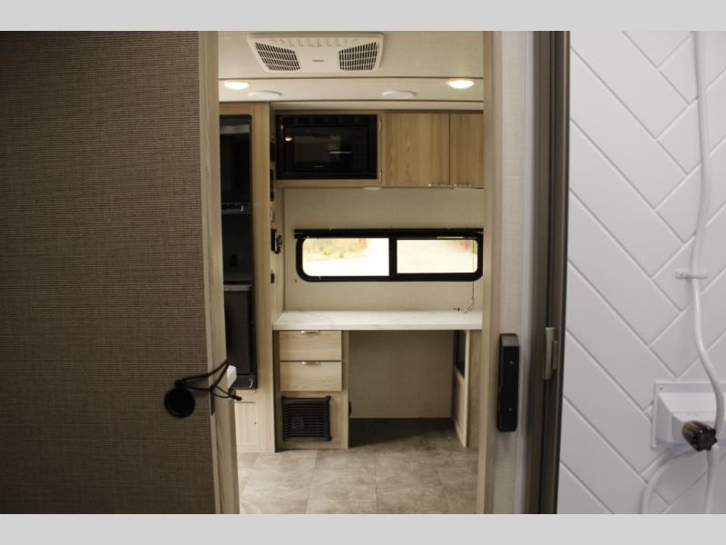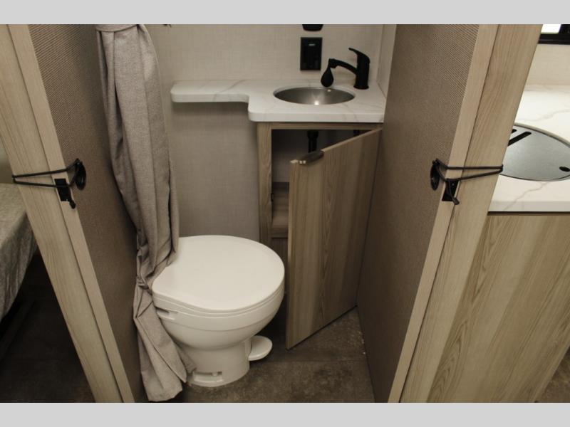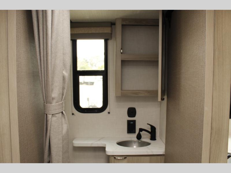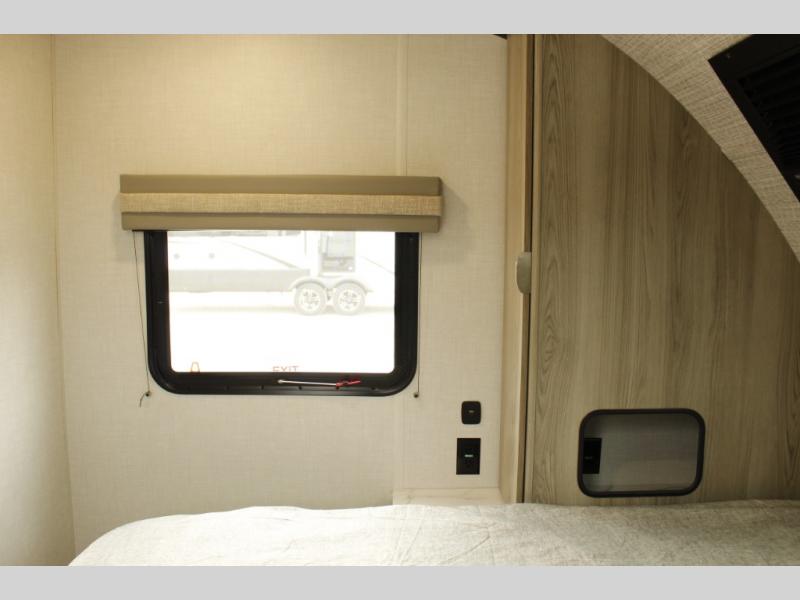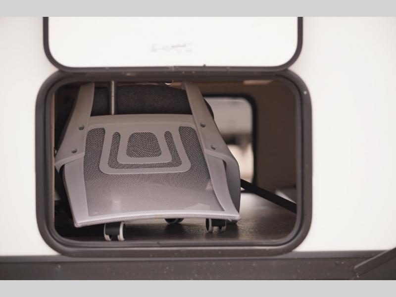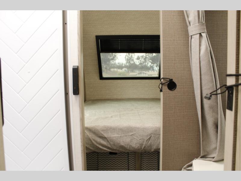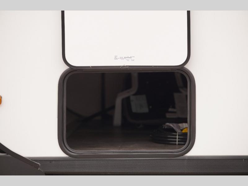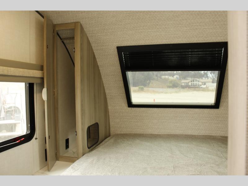 You're going to love every minute spent in this couple's trailer. The queen bed in the front private bedroom will provide a great night's rest, and there are dual wardrobes to easily get dressed in the morning. Head to the kitchen through the bath, then prepare eggs and bacon on the two burner cooktop. There is theater seating here to enjoy your coffee at each morning, or you may want to get some work done at the mobile workstation!