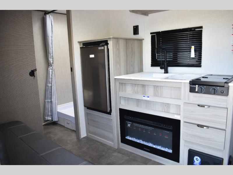 This Limited Edition Wildwood FSX travel trailer is the perfect couples unit! Included you will find a front queen bed with dual wardrobes, and a sofa with overhead storage for seating. Extra thick luxury vinyl flooring is comfortable underfoot and easy to keep clean. The exterior storage has an oversized door for storage so you can fit those bigger items. The Limited Edition Camp Ready package includes a 6 gallon DSI water heater, a powder coated I-beam chassis, manual stabilizer jacks, and more!
