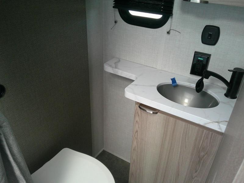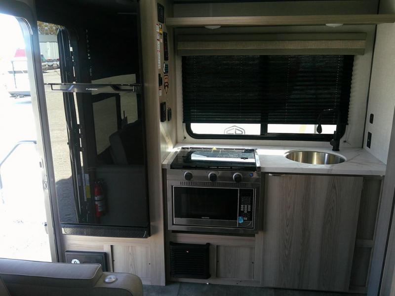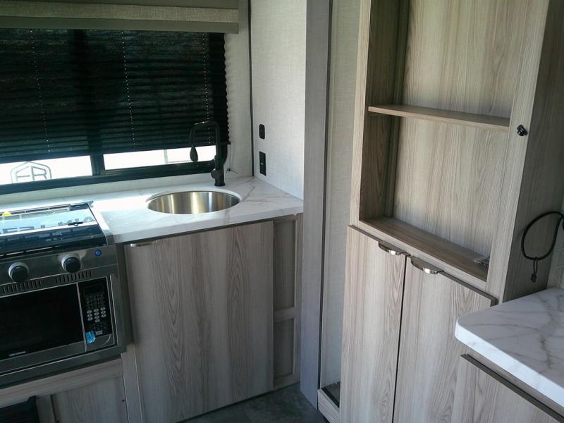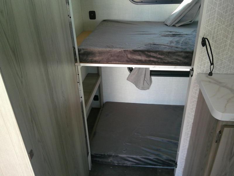 Versatility is found throughout this travel trailer! The front two twin beds can convert into a king bed for comfortable sleeping at night, plus there is a split bunk bed slide for an additional sleeping space. The bunk bed is located behind the spice rack door and TV for your entertainment and cooking needs. Speaking of cooking, you can prepare your best home cooked meals with the cooktop and store any leftovers in the dual swinging 12V refrigerator. Relax each night in the theater seating and freshen up in the walk-through bathroom each morning.