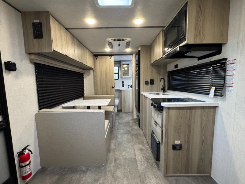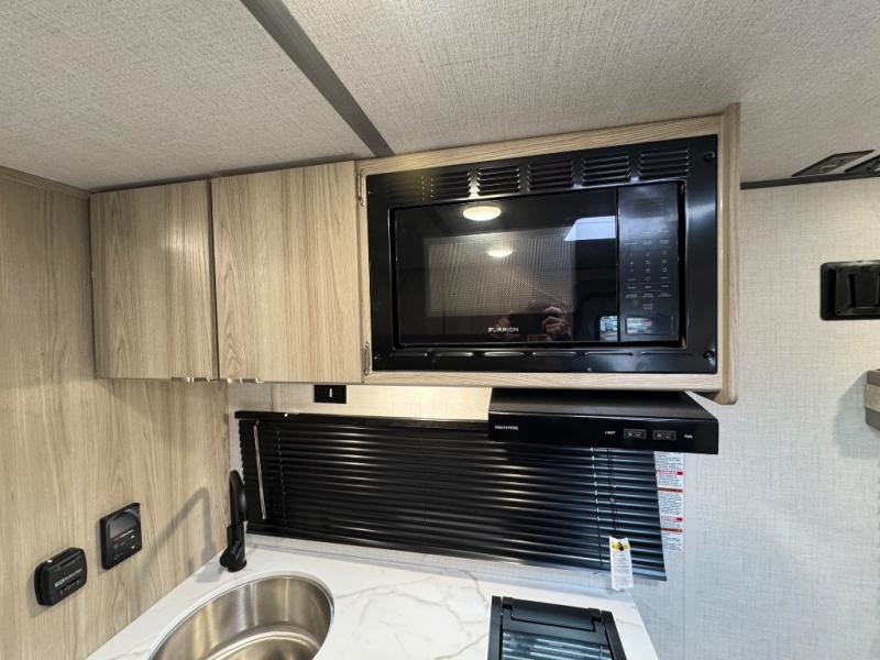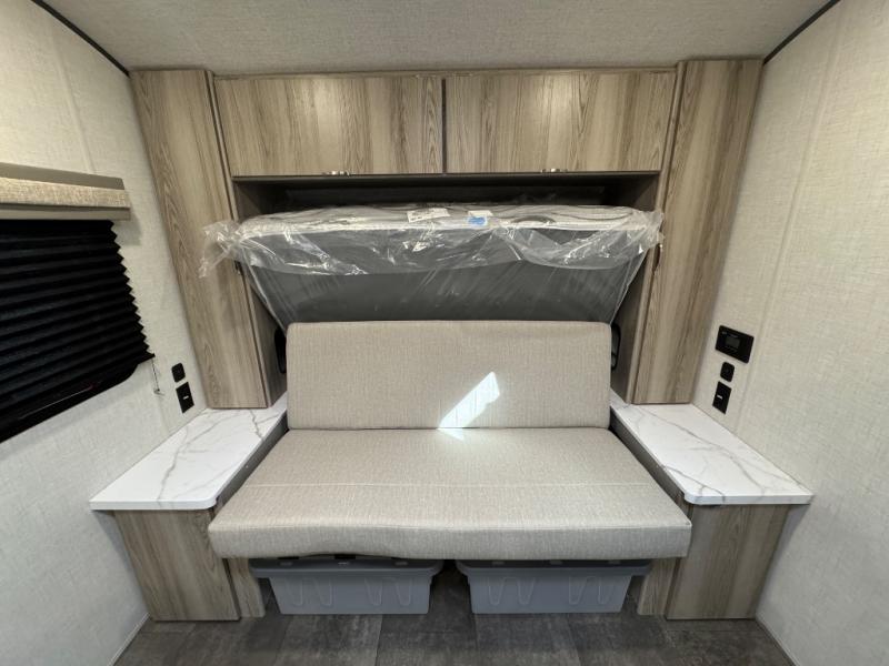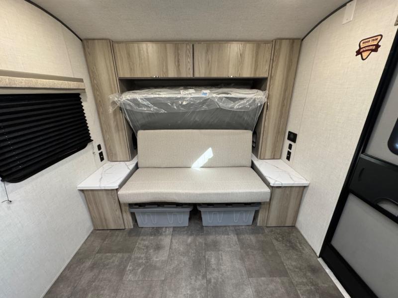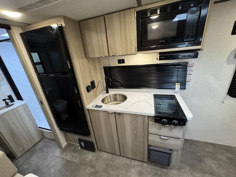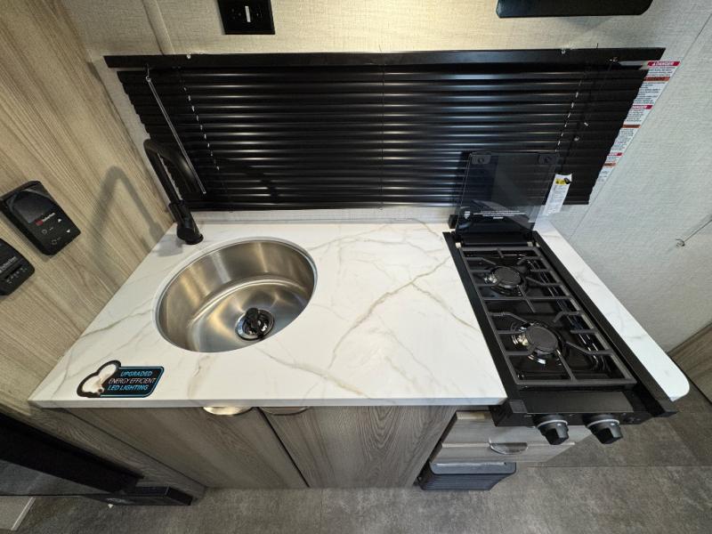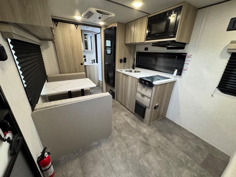 This travel trailer with a full rear bath and versatile sleeping space is your ticket to fun and adventure. While you're putting out the 12' power awning, you can grab the lawn chairs from the full pass-through storage. There is a two burner cooktop and a microwave oven to prepare your meals in, and a booth dinette to dine at. You'll love the RV queen Murphy bed to sleep on at night, and the sofa with storage to relax on during the day!